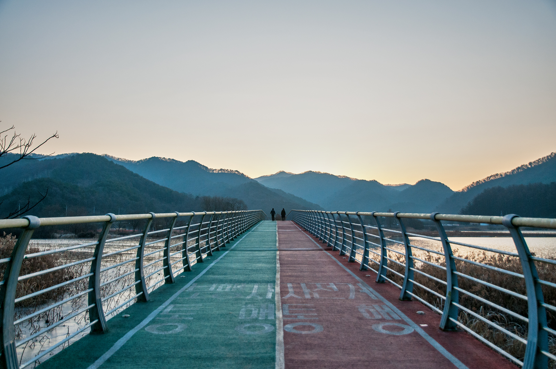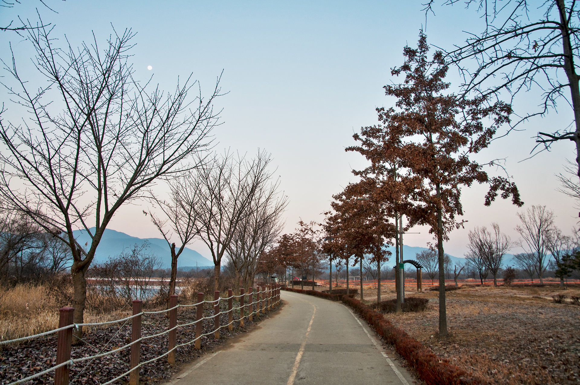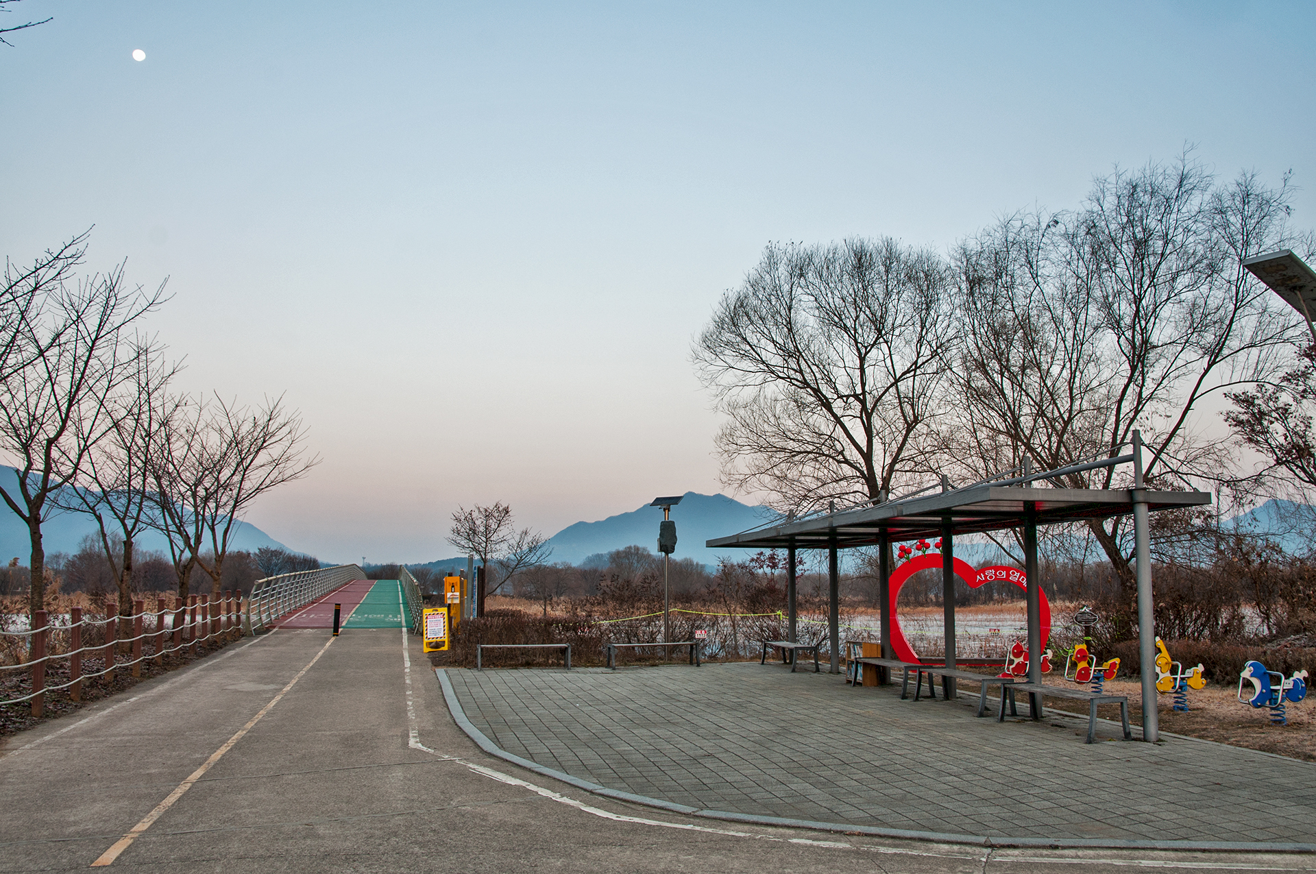 이제 보행교를 건너보자. 하늘의 달이 하얀점으로 찍혀 있다.