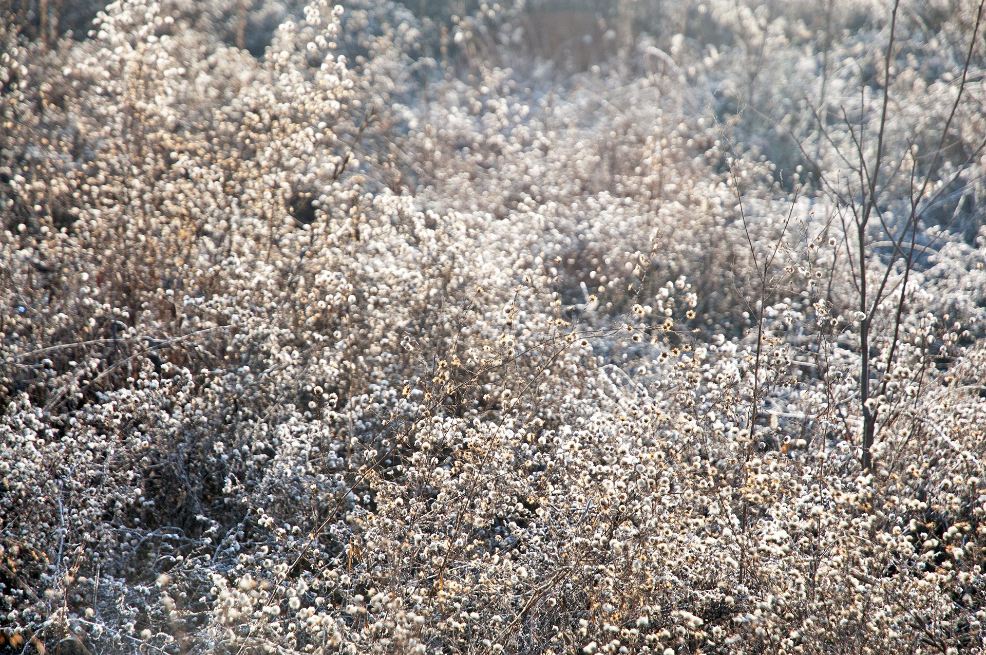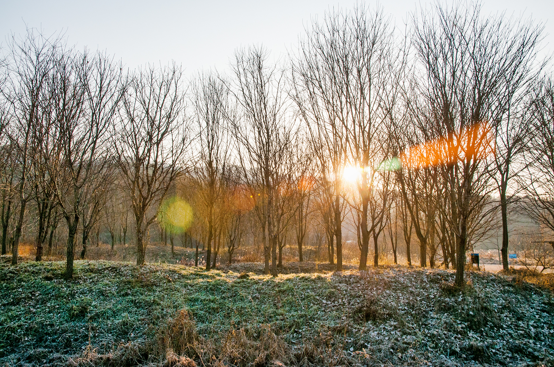 햇빛이 쏟아지는데도 하얀 서리가 아직 녹지 않아 얼음꽃을 보여 준다.