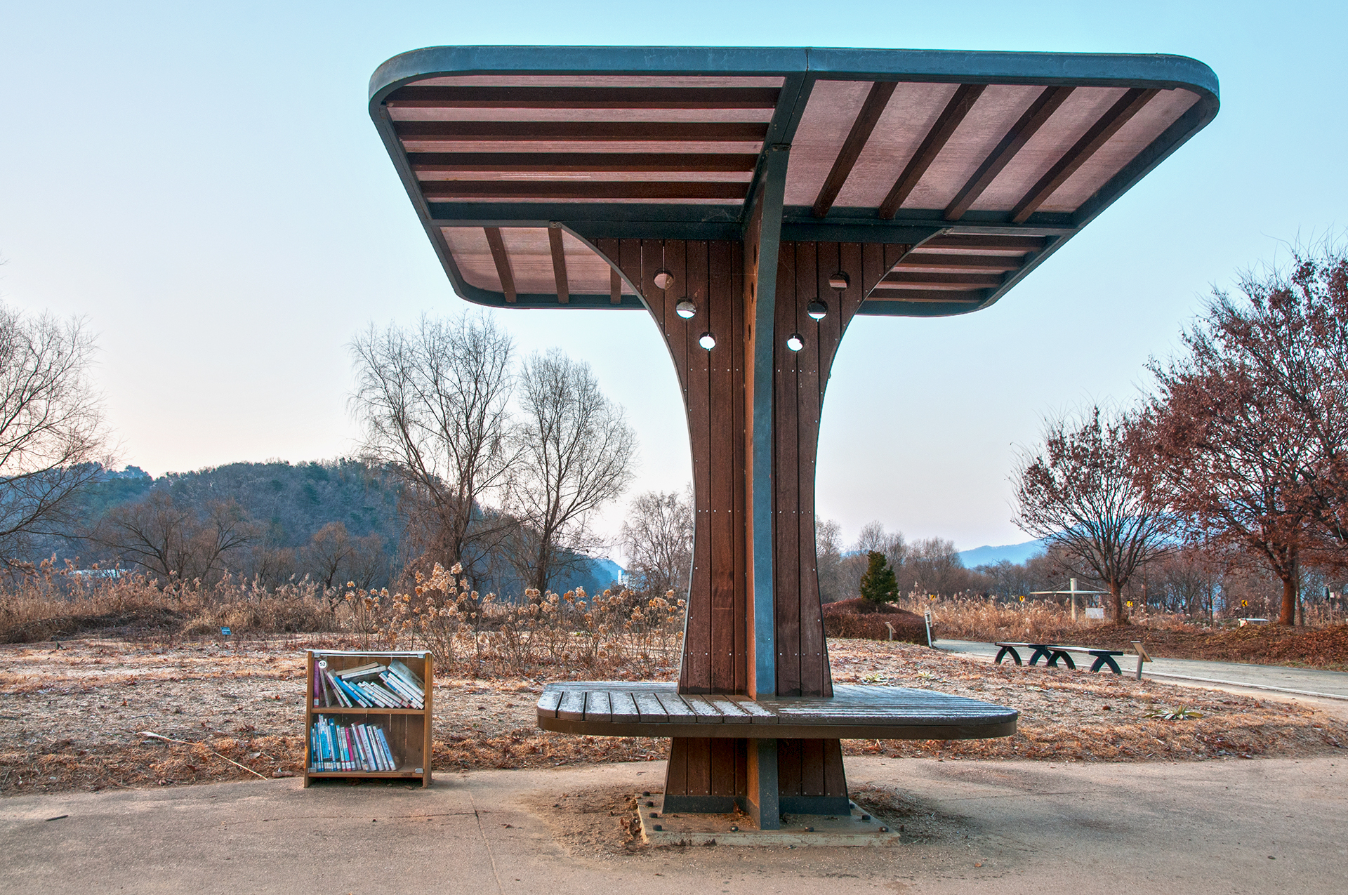 공원내에는 쉼터와 함께 도서함이 설치되어 있어 자연과 함께 휴식하면서 즐기는 독서공간이라 할수 있다.