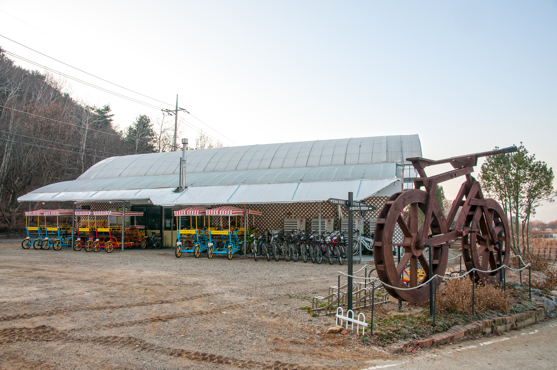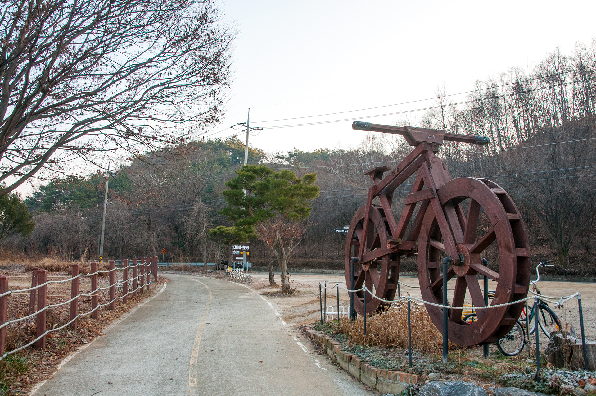 다육이 체험농원 옆을 지나가는 중, 커다란 목재 자전거가 금방이라도 굴러갈 것만 같다.