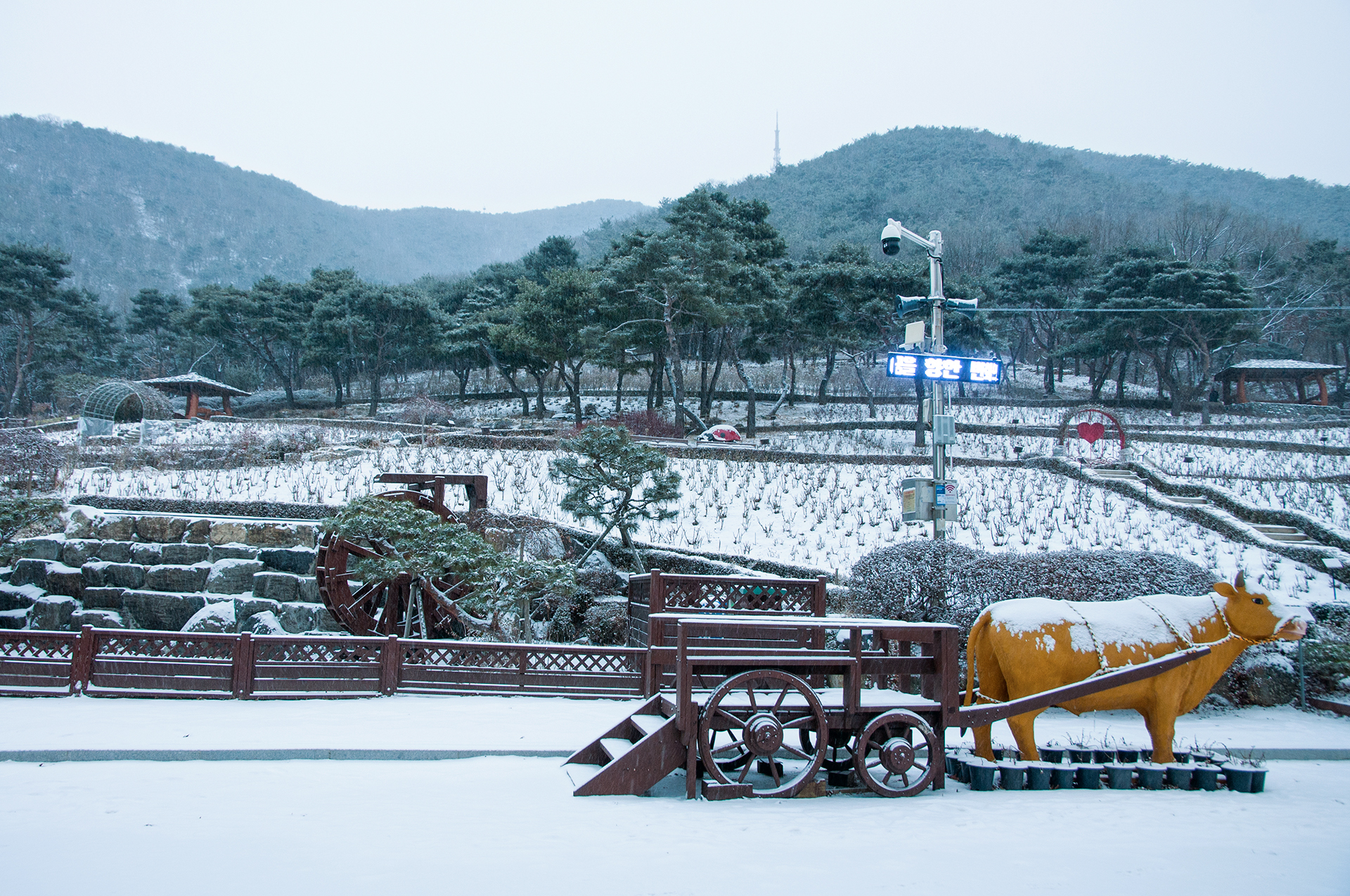 계양산 장미원 입구, 눈에 젖을까봐 카메라가 걱정되던 참인데 다행이 눈발이 약해지기 시작한다.