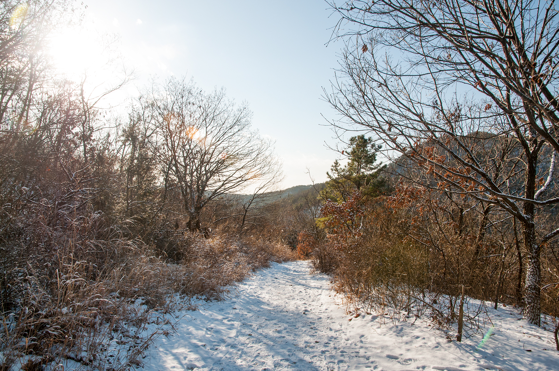 뒤돌아보면 해는 이미 산 위로 떠올랐지만 등지고 걷는 길이라 아직까지는 차가운 얼굴이 쉽사리 녹지 않는다.