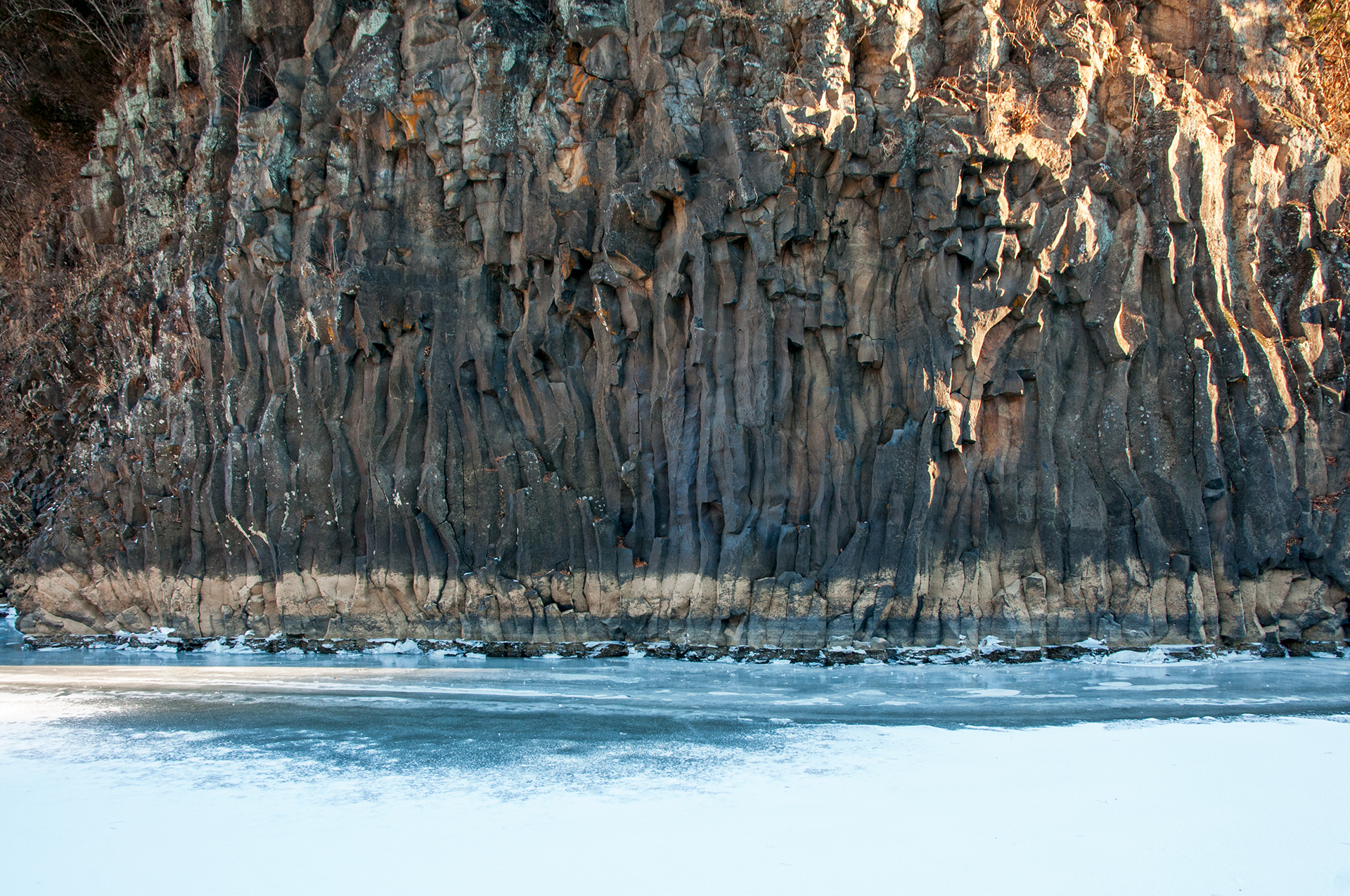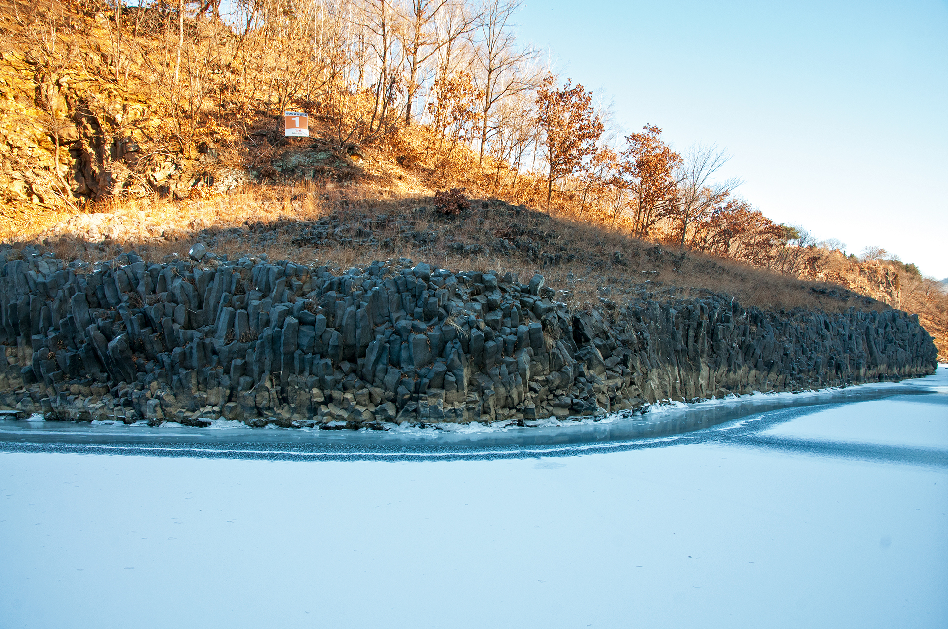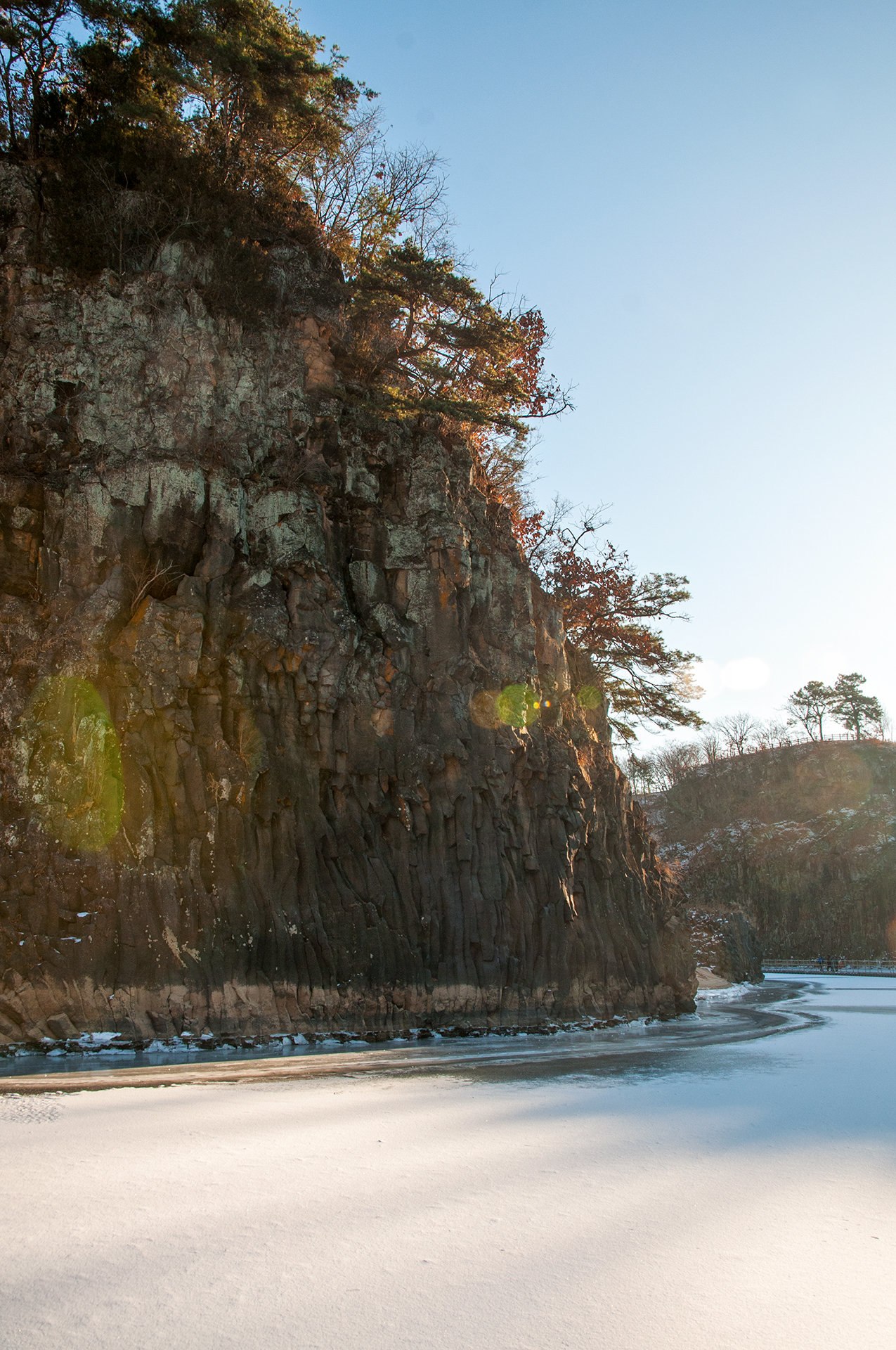 주상절리가 절벽을 이루면서 한겨울의 멋진 풍경을 보여준다.