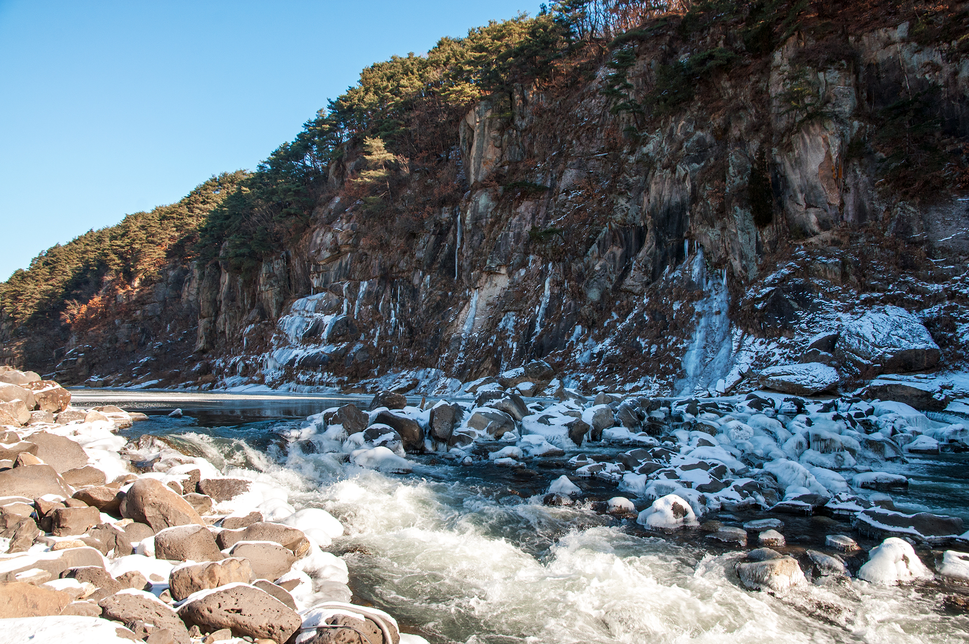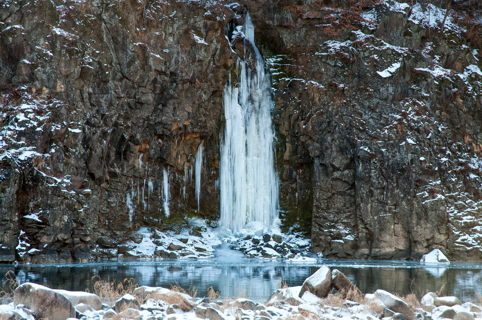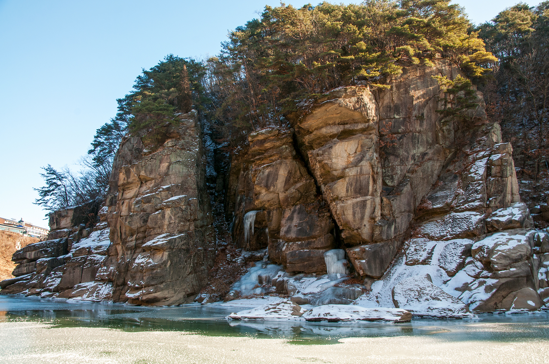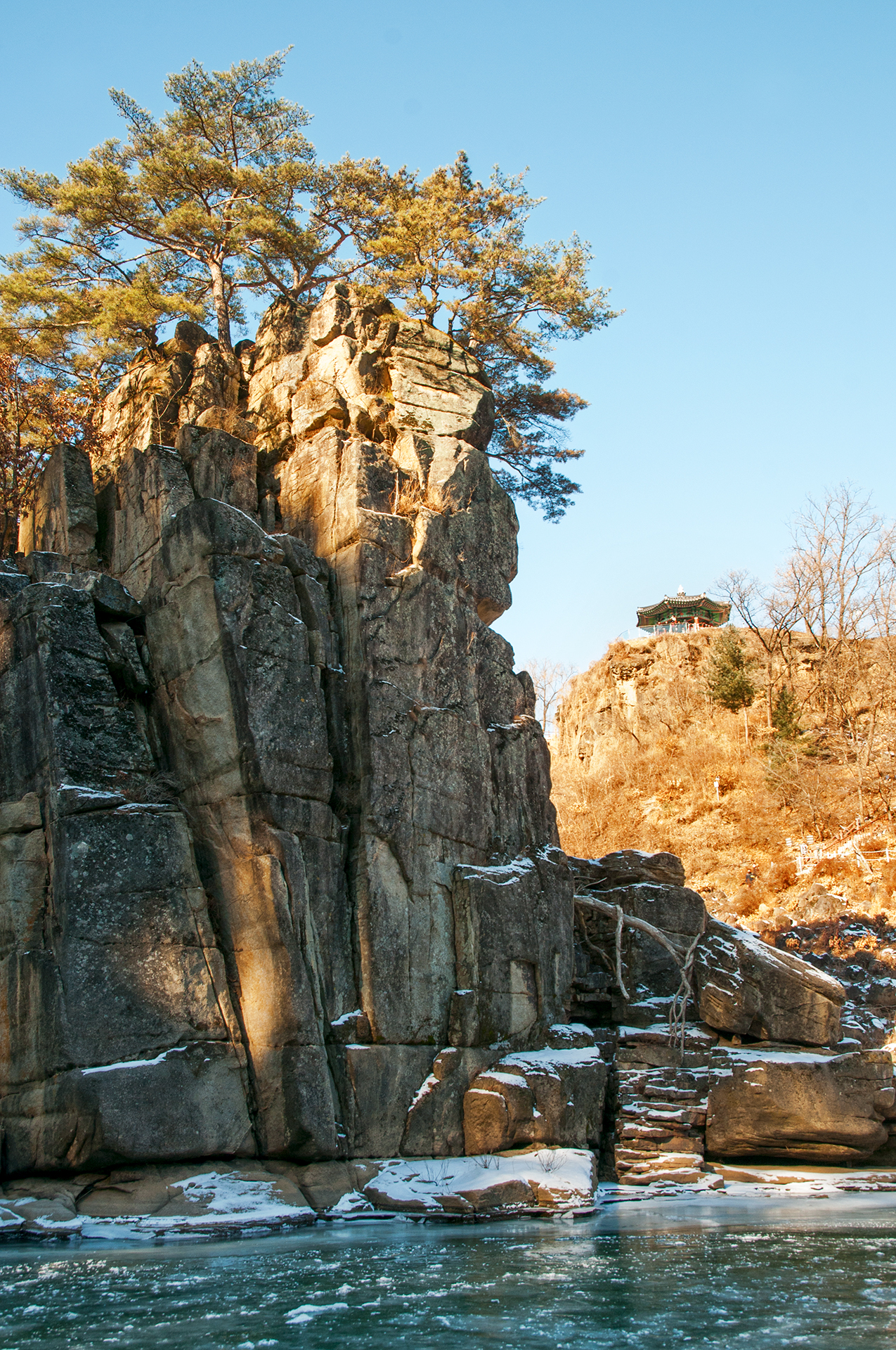 주상절리가 절벽을 이루면서 한겨울의 멋진 풍경을 보여준다.