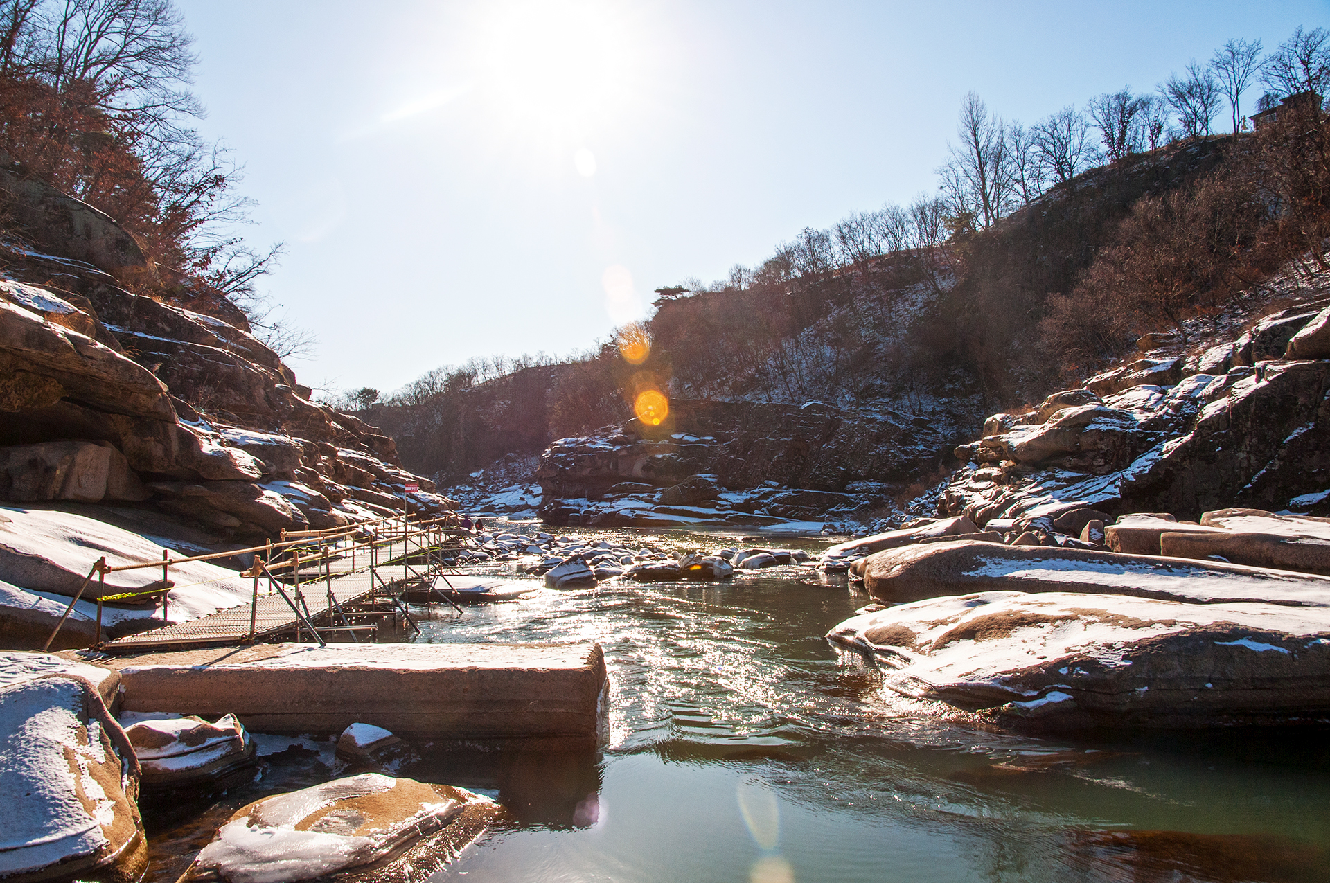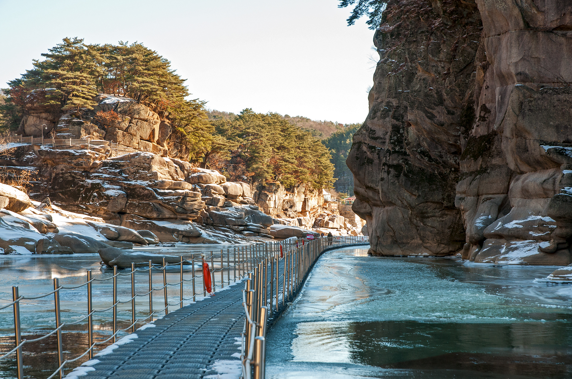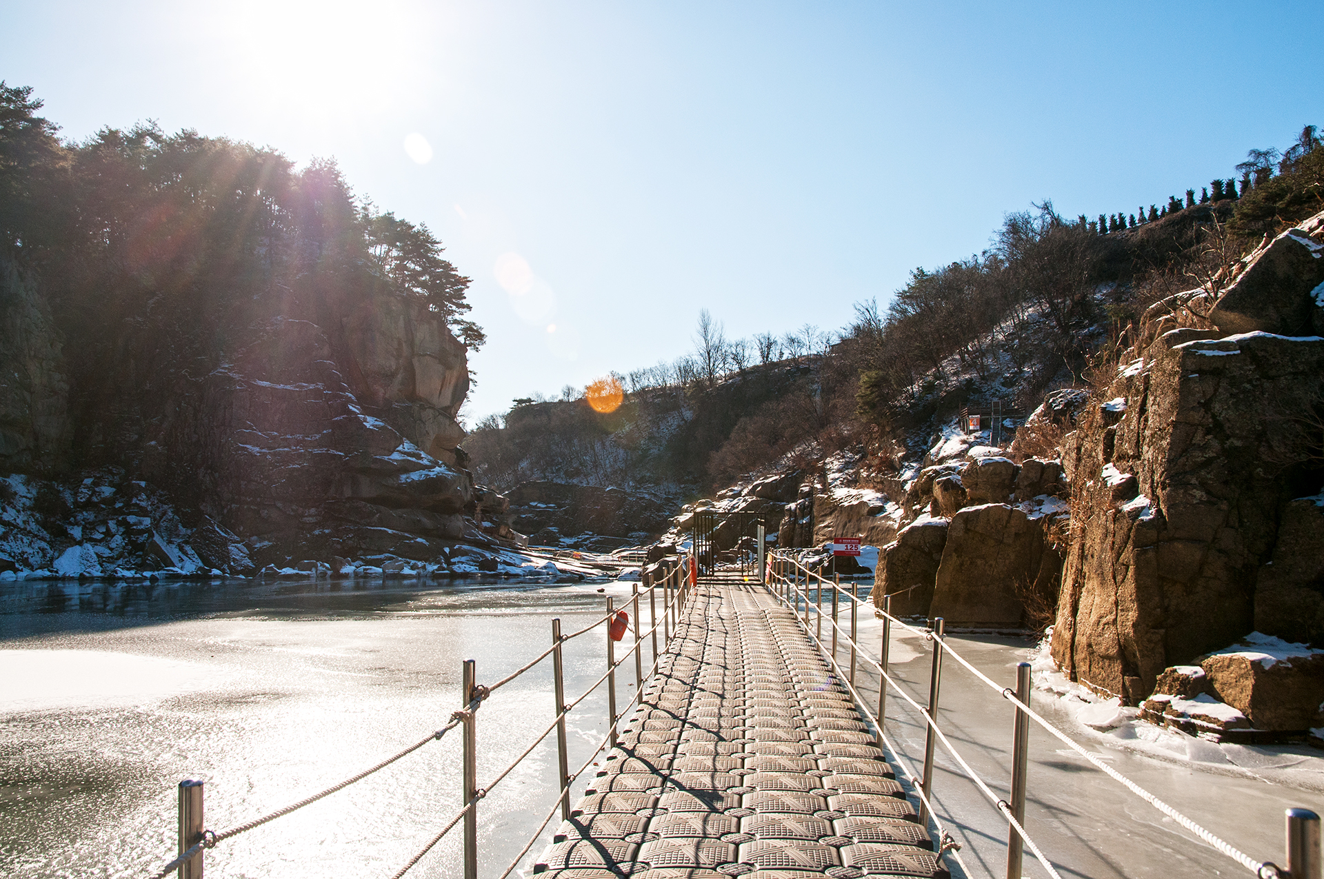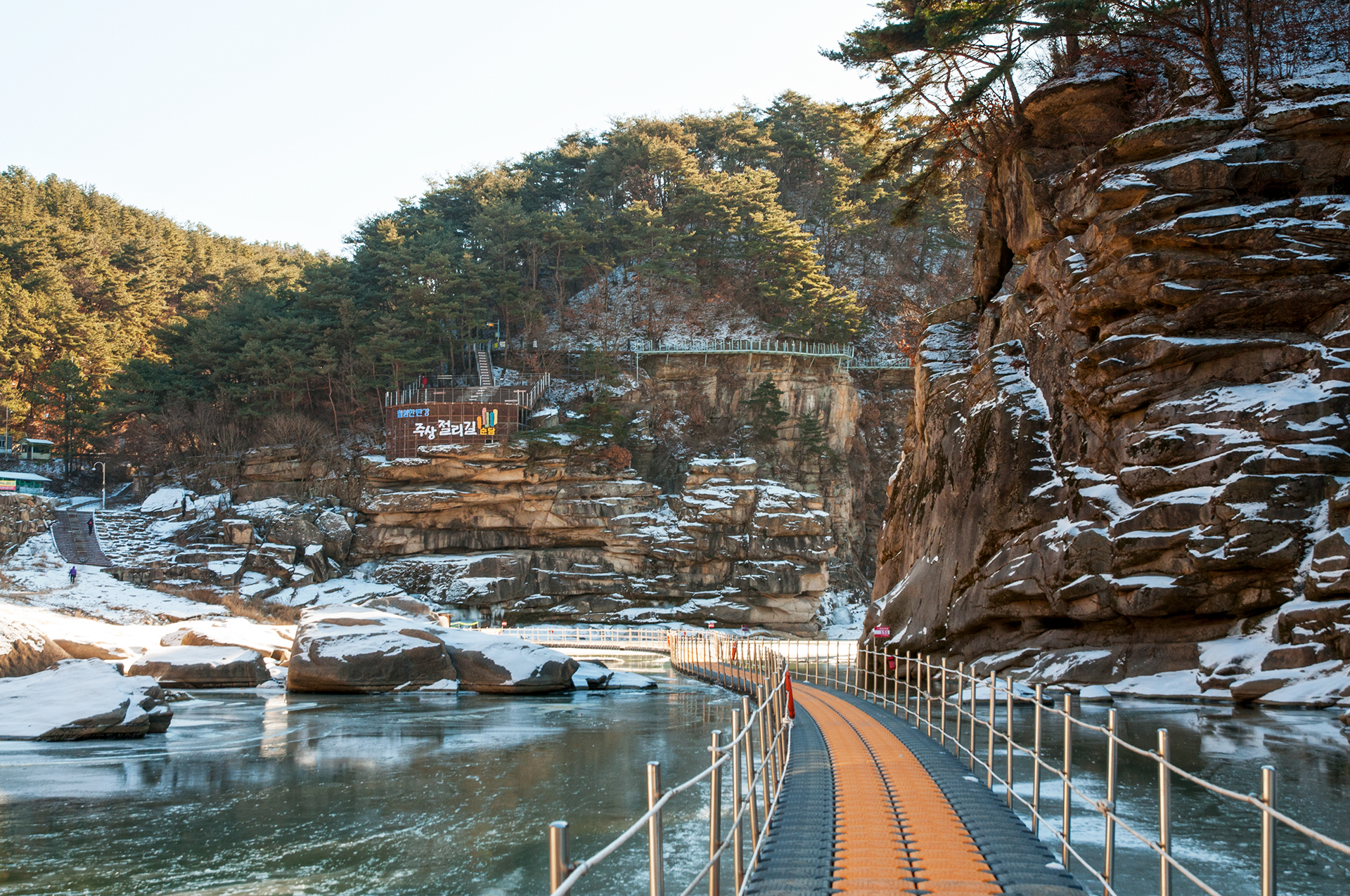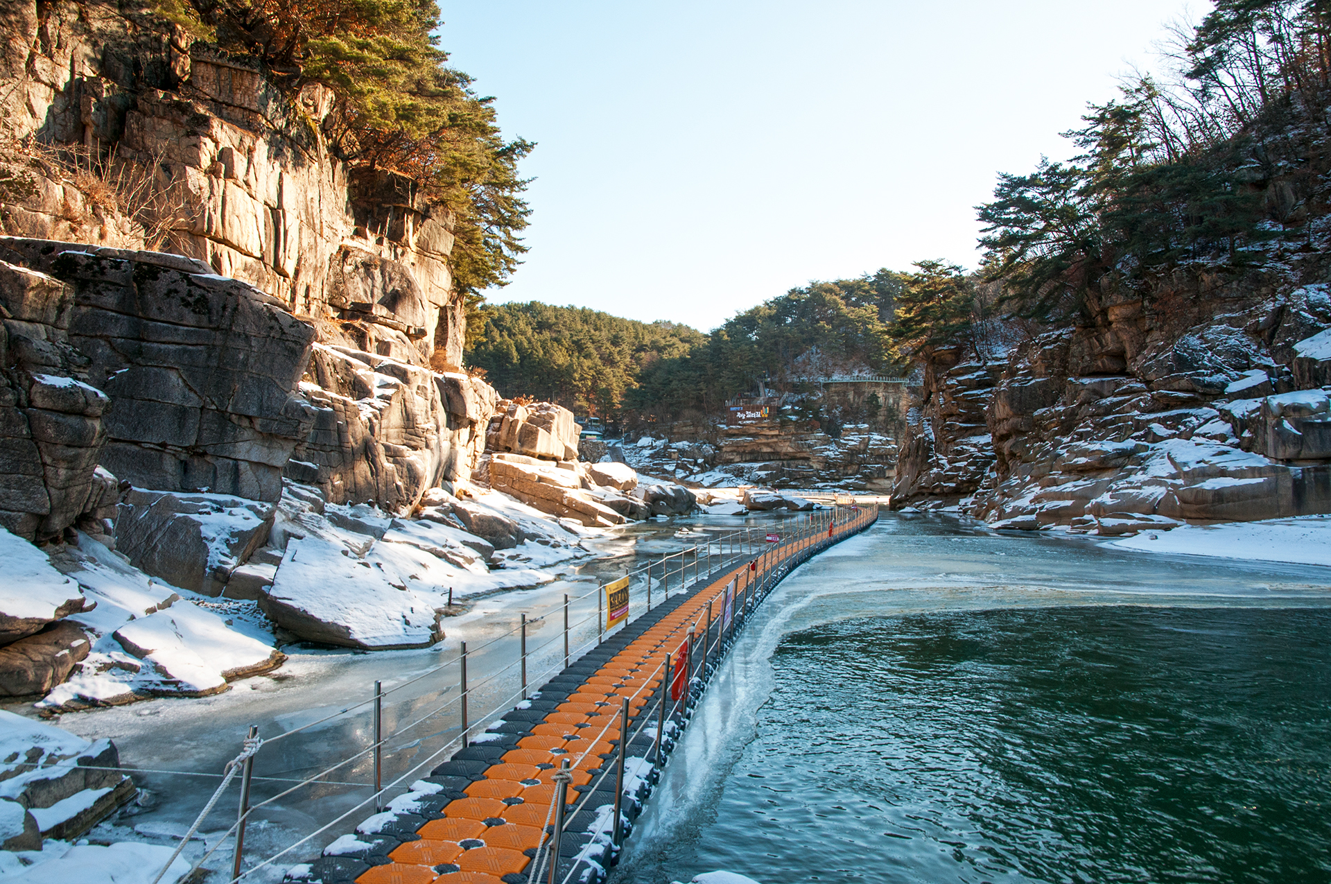 얼음이 쩍~! 하고 깨지는 소리가 동물의 포효와도 같이 어찌나 큰지 깜짝 놀랐던 지점이다. 짧은 구간 설치된 부교를 건너간다.