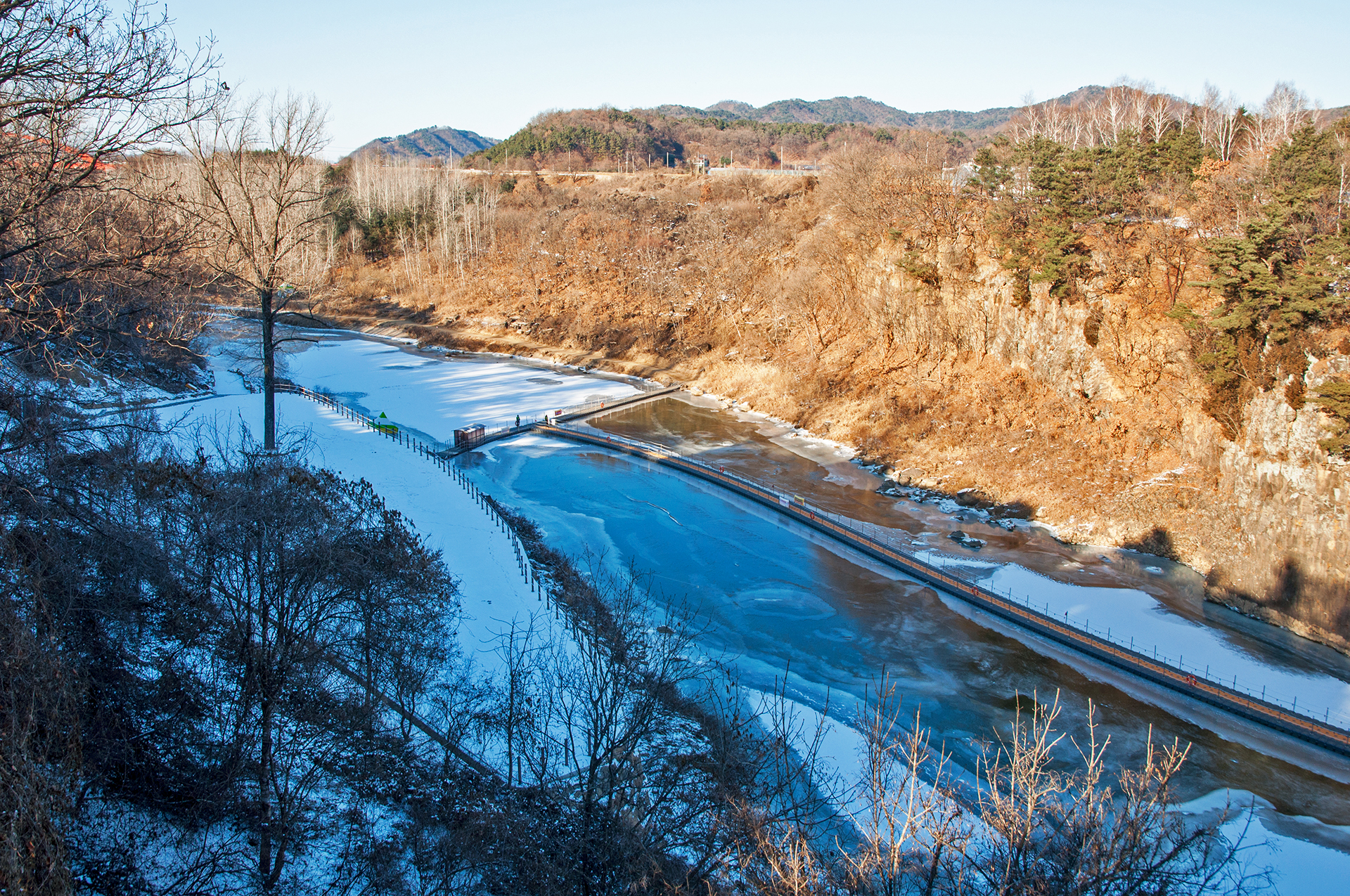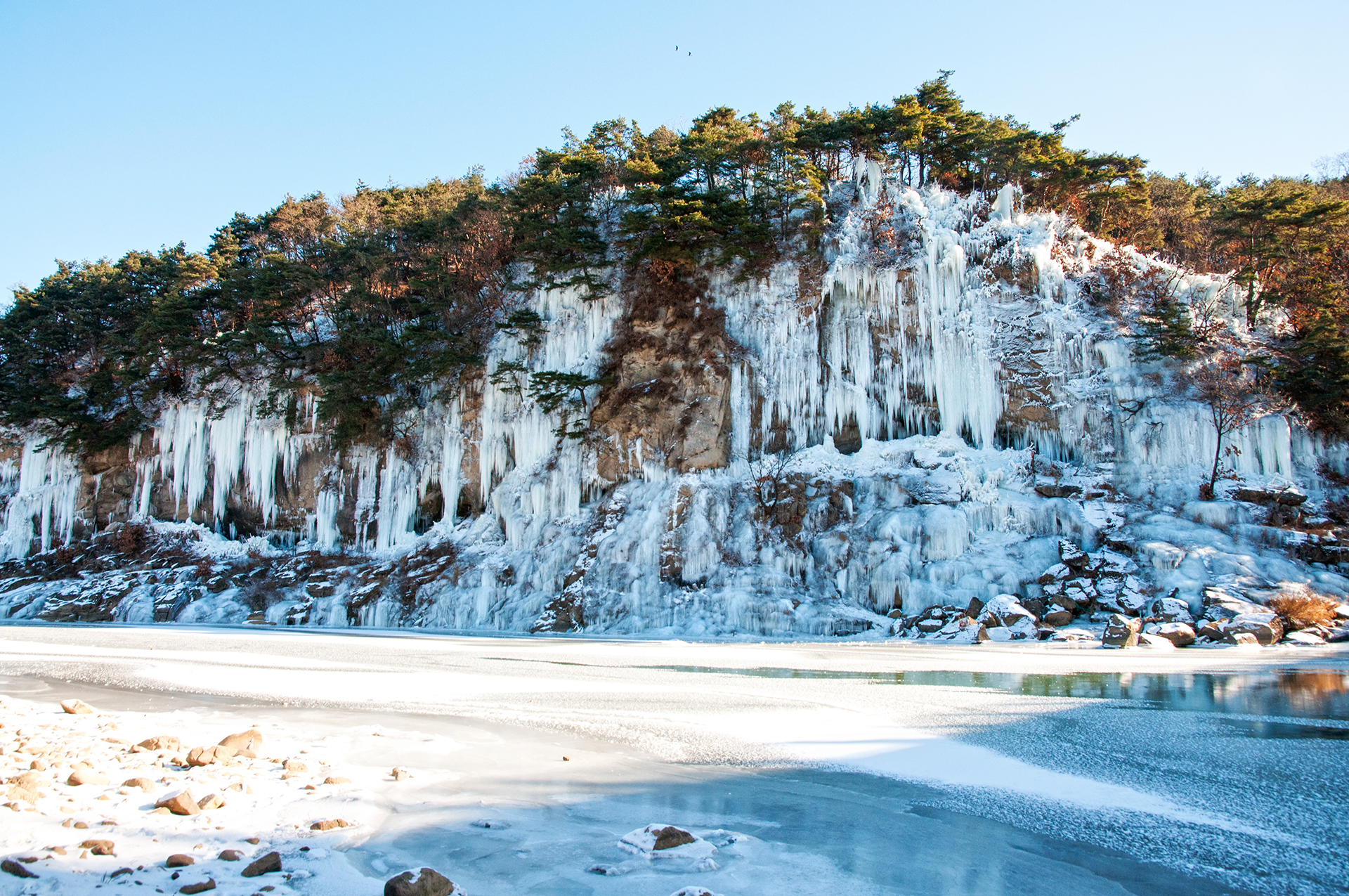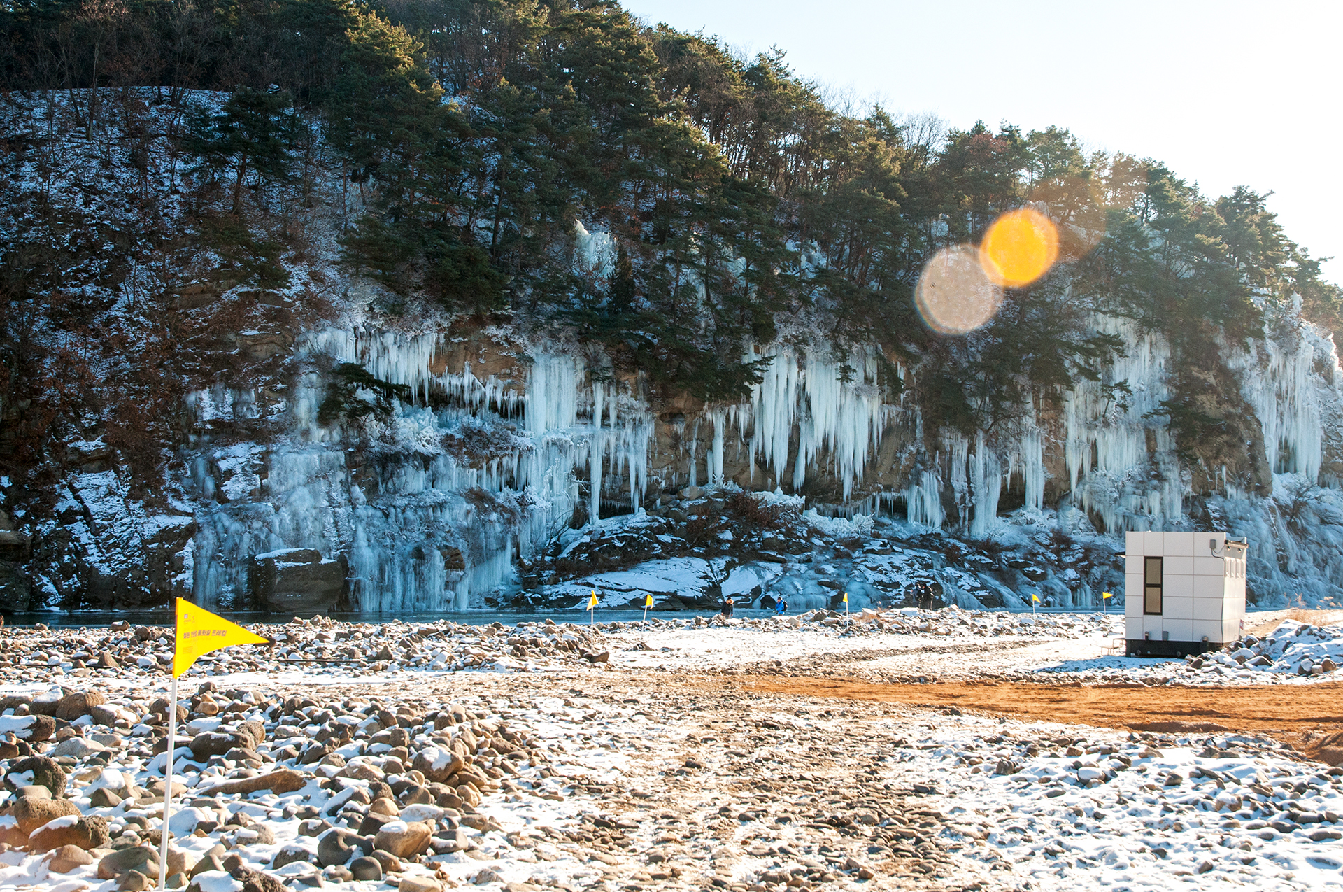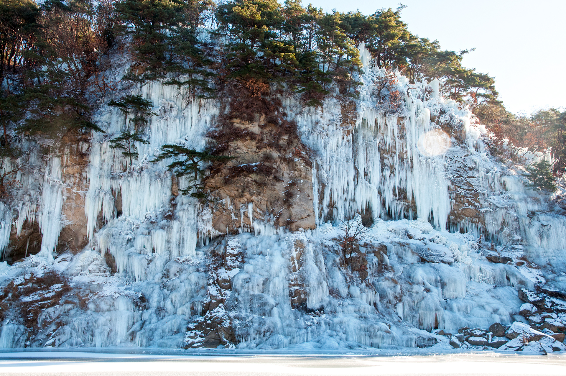 인공으로 조성한 빙벽이겠지만 물윗길만이 갖는 자연스러워 보이는 풍경이라 할수 있다.