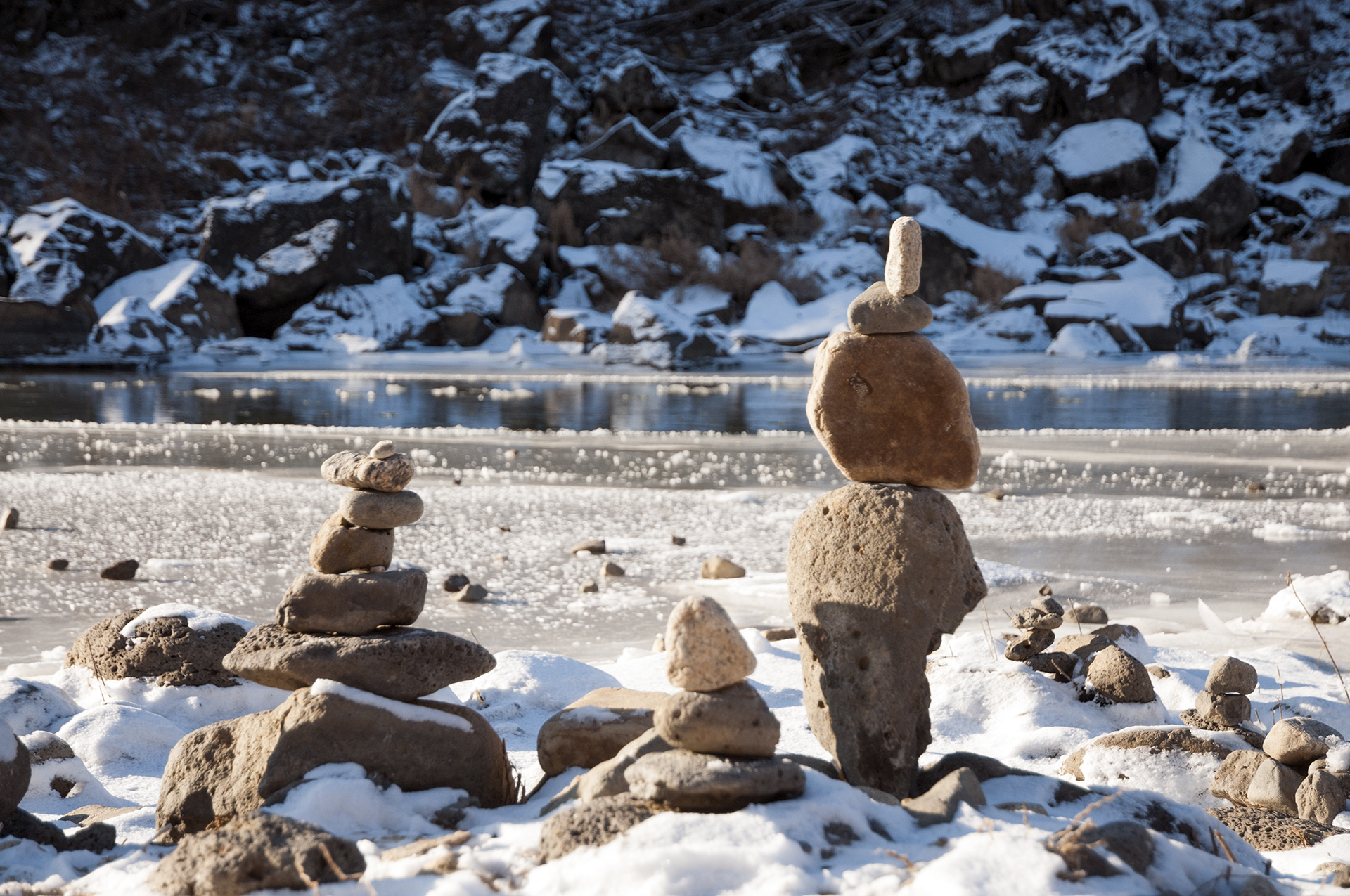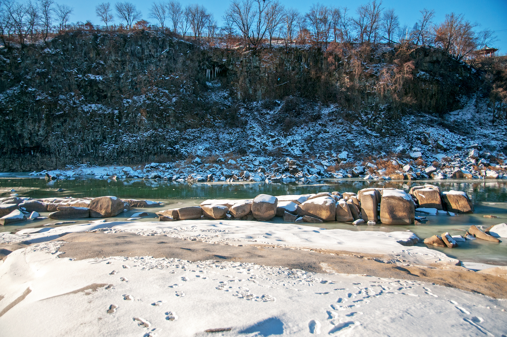한탄강 곳곳이 얼어 있고, 어제 내린 눈이 그대로 쌓여 있다.