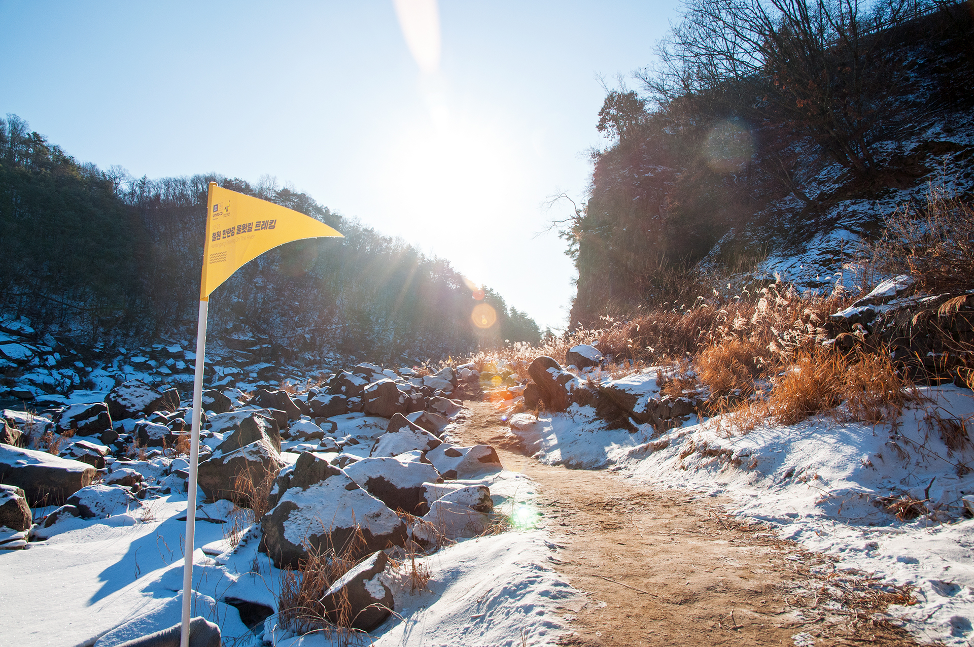 영하18도라고는 하지만 아침 물윗길 트레킹은 햇빛을 정면에 두고 걷게 된다. 얼마나 다행스런 일인가?!