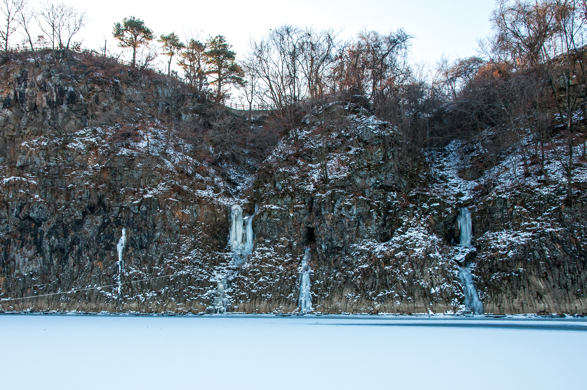 군데군데 흘러내린 물줄기는 그대로 얼어 얼음기둥을 형성하고 있다.