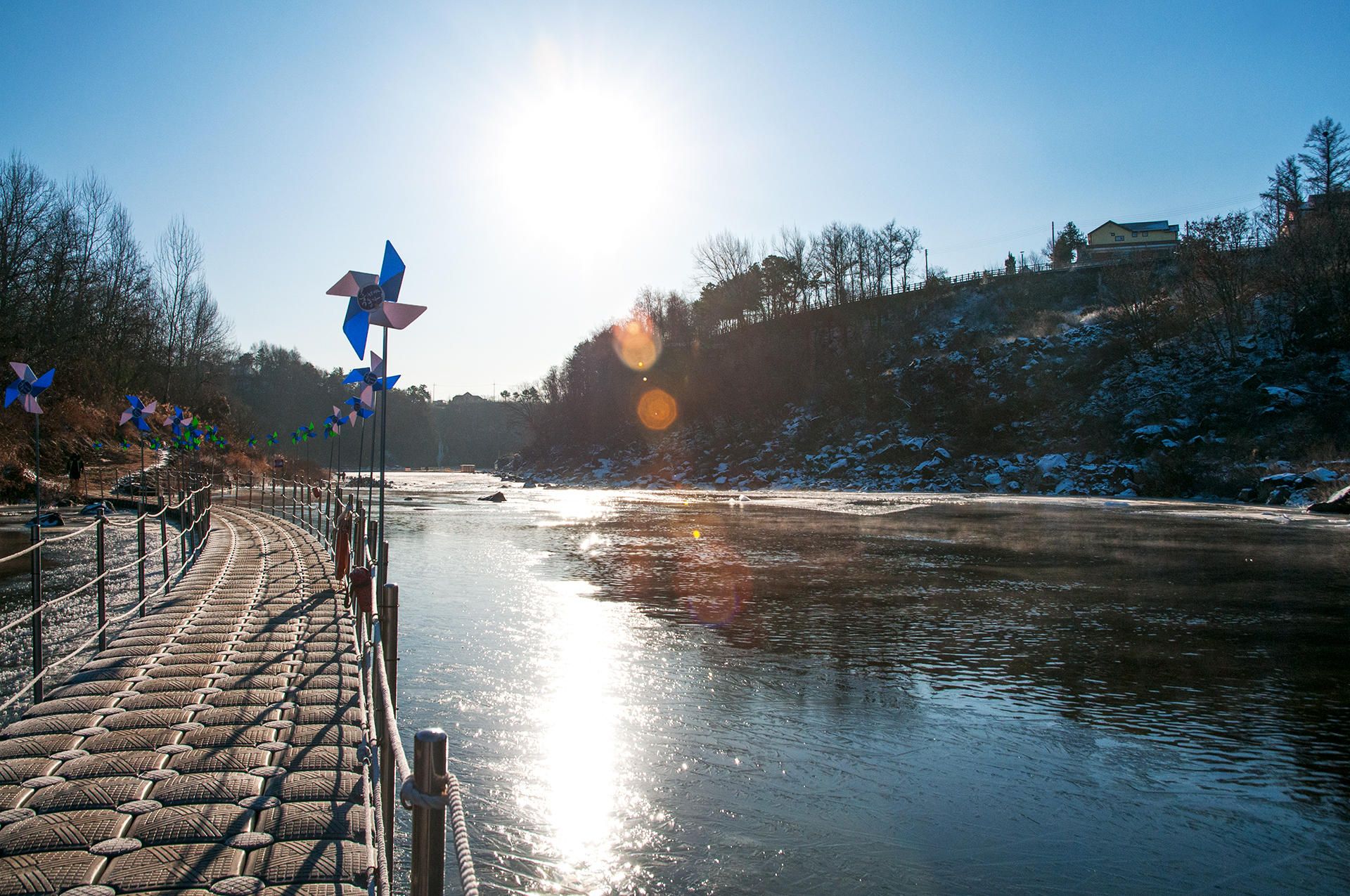 출렁거리는 부교를 건너며 저벅저벅 대는 발자국 소리에 오리들이 강가로 달아난다.