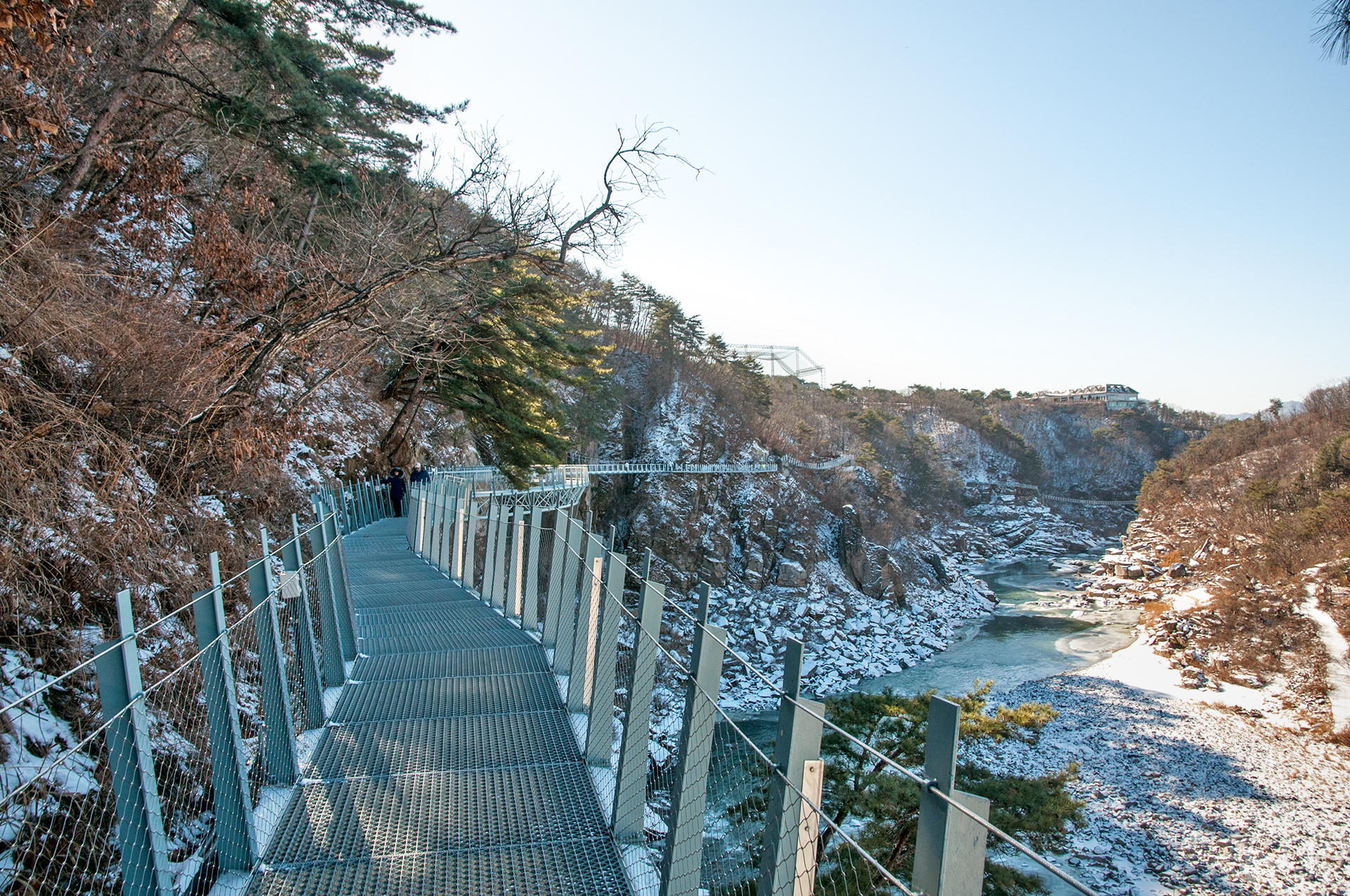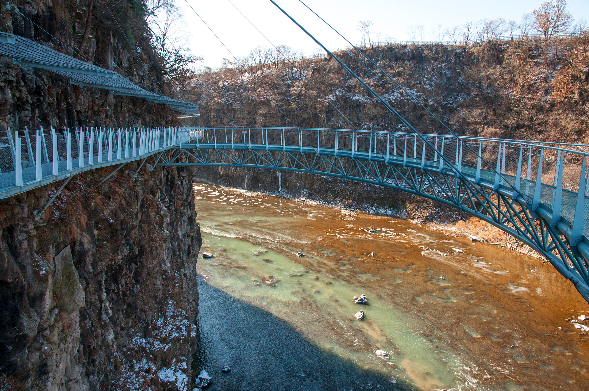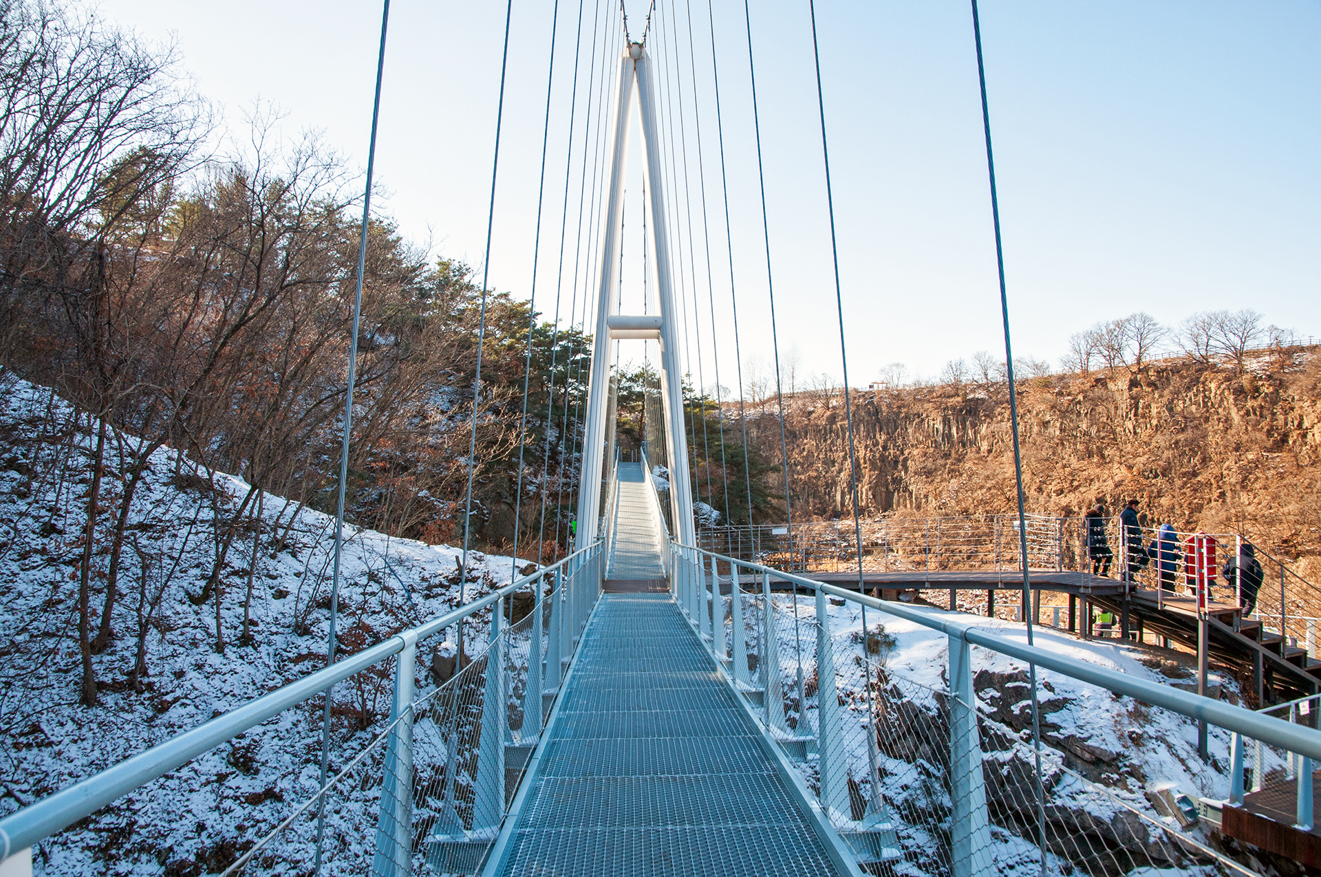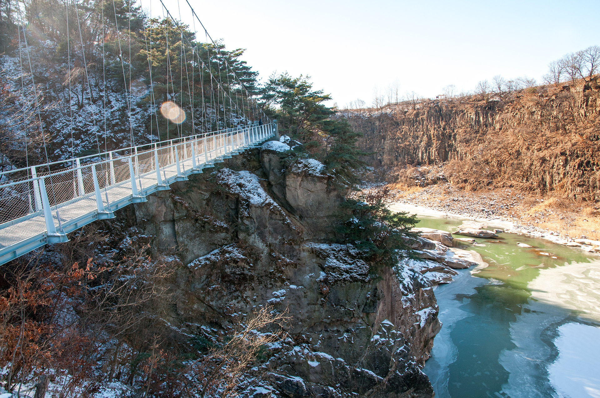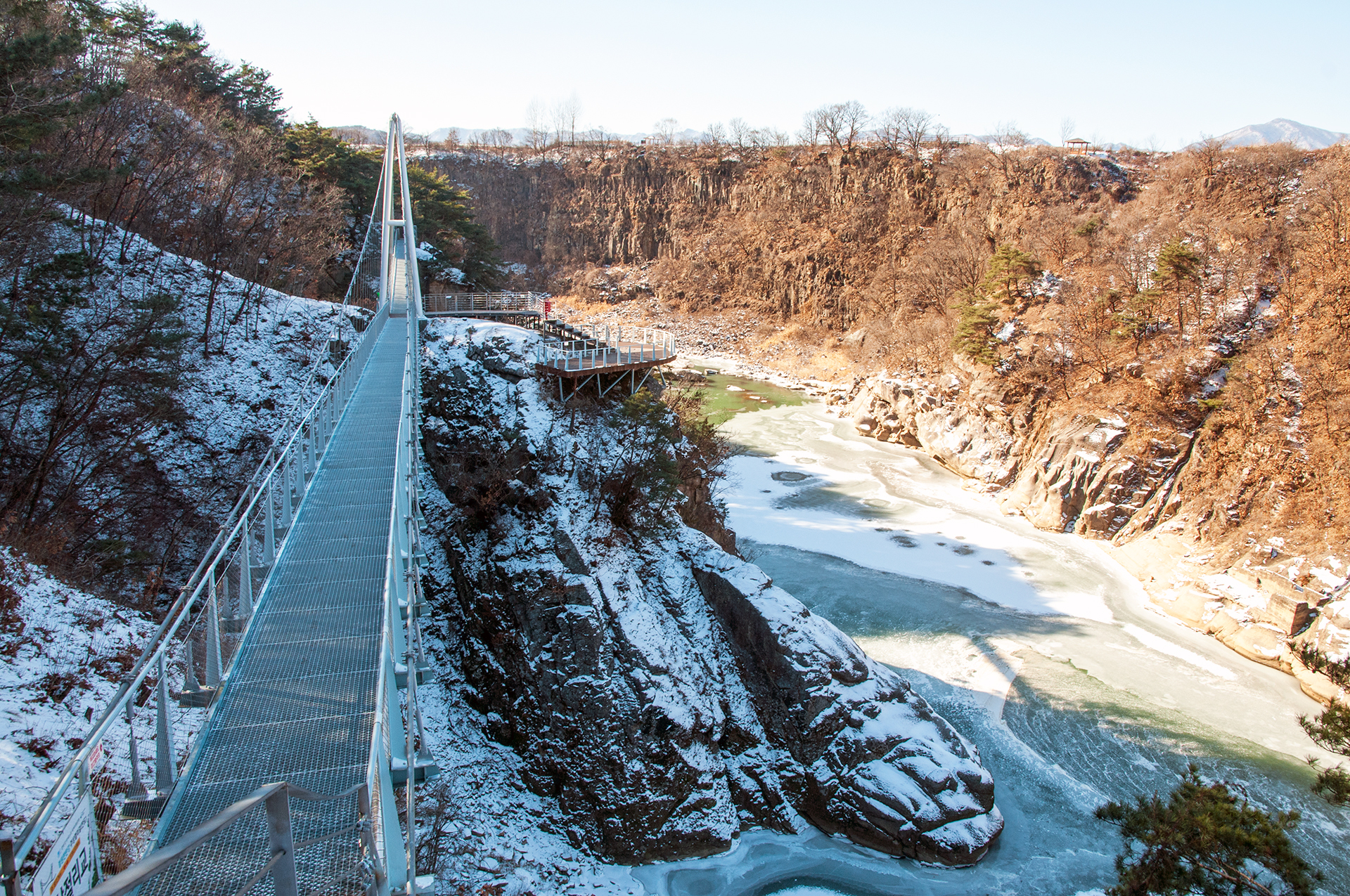 칼로 자른듯 반듯하게 선 절벽 옆으로 단층교가 지나가고, 그 앞으로 선돌교가 이어진다.