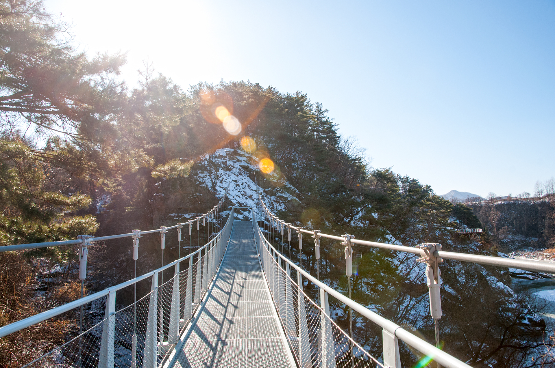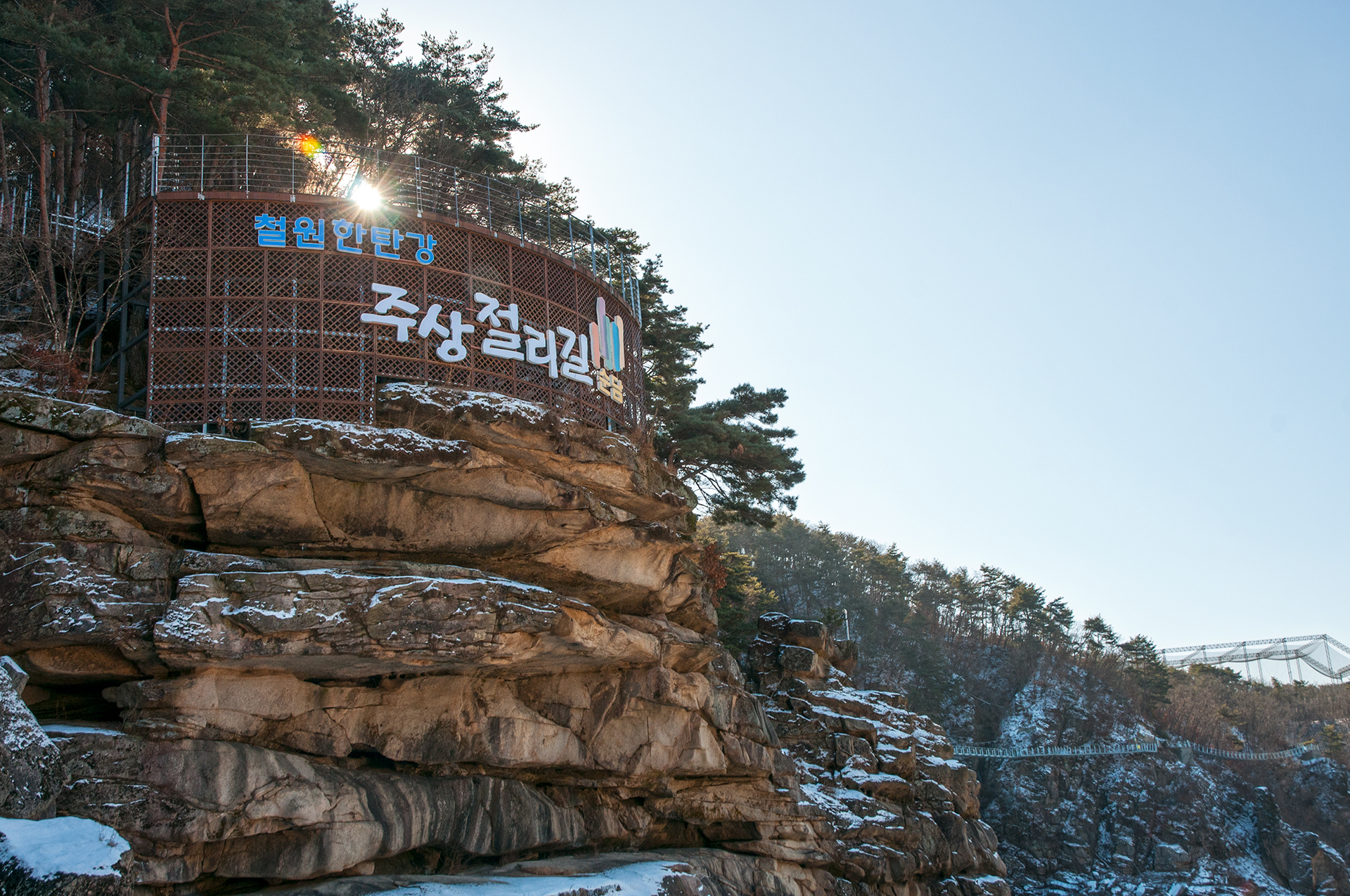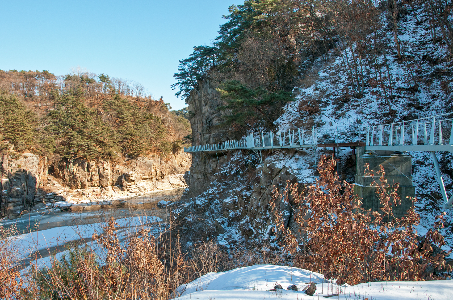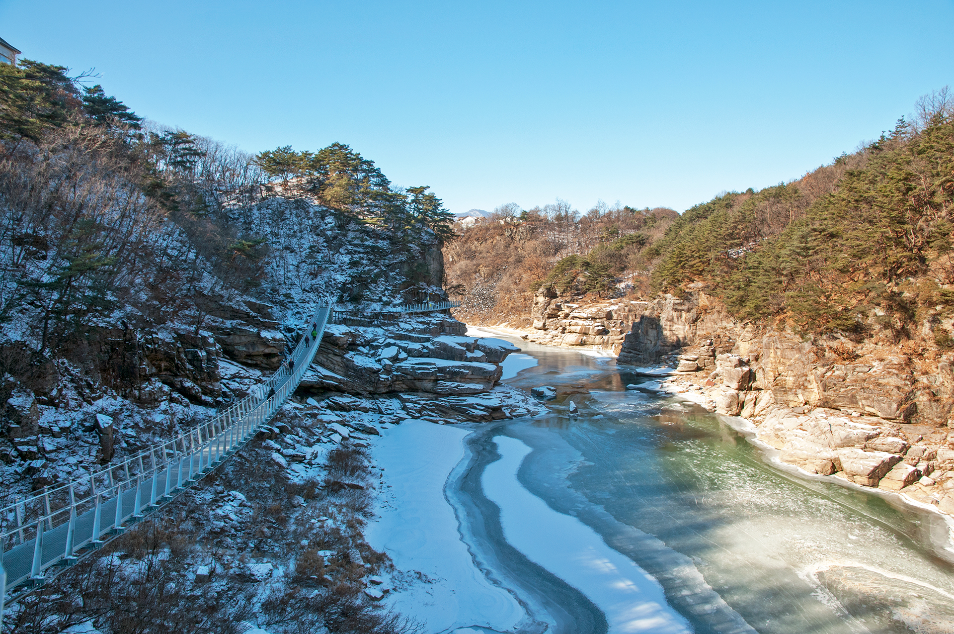 칼로 자른듯 반듯하게 선 절벽 옆으로 단층교가 지나가고, 그 앞으로 선돌교가 이어진다.