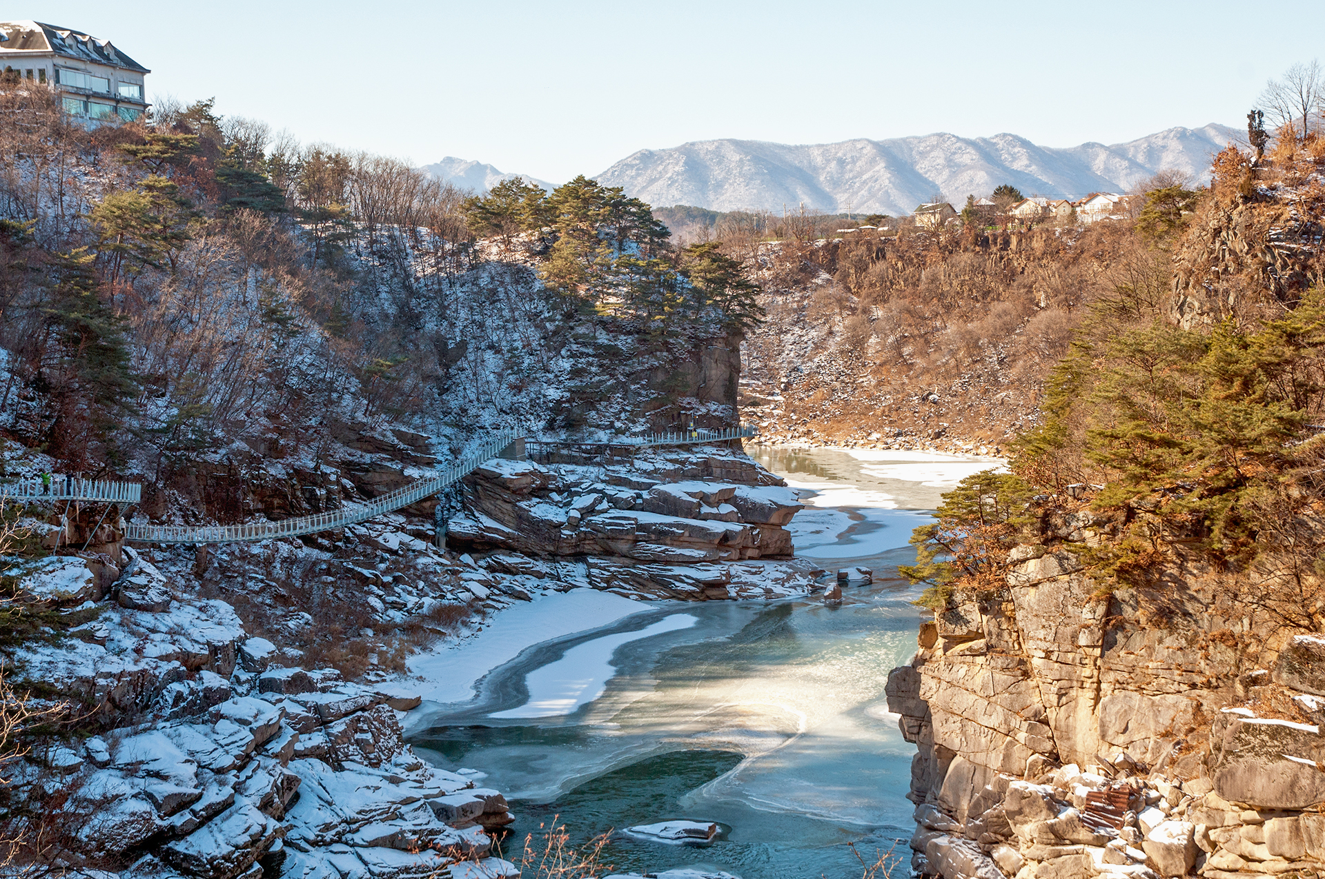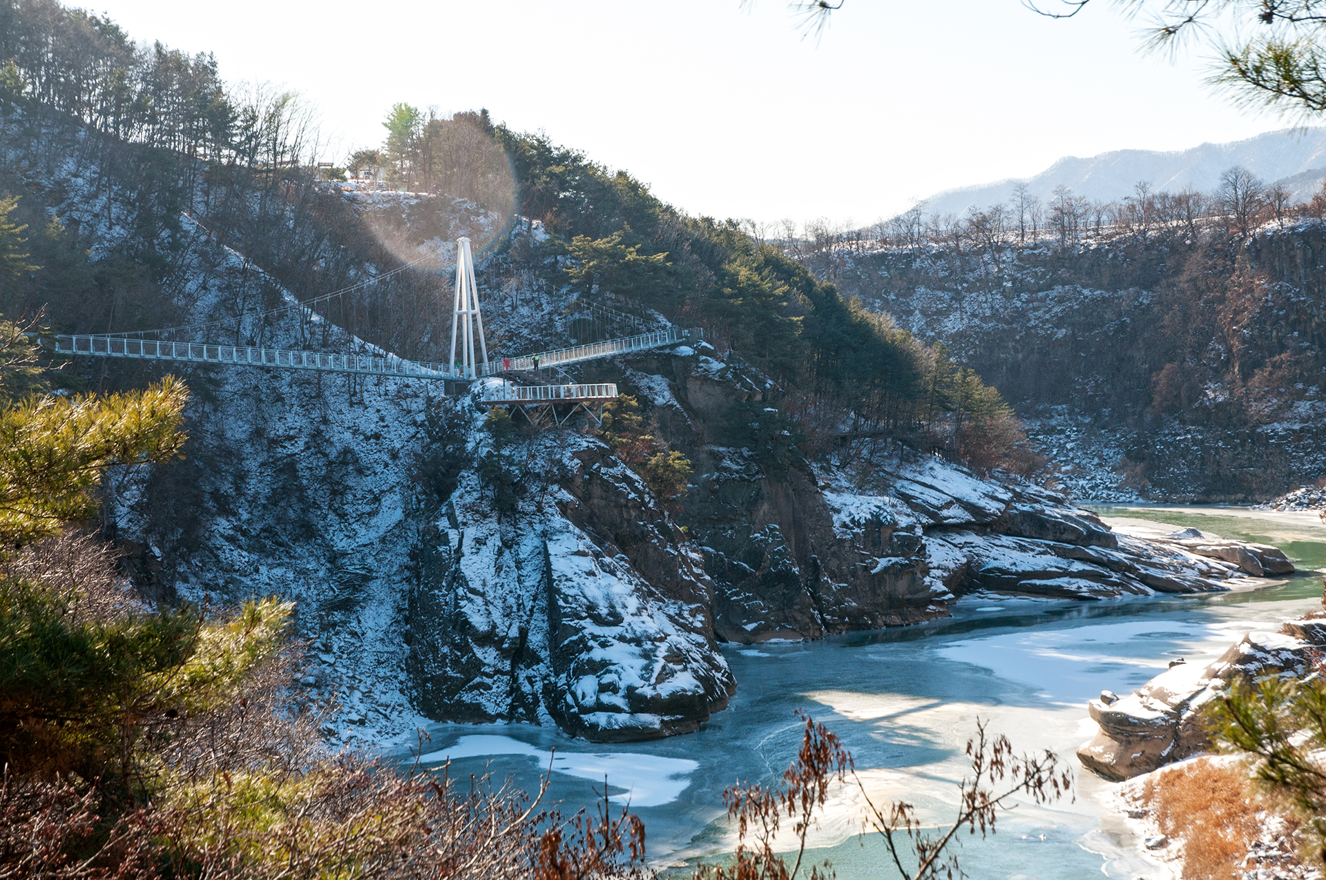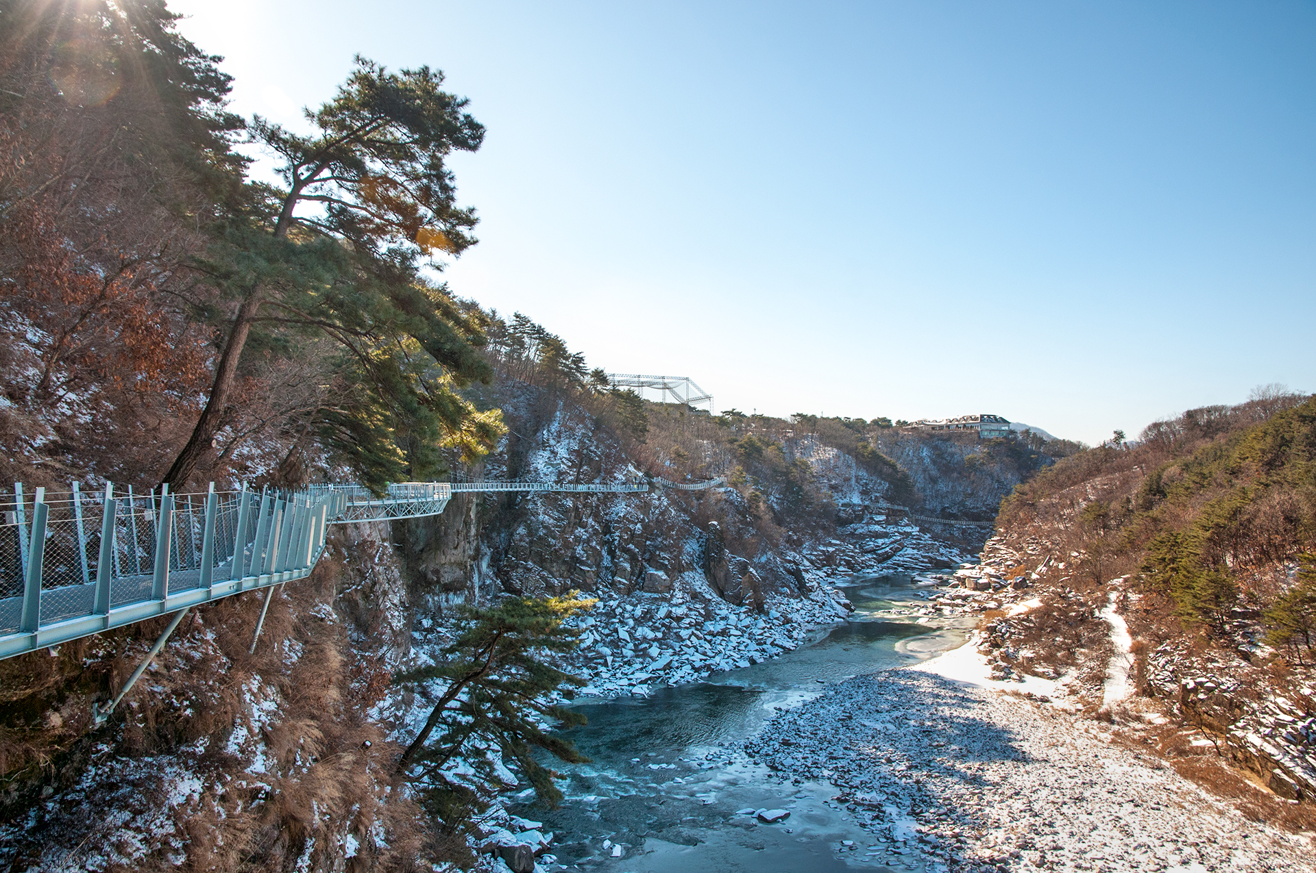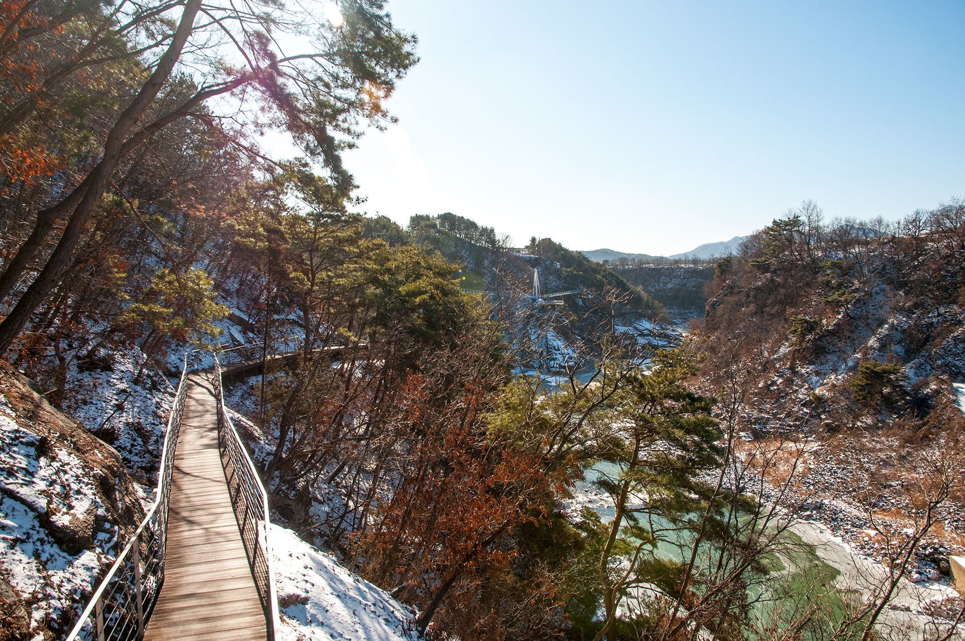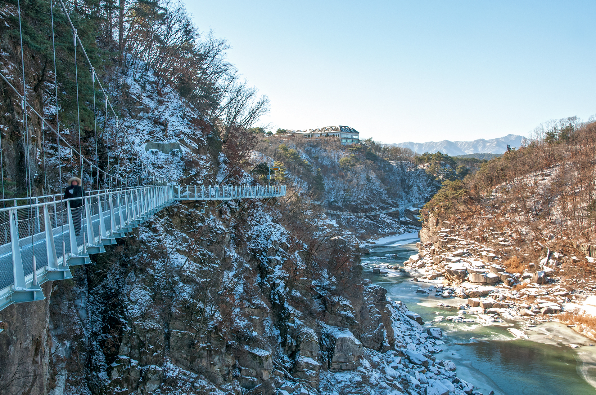 칼로 자른듯 반듯하게 선 절벽 옆으로 단층교가 지나가고, 그 앞으로 선돌교가 이어진다.