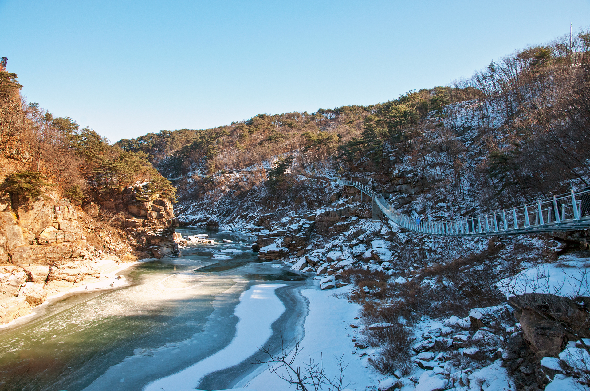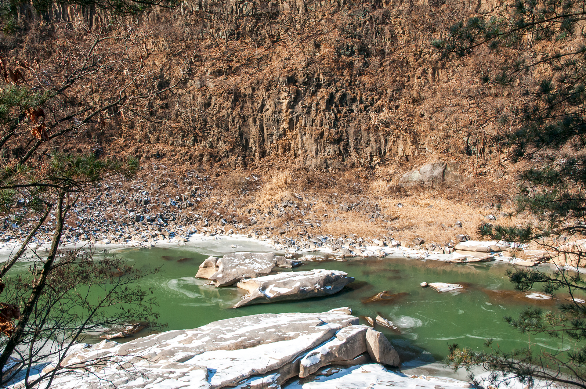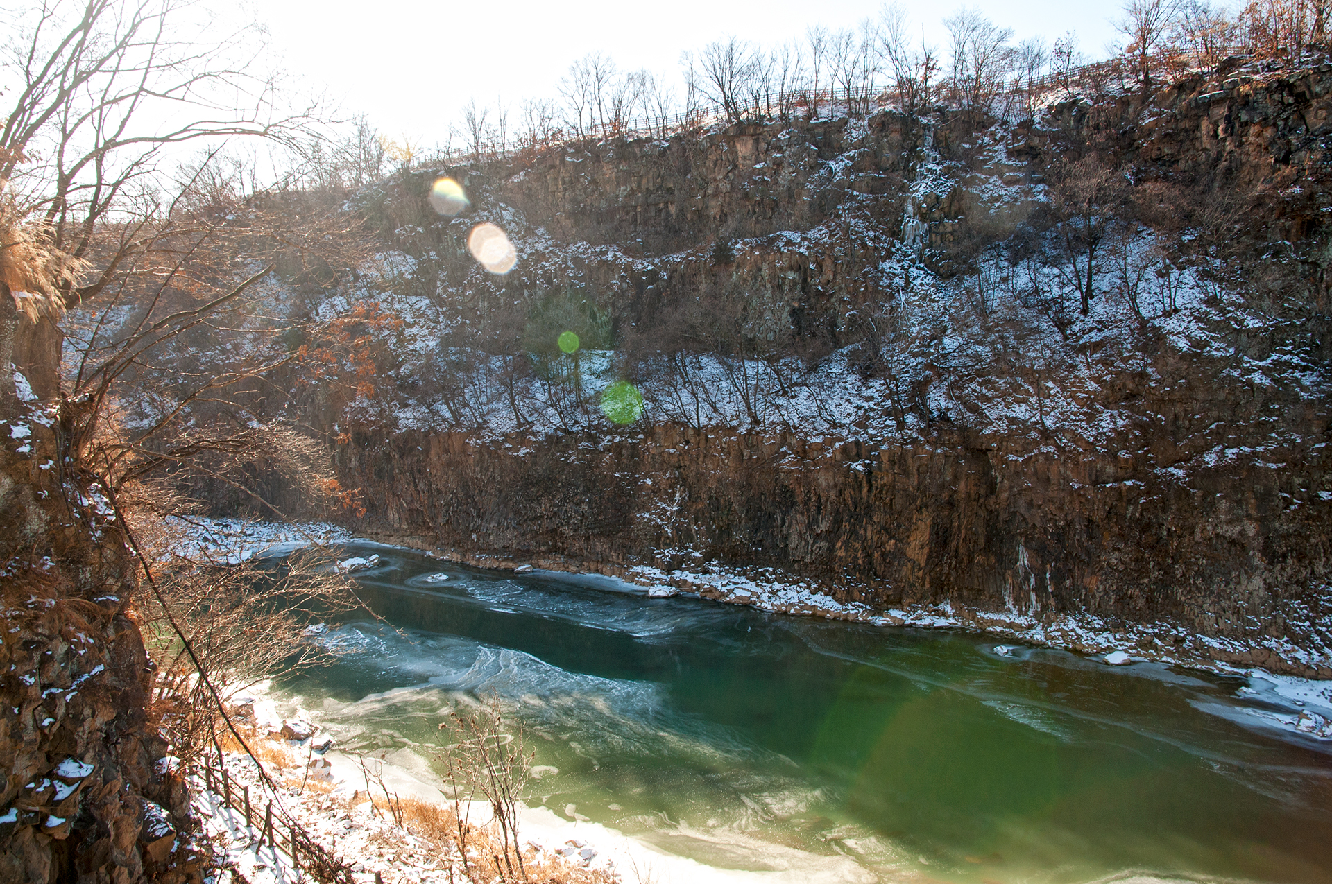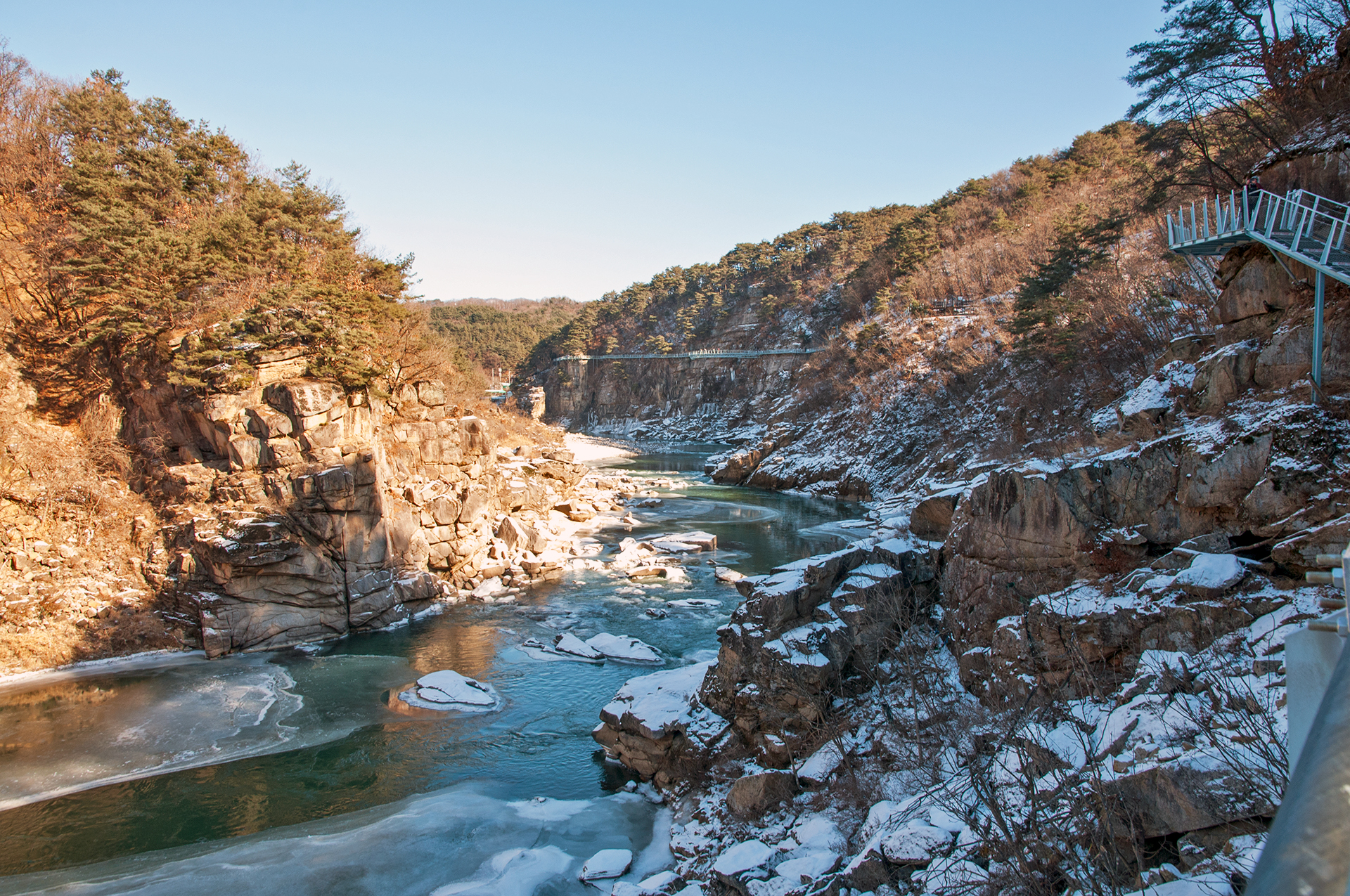 잔잔하던 강물은 추위에 얼어붙었고, 화강암 절벽은 눈이 쌓여 그림같은 풍경을 보여 준다.