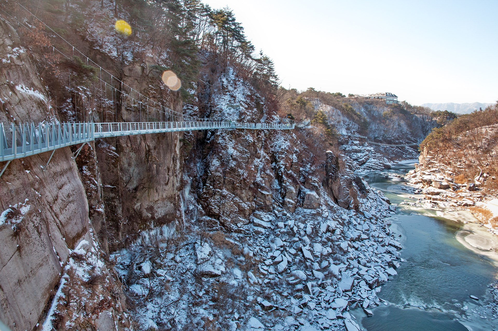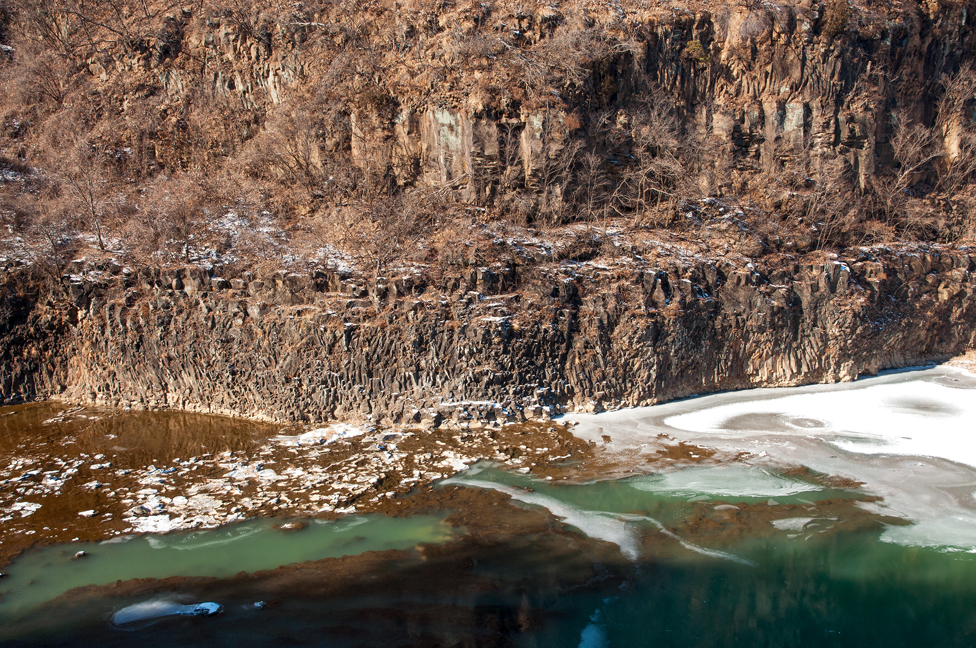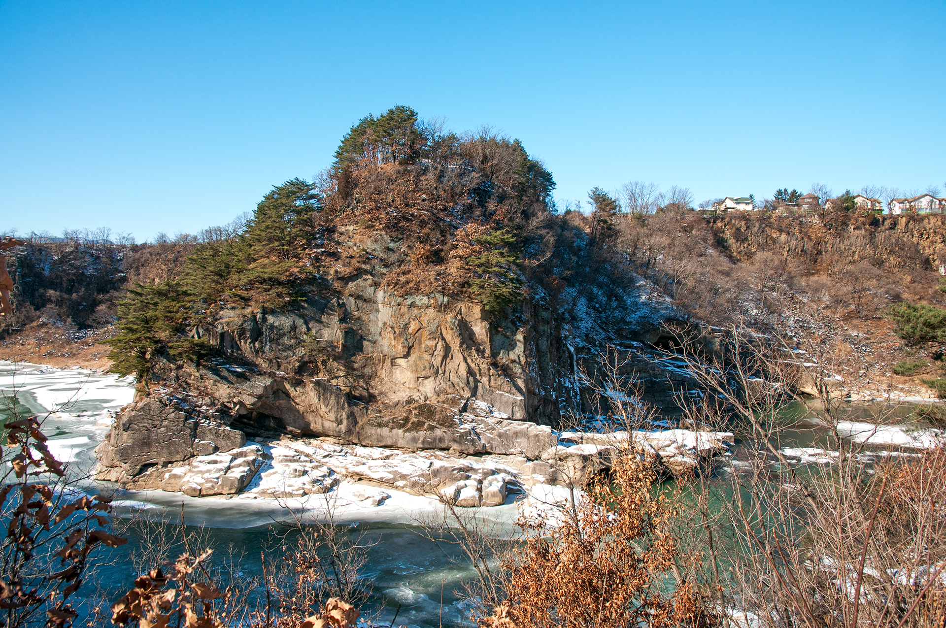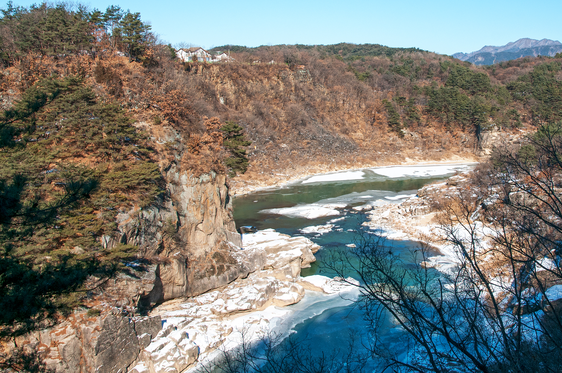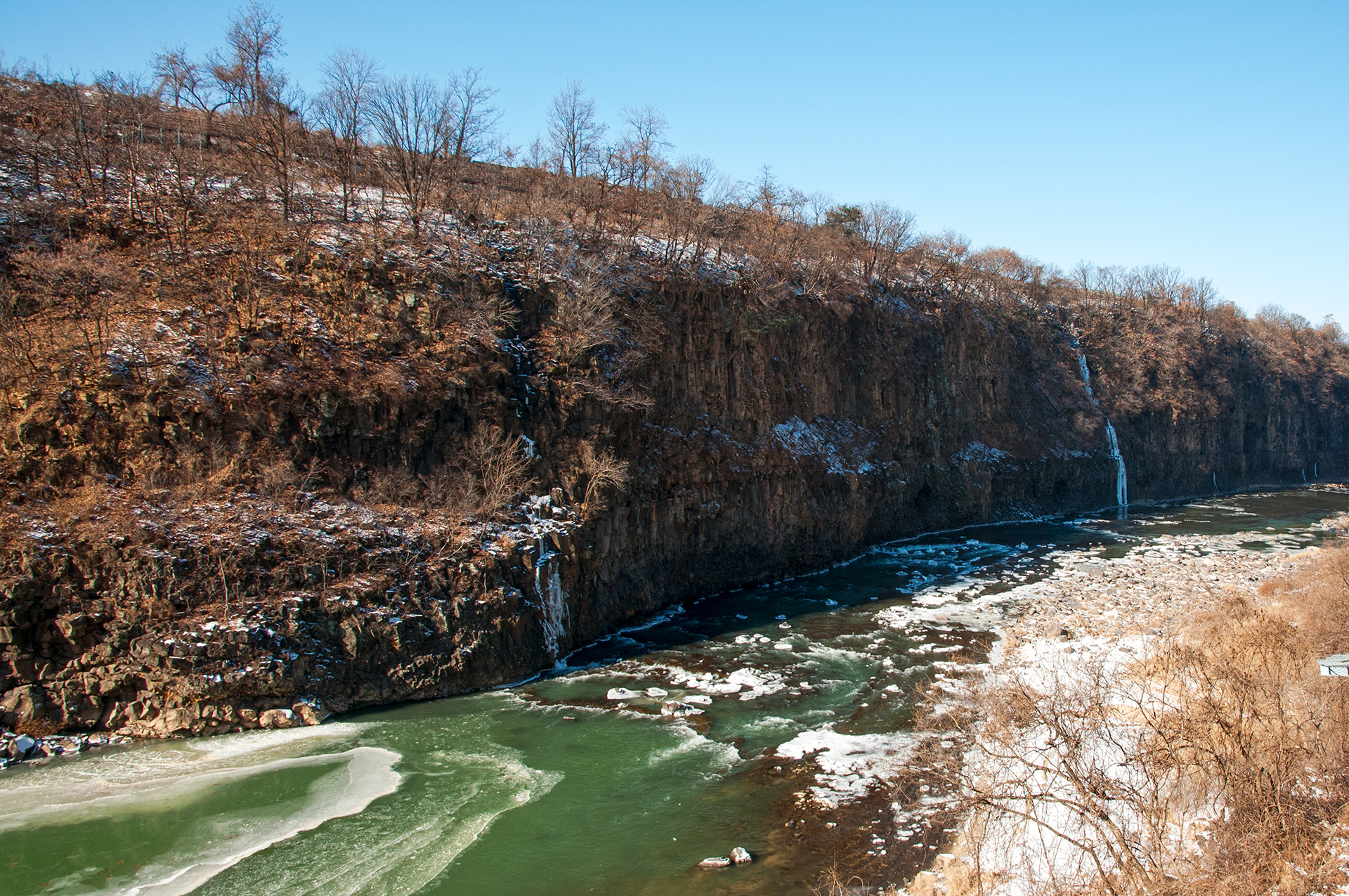 잔잔하던 강물은 추위에 얼어붙었고, 화강암 절벽은 눈이 쌓여 그림같은 풍경을 보여 준다.
