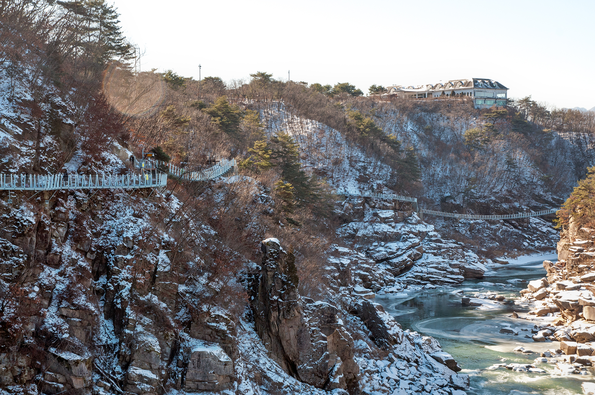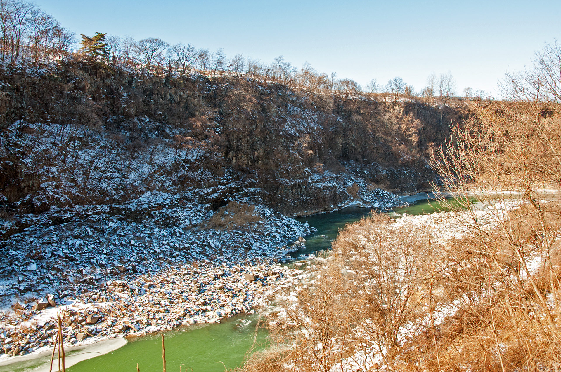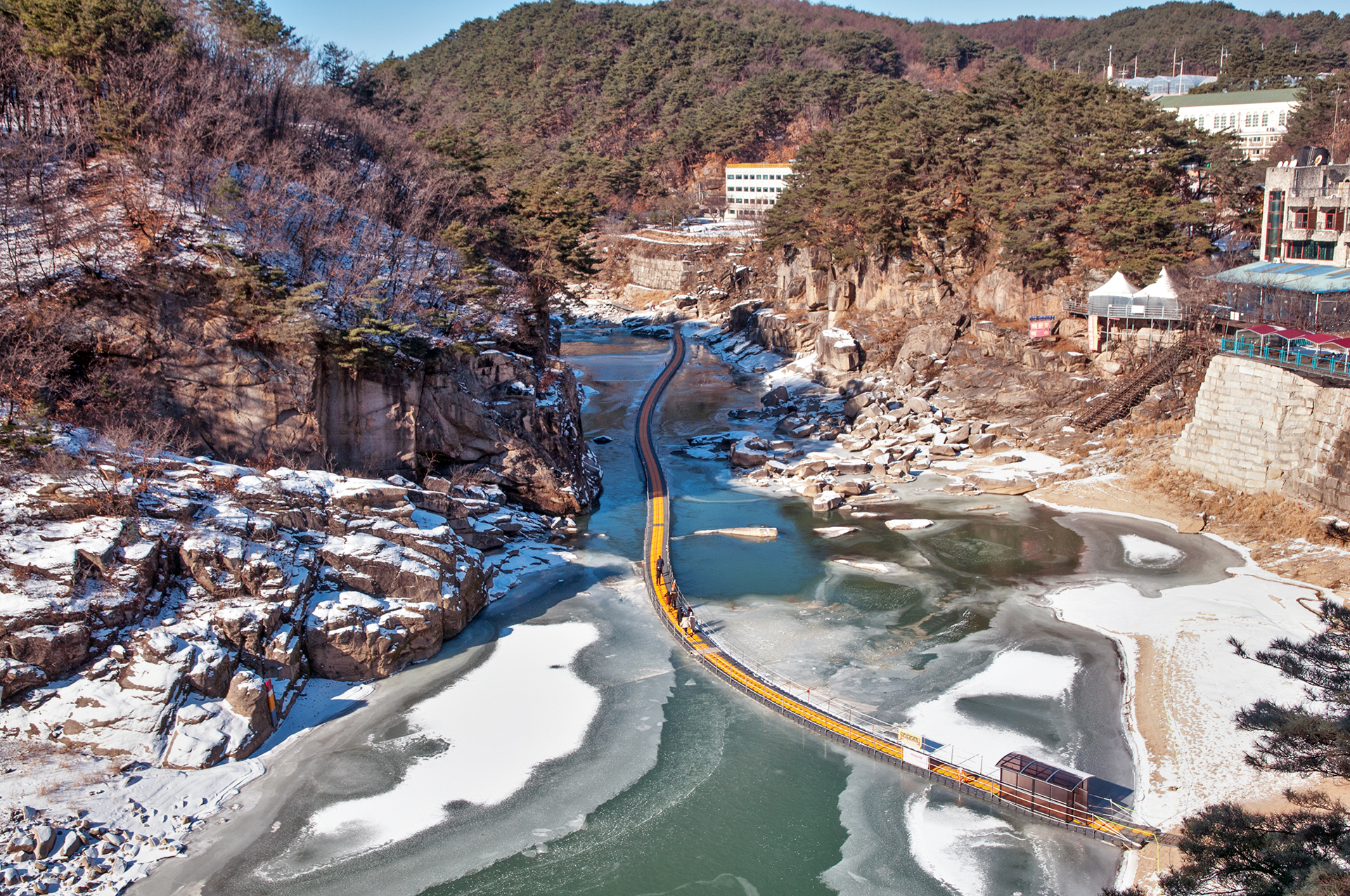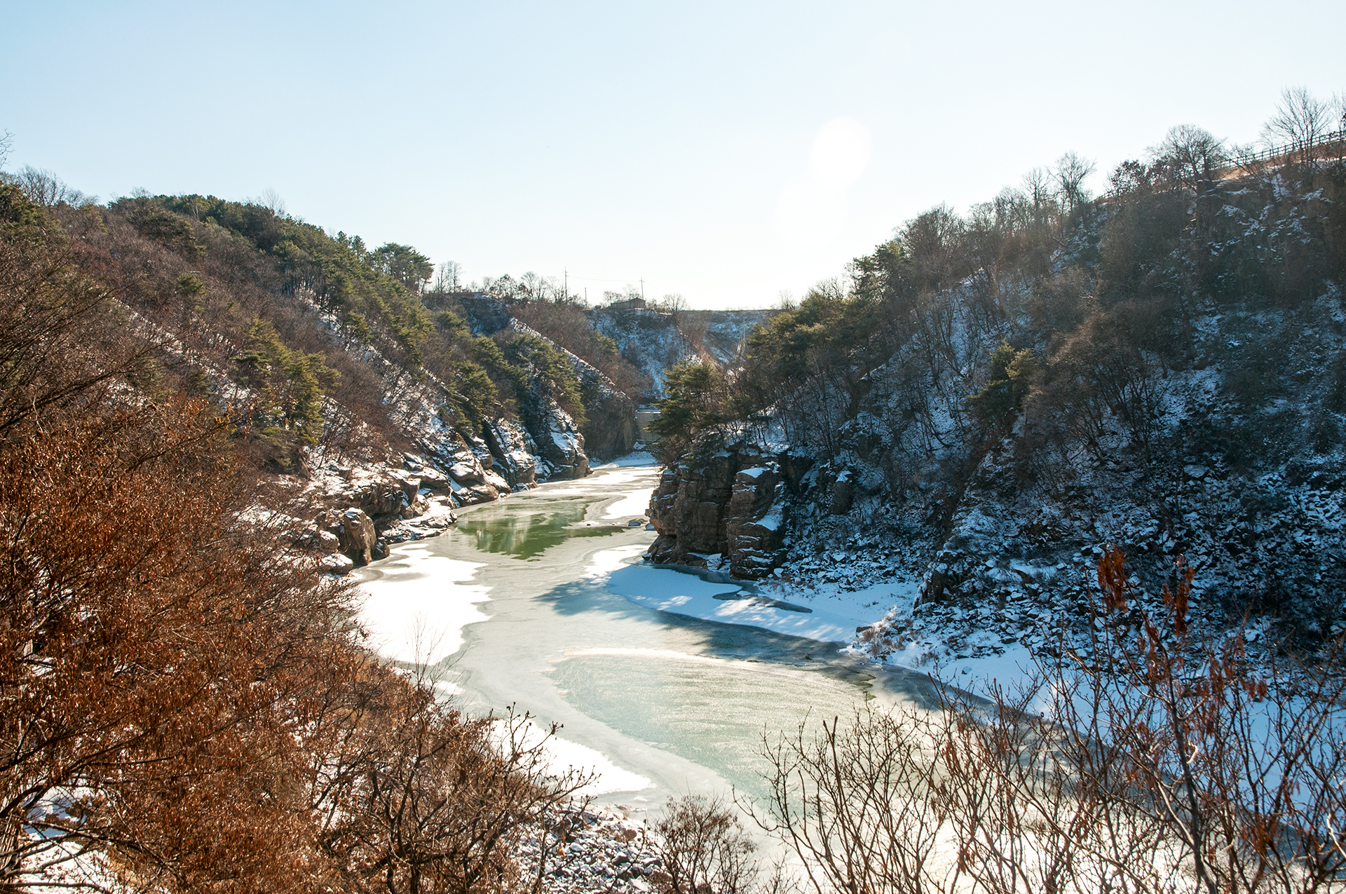 잔잔하던 강물은 추위에 얼어붙었고, 화강암 절벽은 눈이 쌓여 그림같은 풍경을 보여 준다.