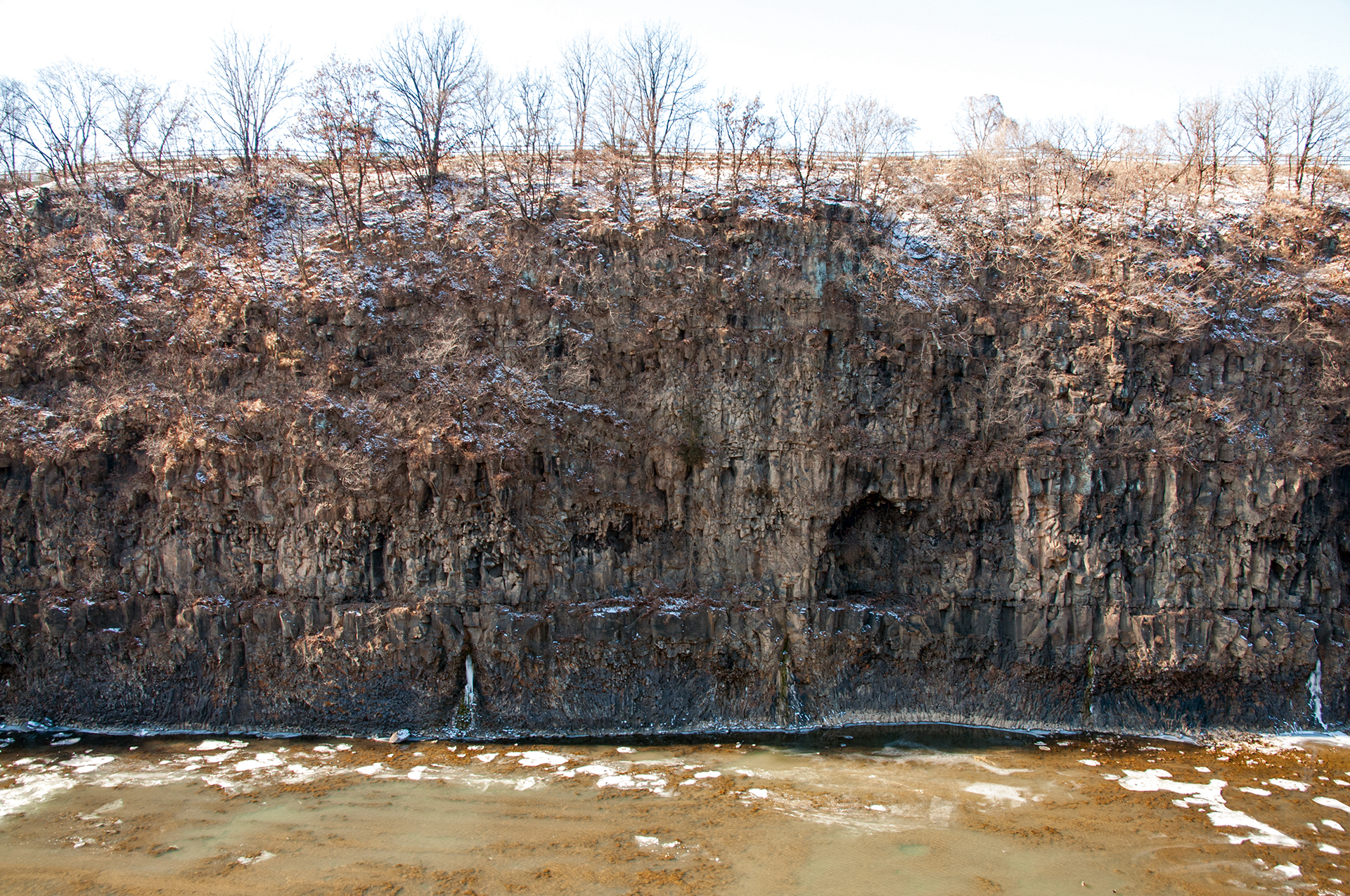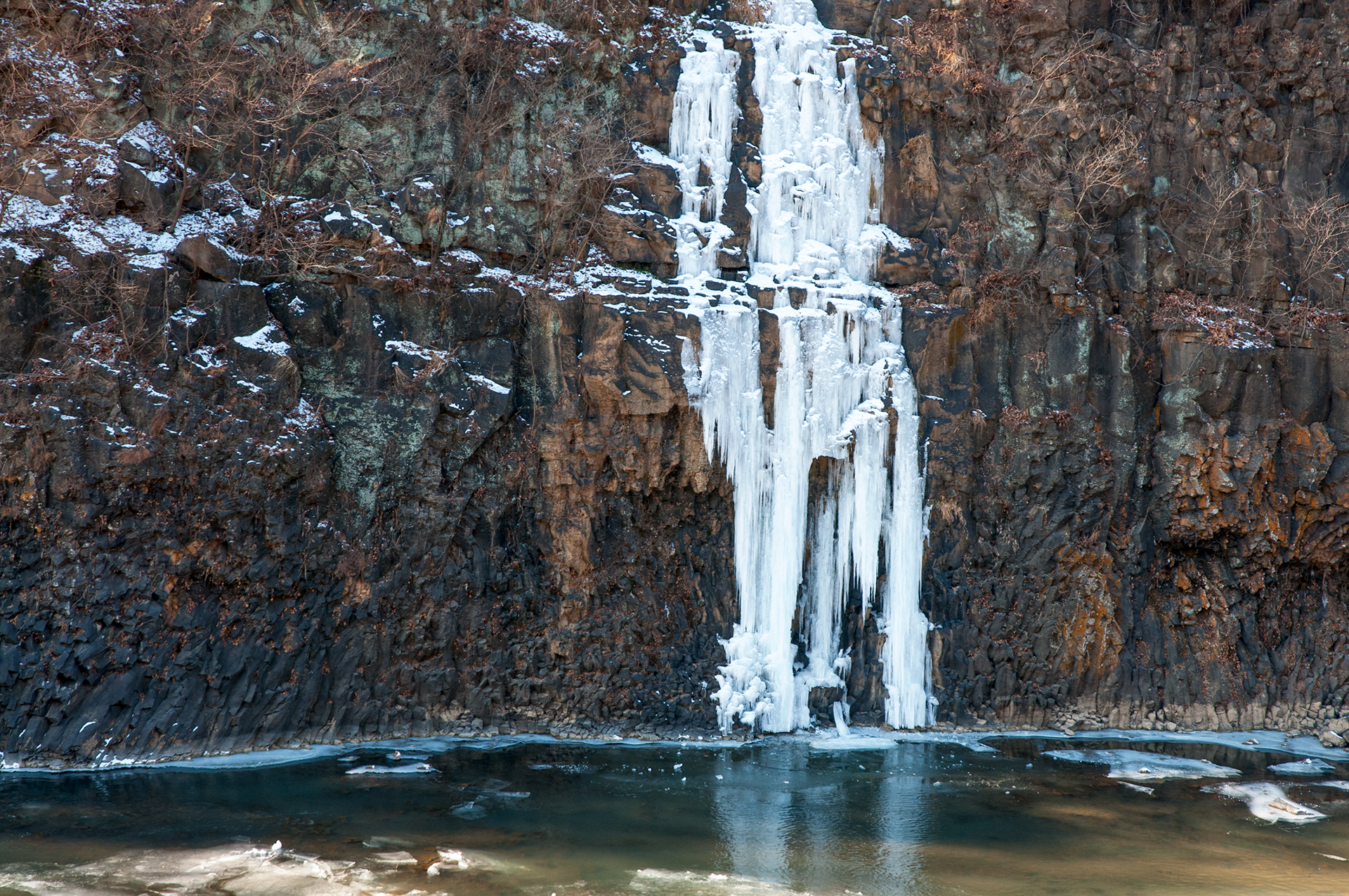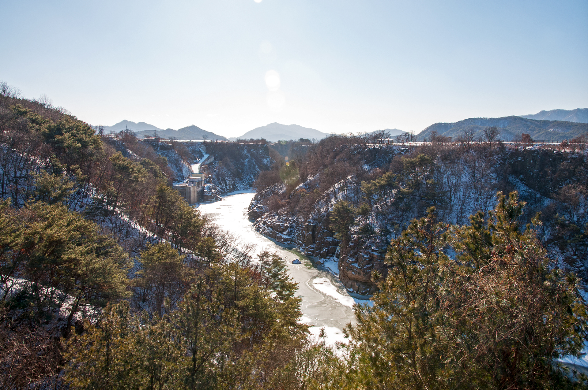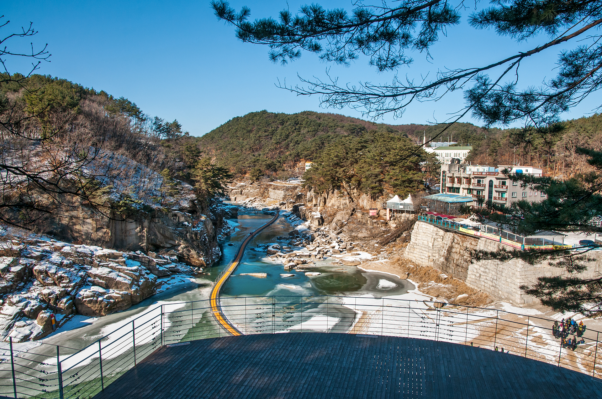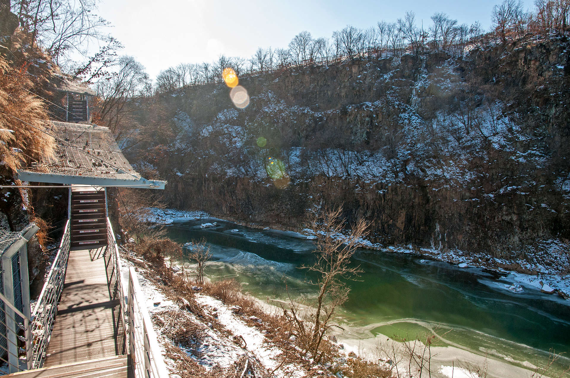 잔잔하던 강물은 추위에 얼어붙었고, 화강암 절벽은 눈이 쌓여 그림같은 풍경을 보여 준다.