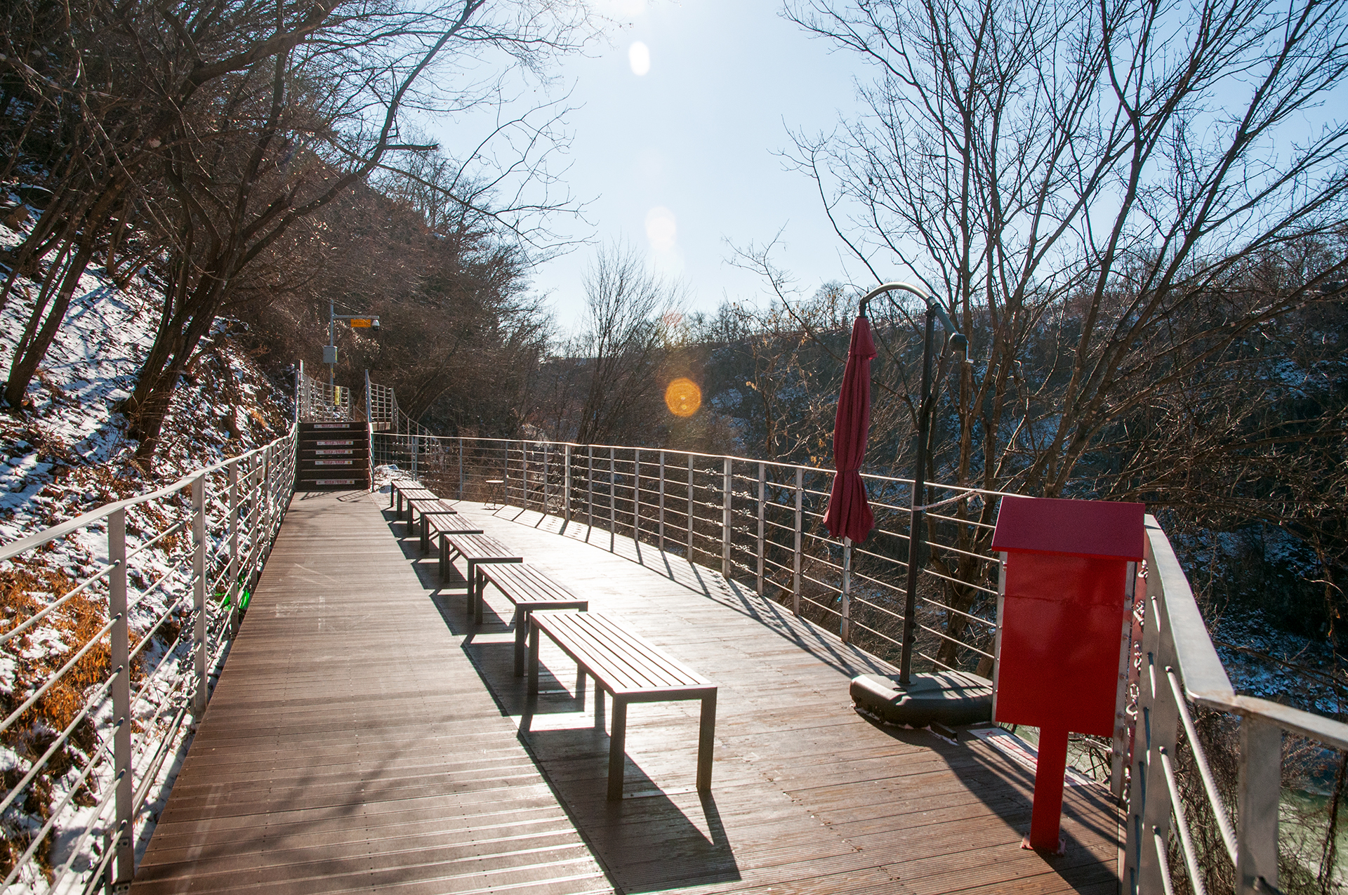 쉼터 난간에 서니 따스한 햇빛이 온몸을 감싼다.