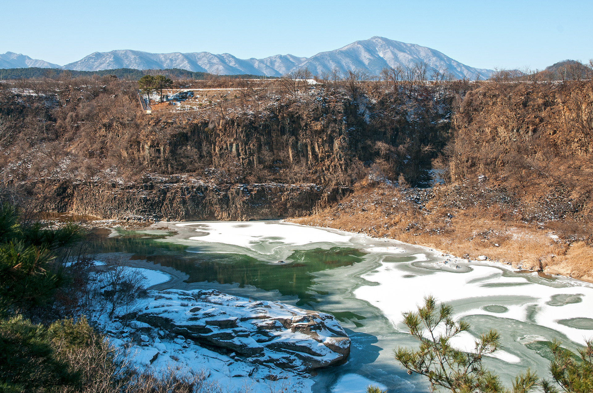쪽빛소 쉼터에서 바라본 풍경, 잔잔히 머무르는 한탄강 물결이 쪽빛을 담았다고 해 쪽빛소라고 하는데, 얼어버린 탓에 쪽빛소라 하기에도 무색하다.