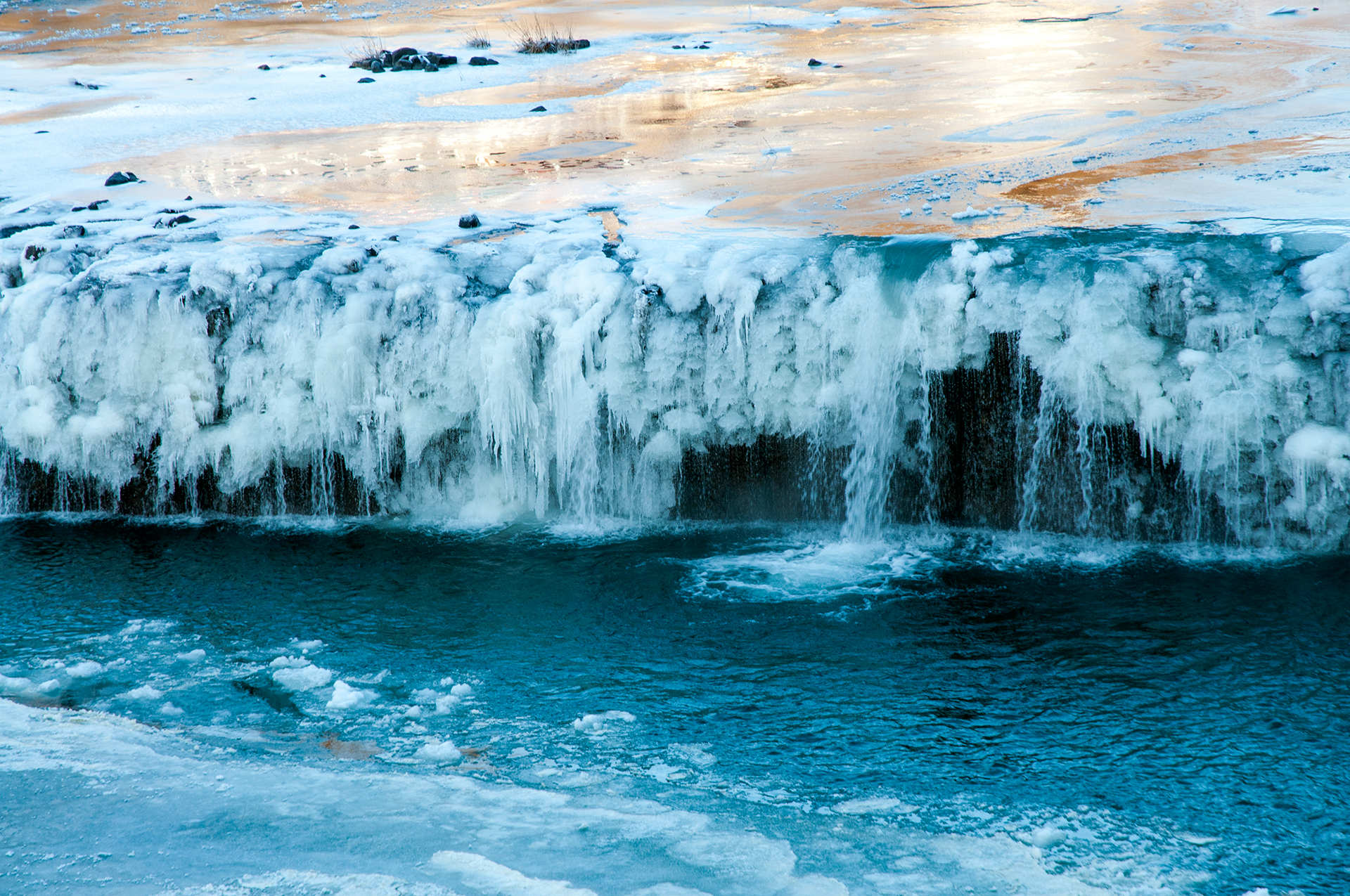 빛을 받은 강물색과 얼어붙은 얼음이 대비를 이룬다.