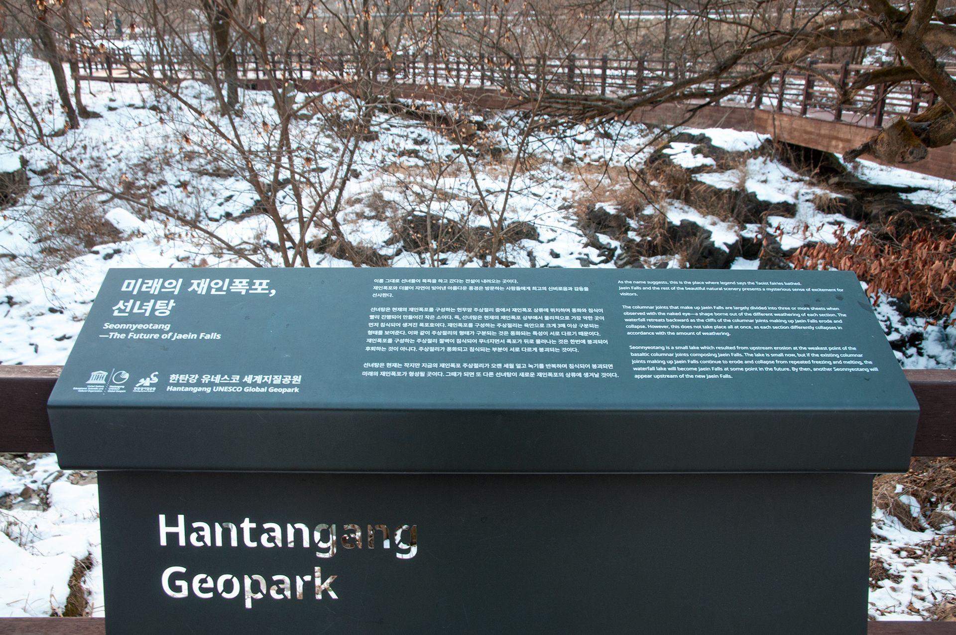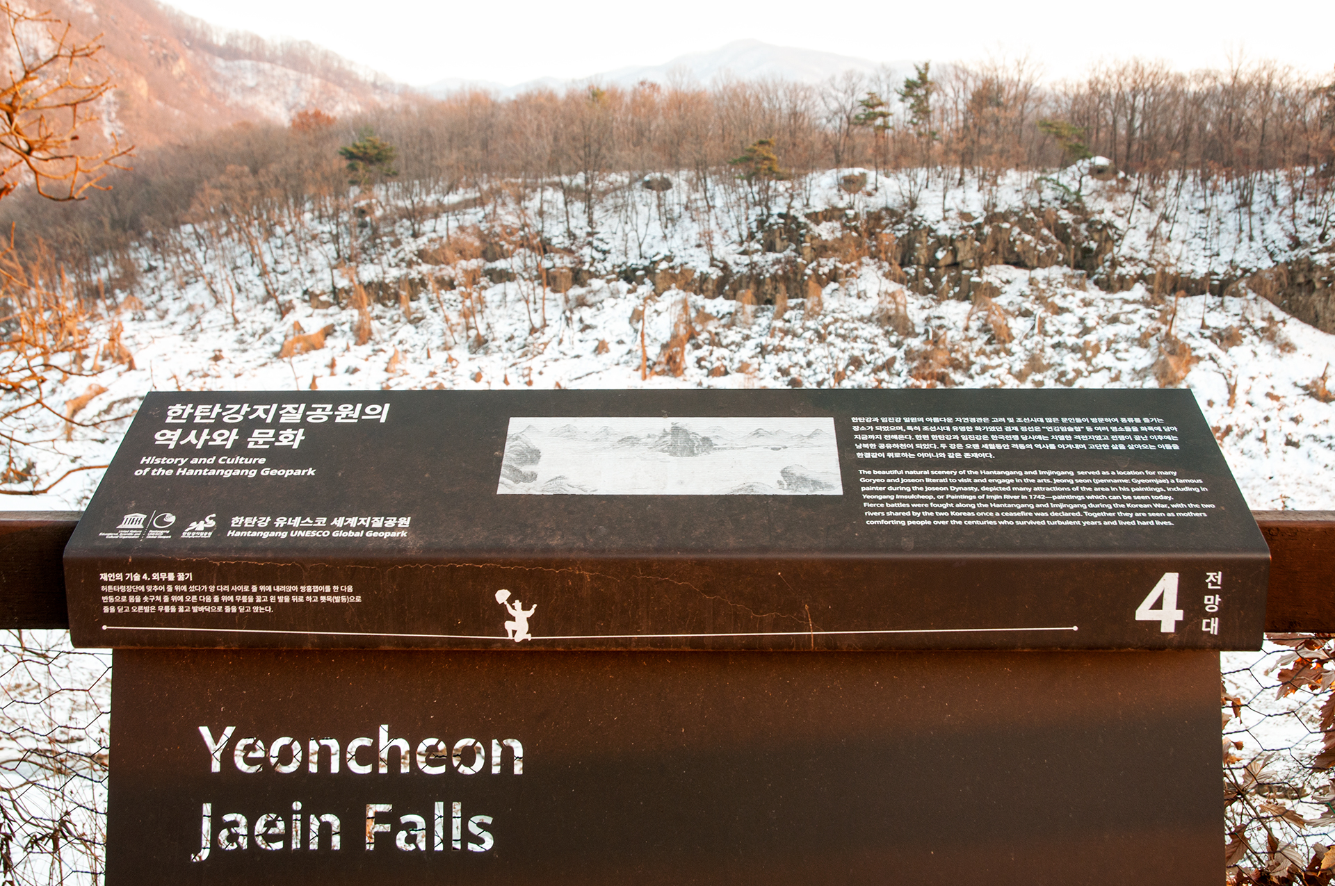 한탄강에서 가장 아름다운 지형 중의 한 곳인 재인폭포는 약 18m 높이의 현무암 주상절리 절벽으로 형성되어 있다.