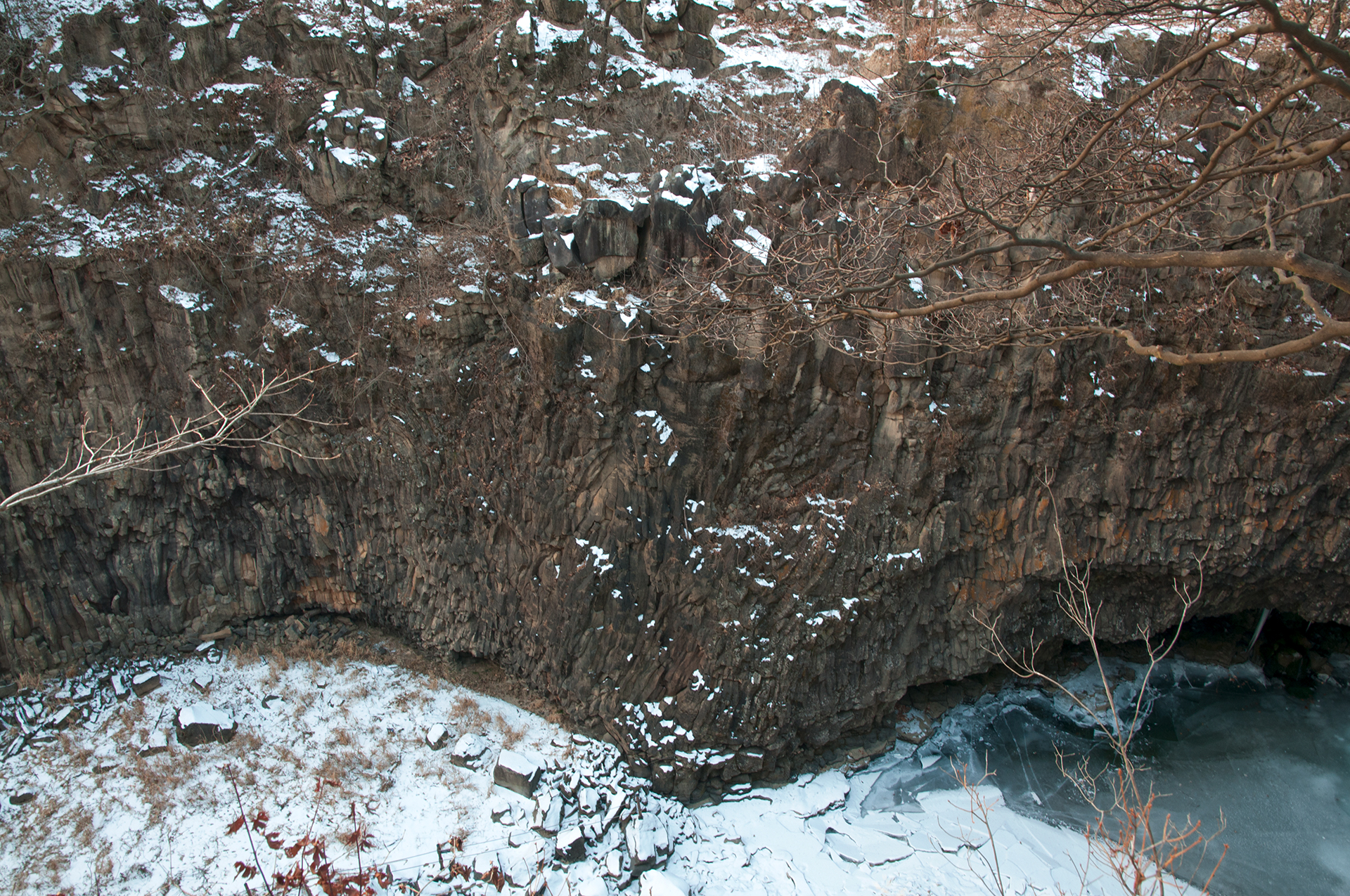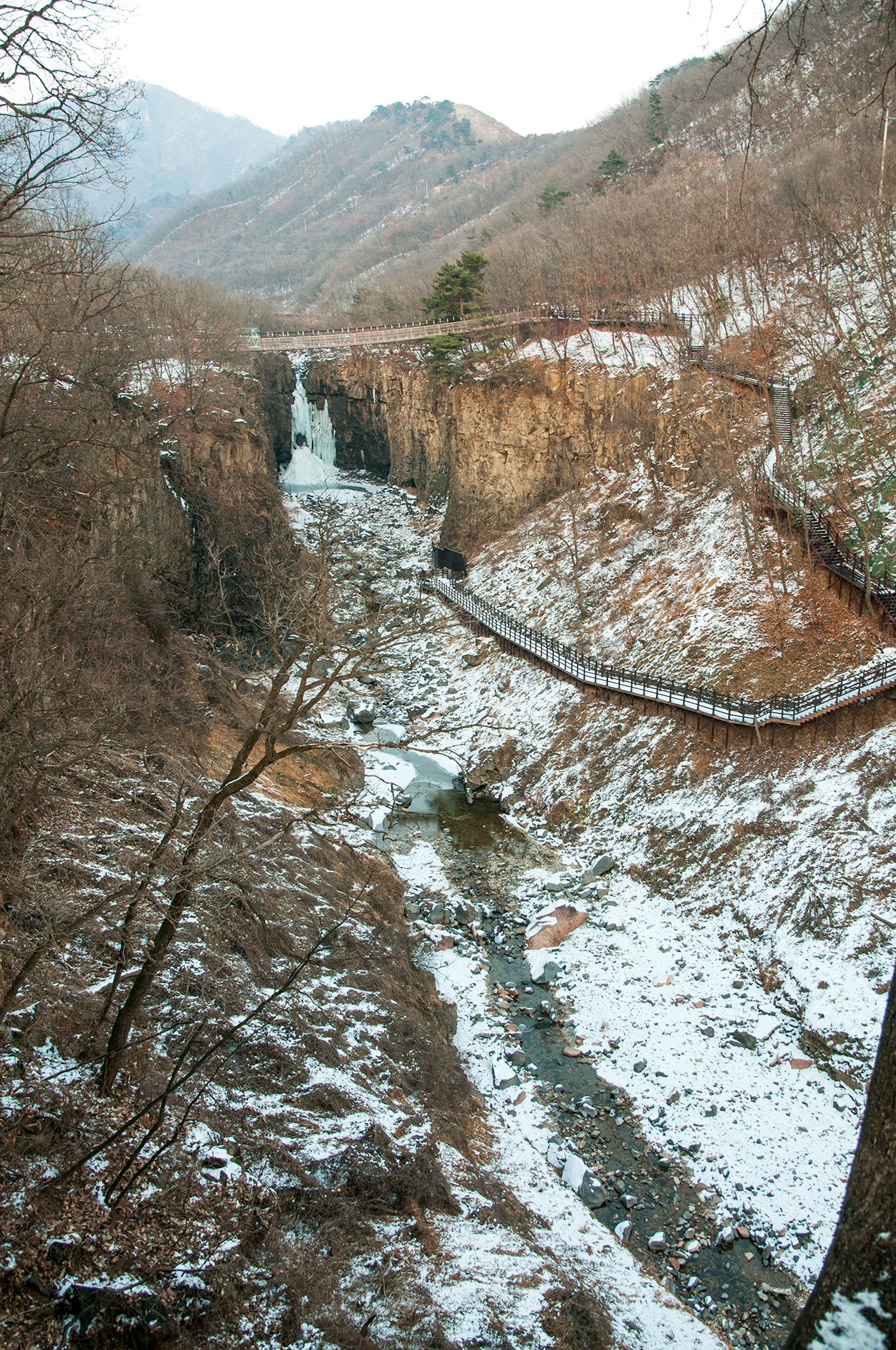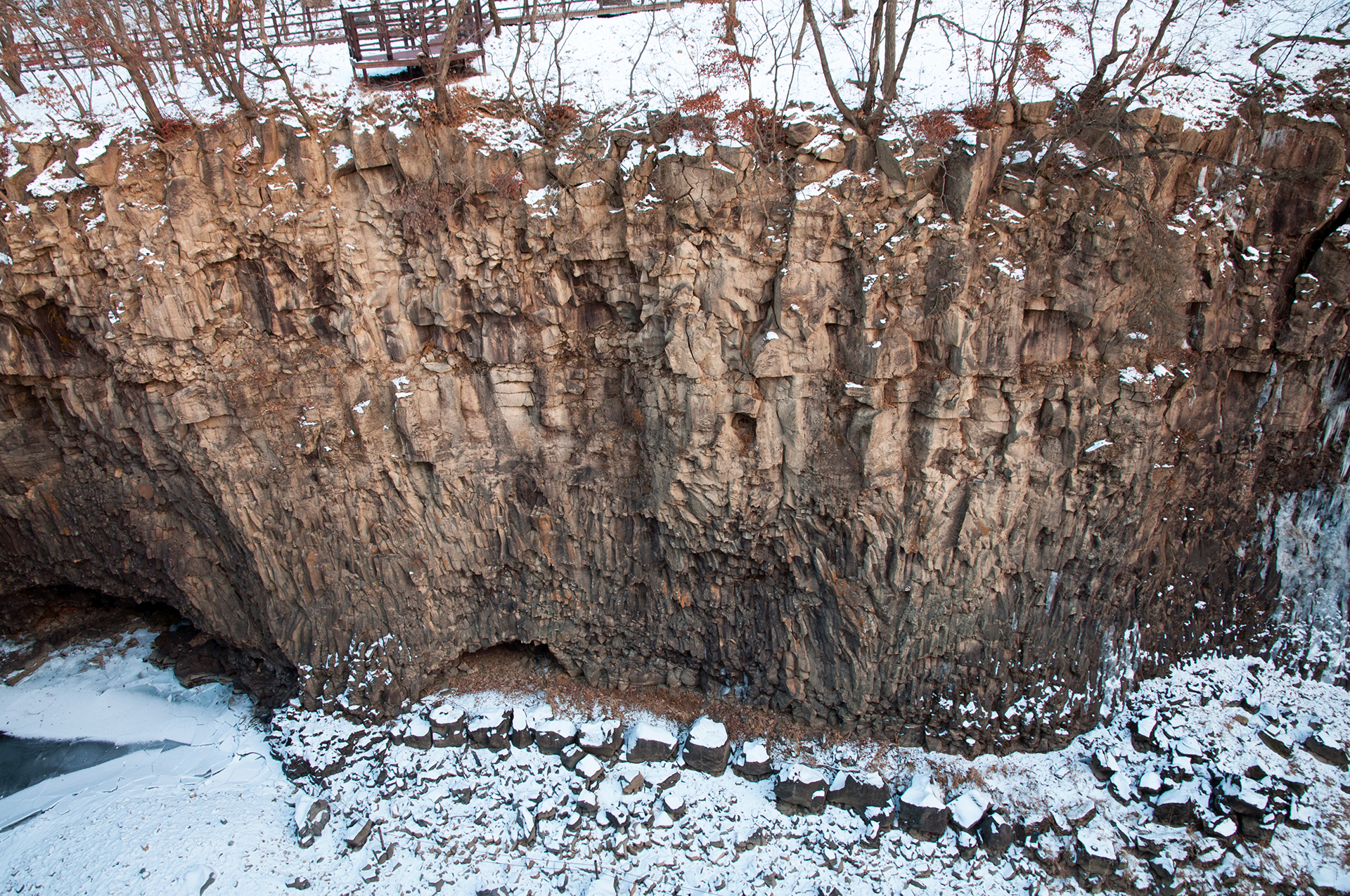 현무암 주상절리의 절벽은 폭포에서 출렁다리까지 이어지며 협곡을 형성하고 있다.