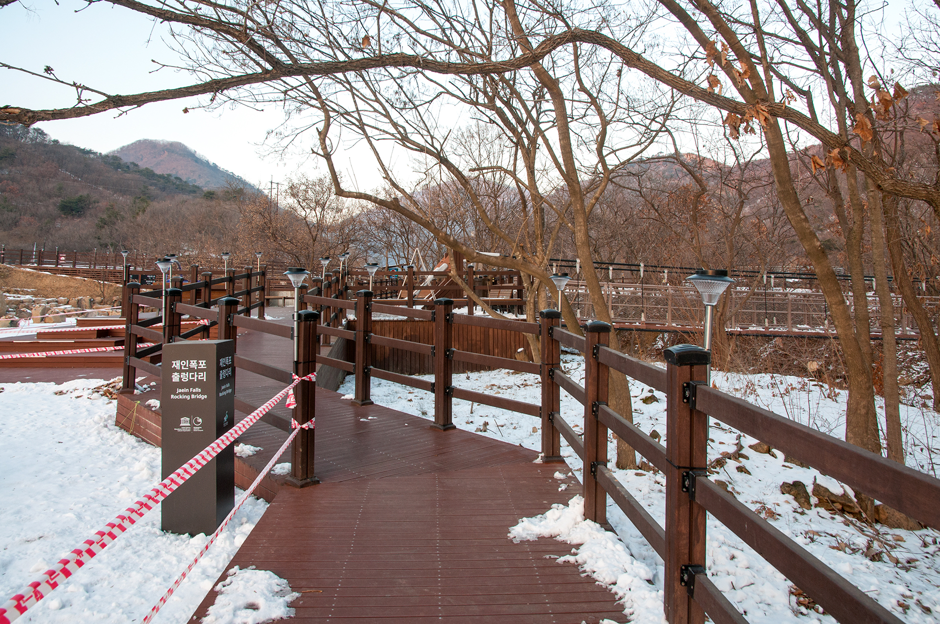 재인폭포를 가로지르는 출렁다리가 협곡 위에 걸쳐있고, 아래로 내려가는 데크 계단이 놓여있다.