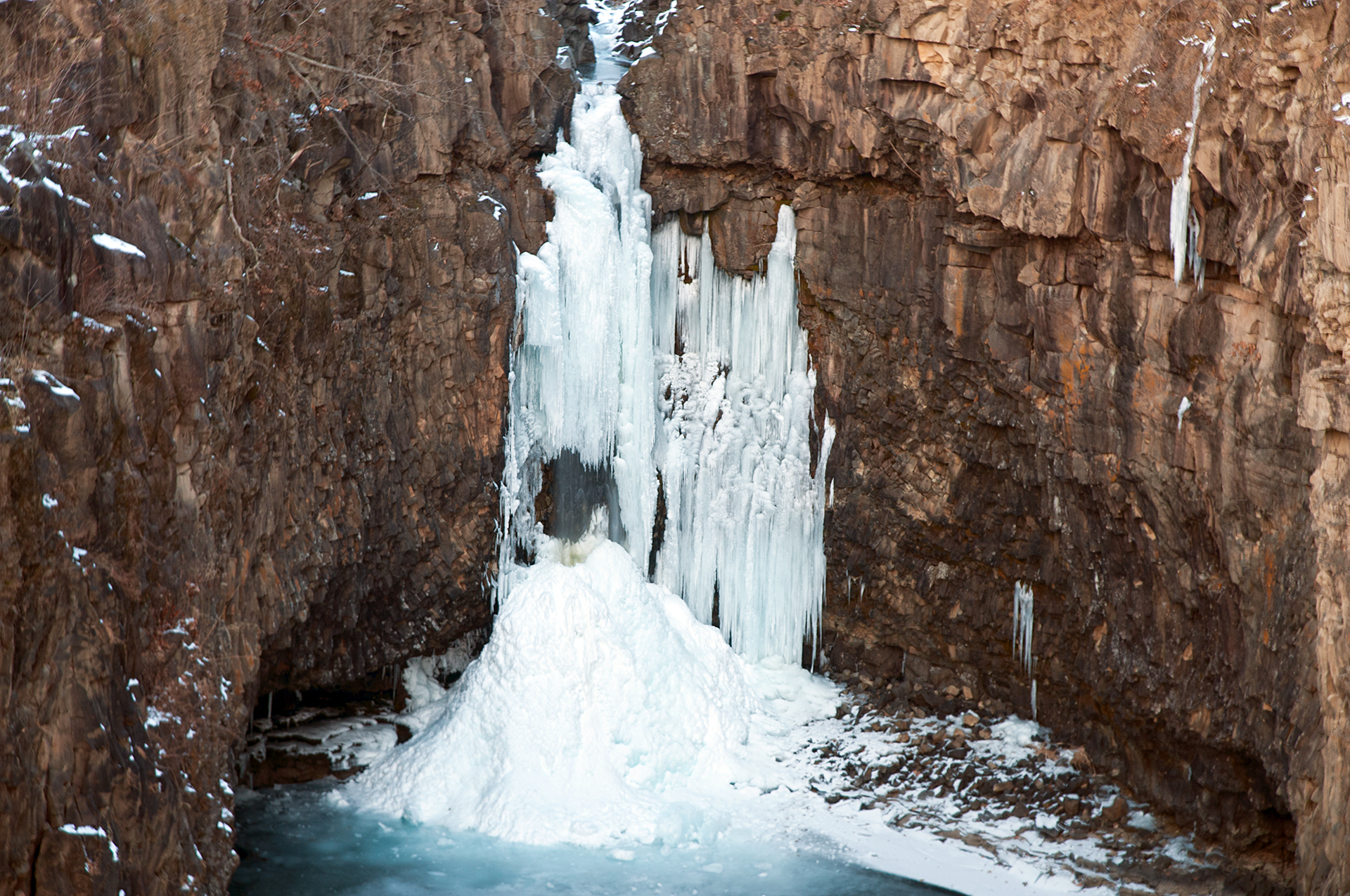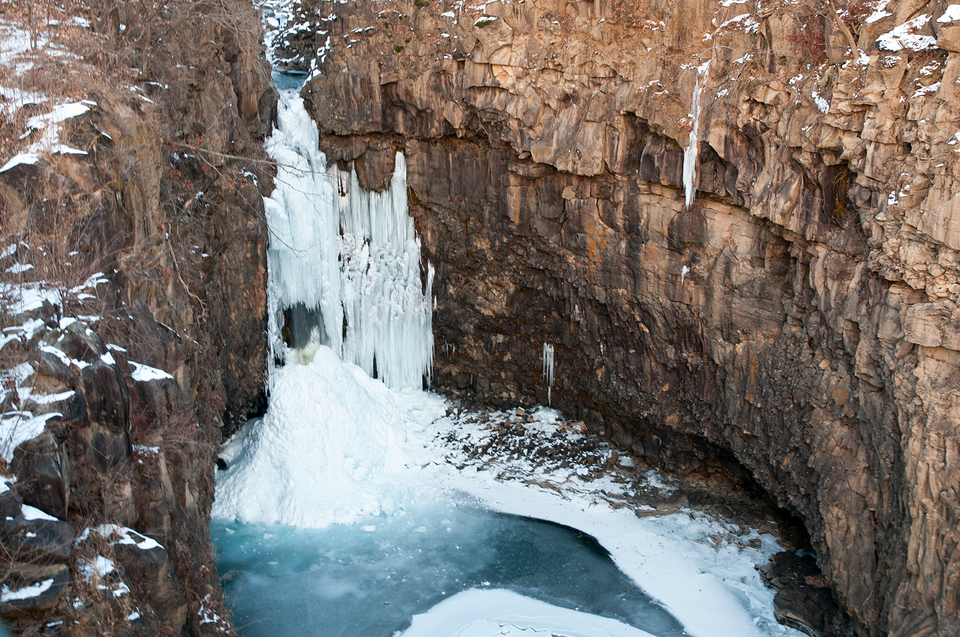 폭포 앞에 하얗게 소복히 쌓인 눈과 얼음기둥을 형성하고 있는 재인폭포의 모습