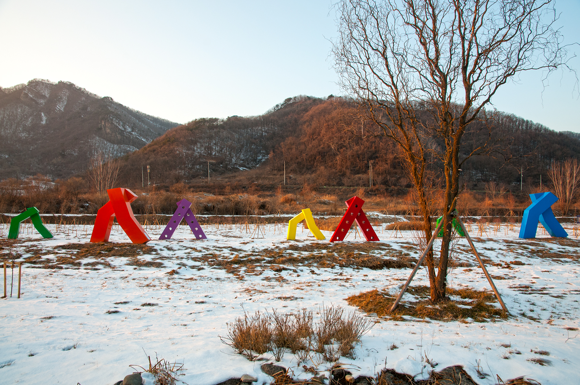 인간의 걷는 모습을 단순화시켜 한자의 사람인(人)과 한글의 시옷(ㅅ), 알파벳의 엑스(X)등 상징적 언어를 시각적으로 극대화한 작품이다.