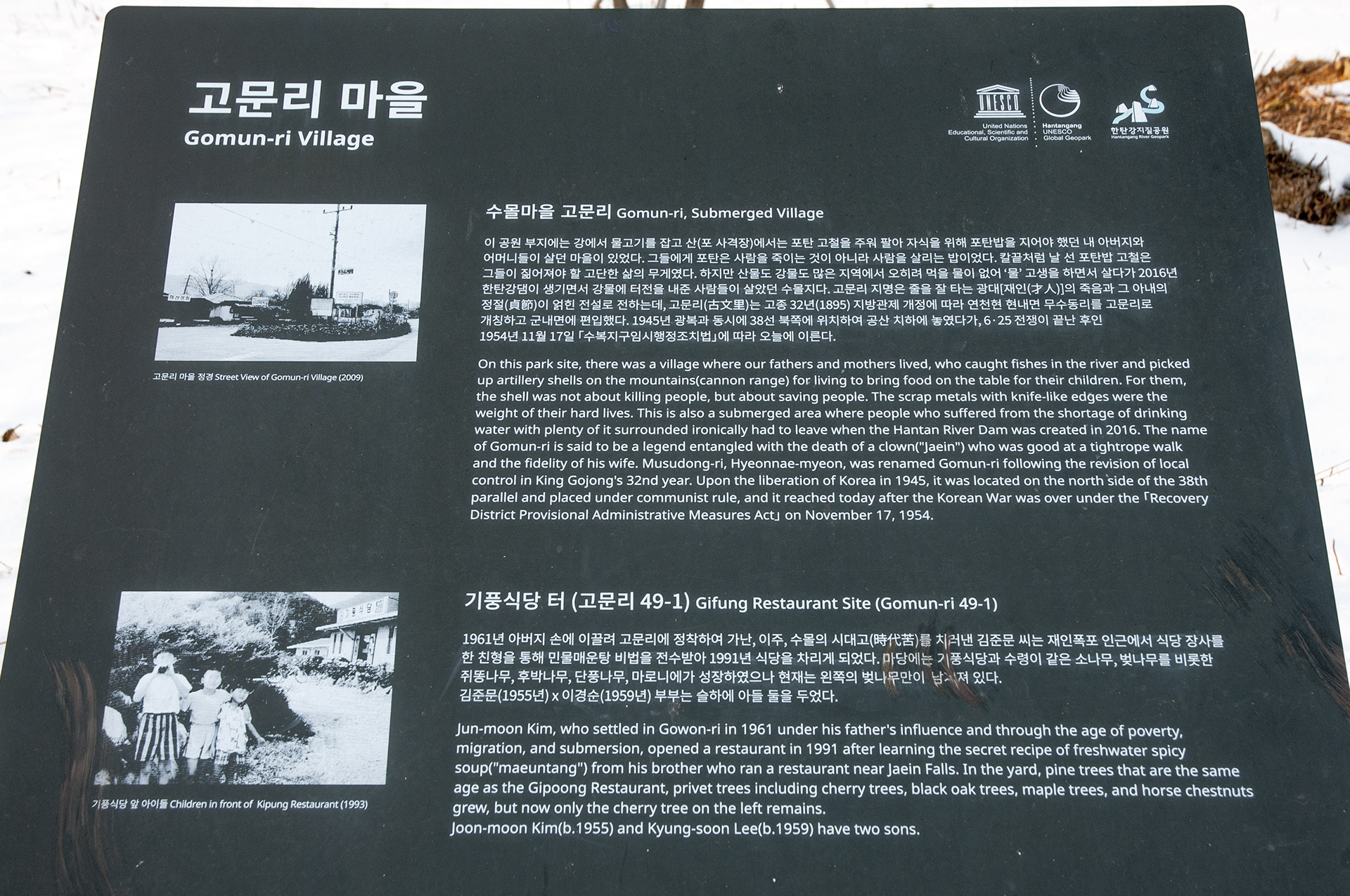 이 공원 부지에는 강에서 물고기를 잡고, 산에서는 포탄 고철을 주워 팔아 자식을 위해 포탄밥을 지어야 했던 고문리 마을이 있었다.