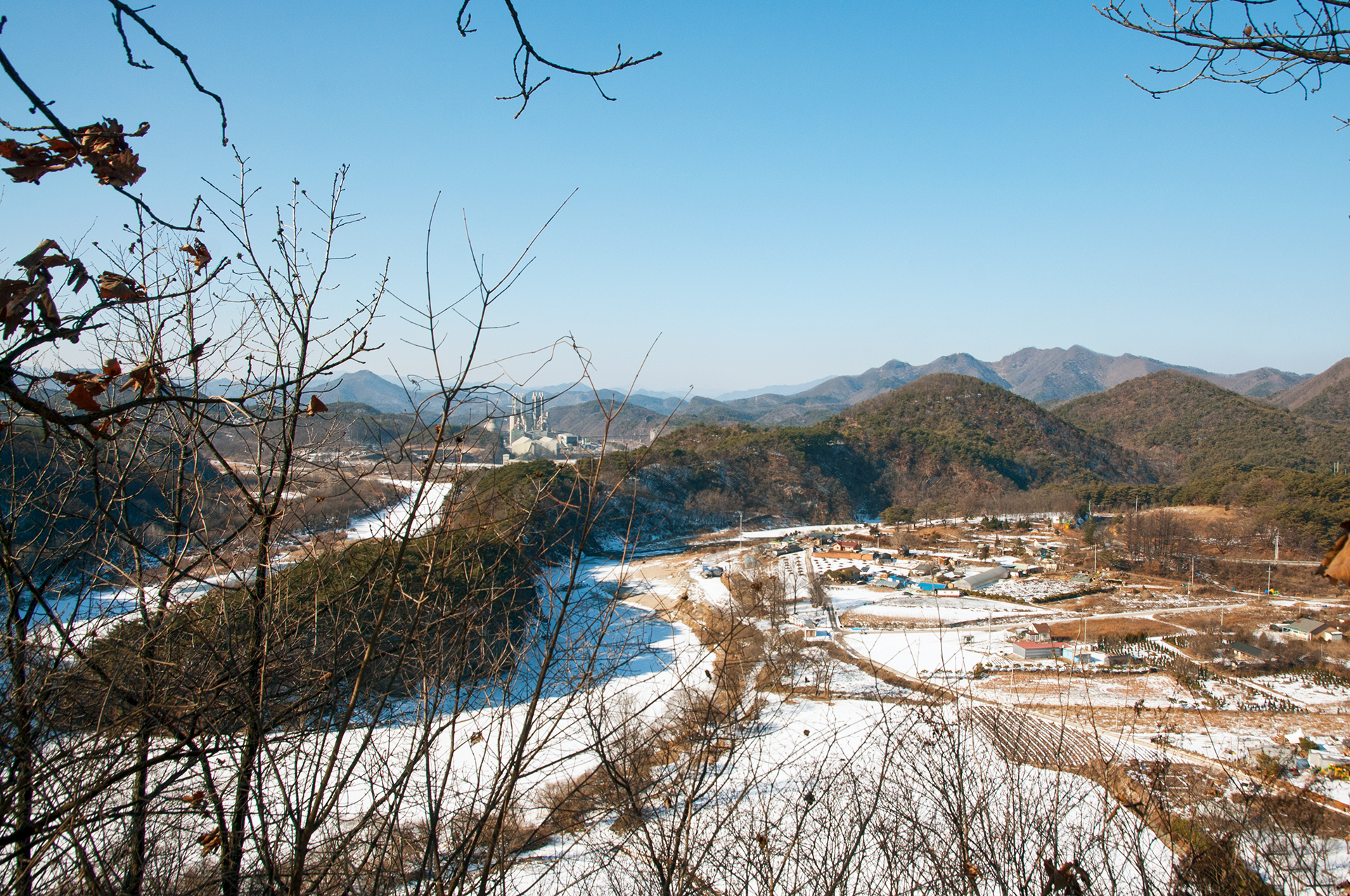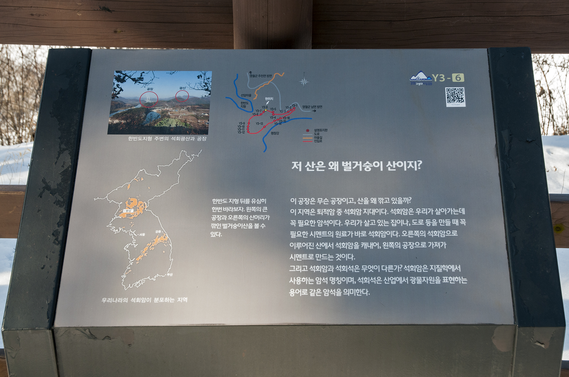 시멘트 원료인 석회암을 채석하는 석회광산이 있어 벌거숭이 산이 되었다는 안내를 읽어볼수 있고 왼쪽으로 시멘트 공장도 보인다.