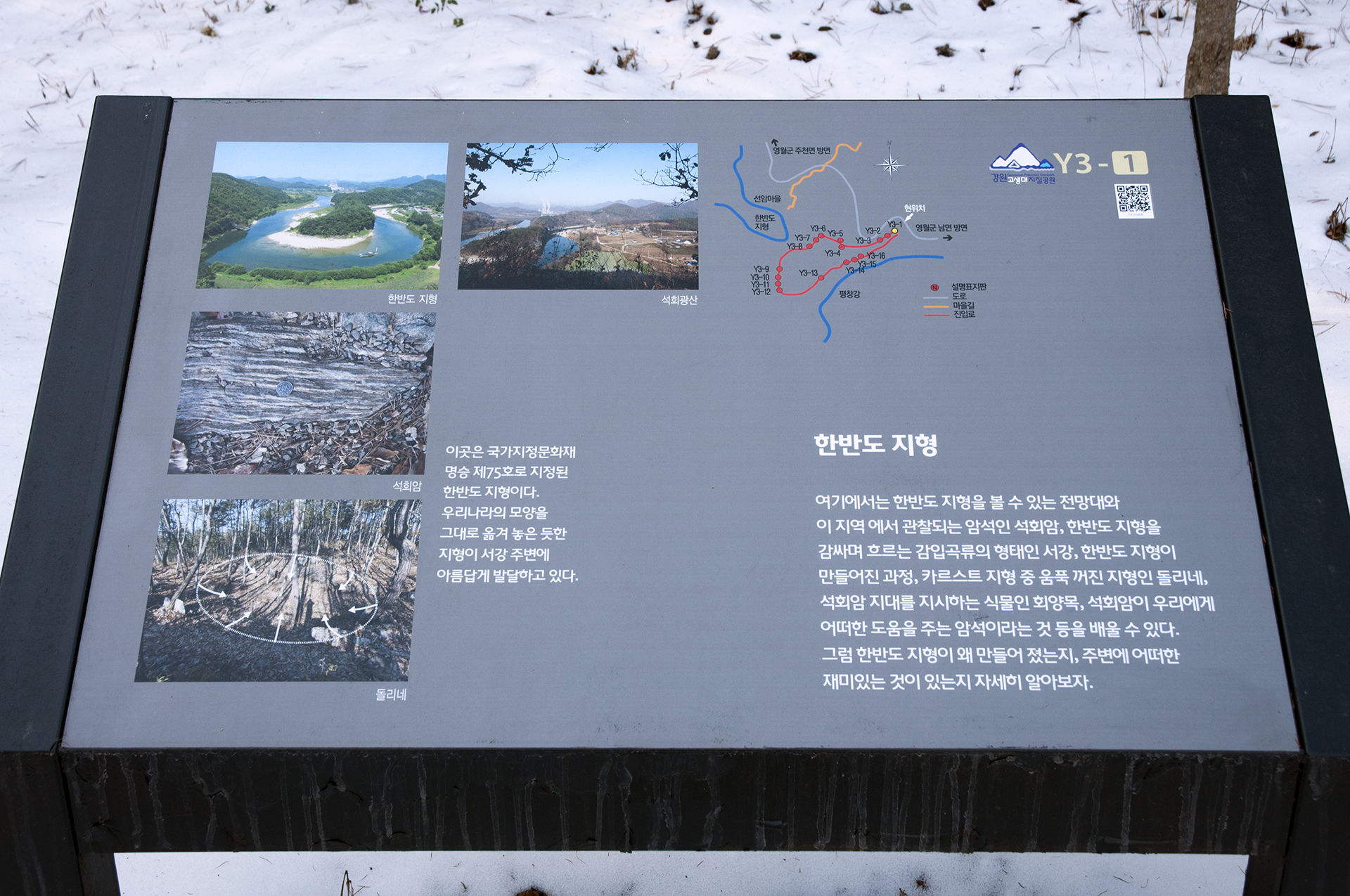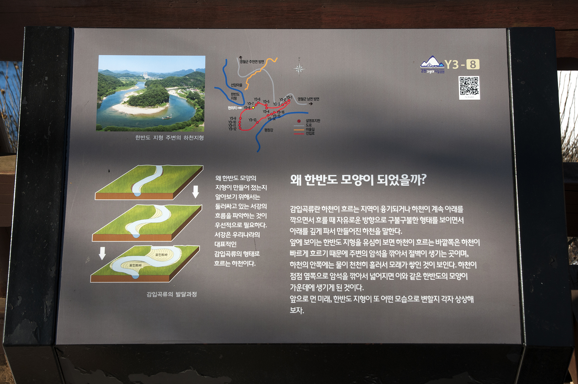 우리가 살고있는 한반도 모양을 그대로 옮겨 놓은 듯한 지형을 볼수 있는 전망대까지 탐방로를 걷는 코스로 왕복 40분 정도 소요된다.