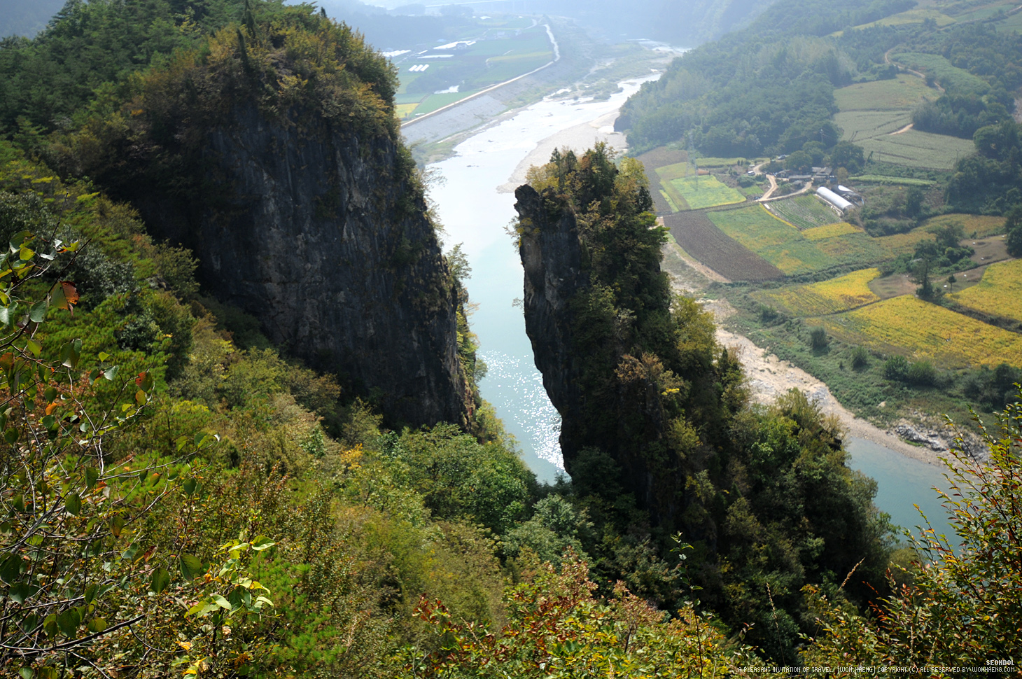 울산, 부산 쯤의 위치로 보이는 곳에 기암절벽은 하천의 유속이 빨라 암석을 깎아서 절벽이 생겼다고 한다.
