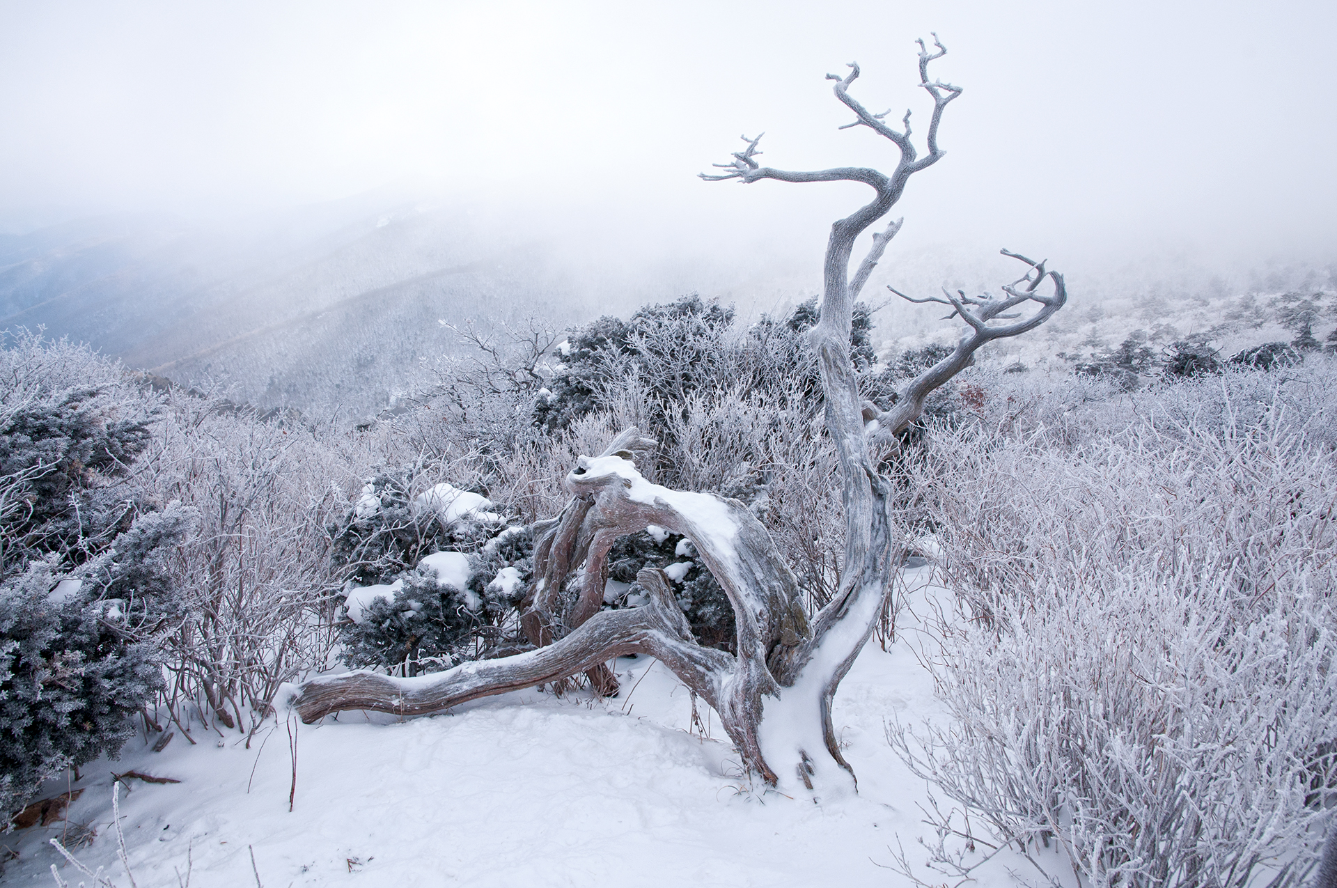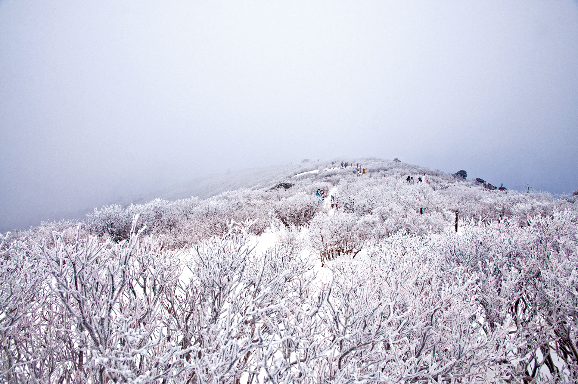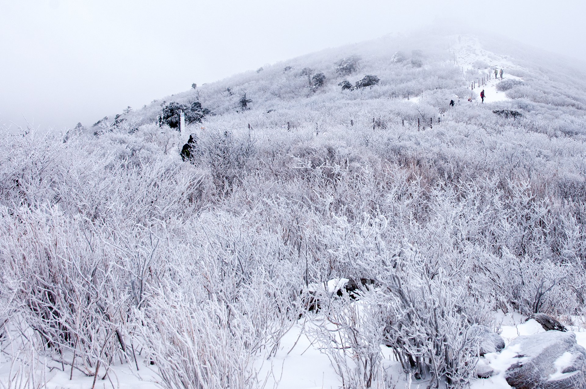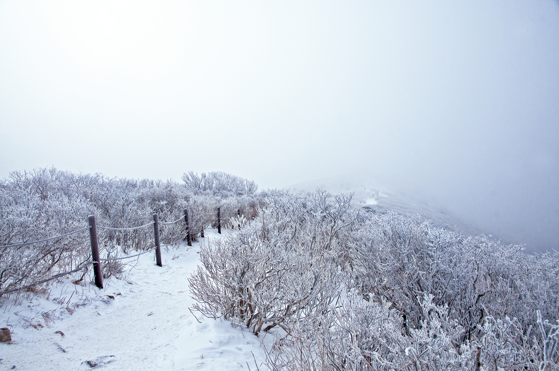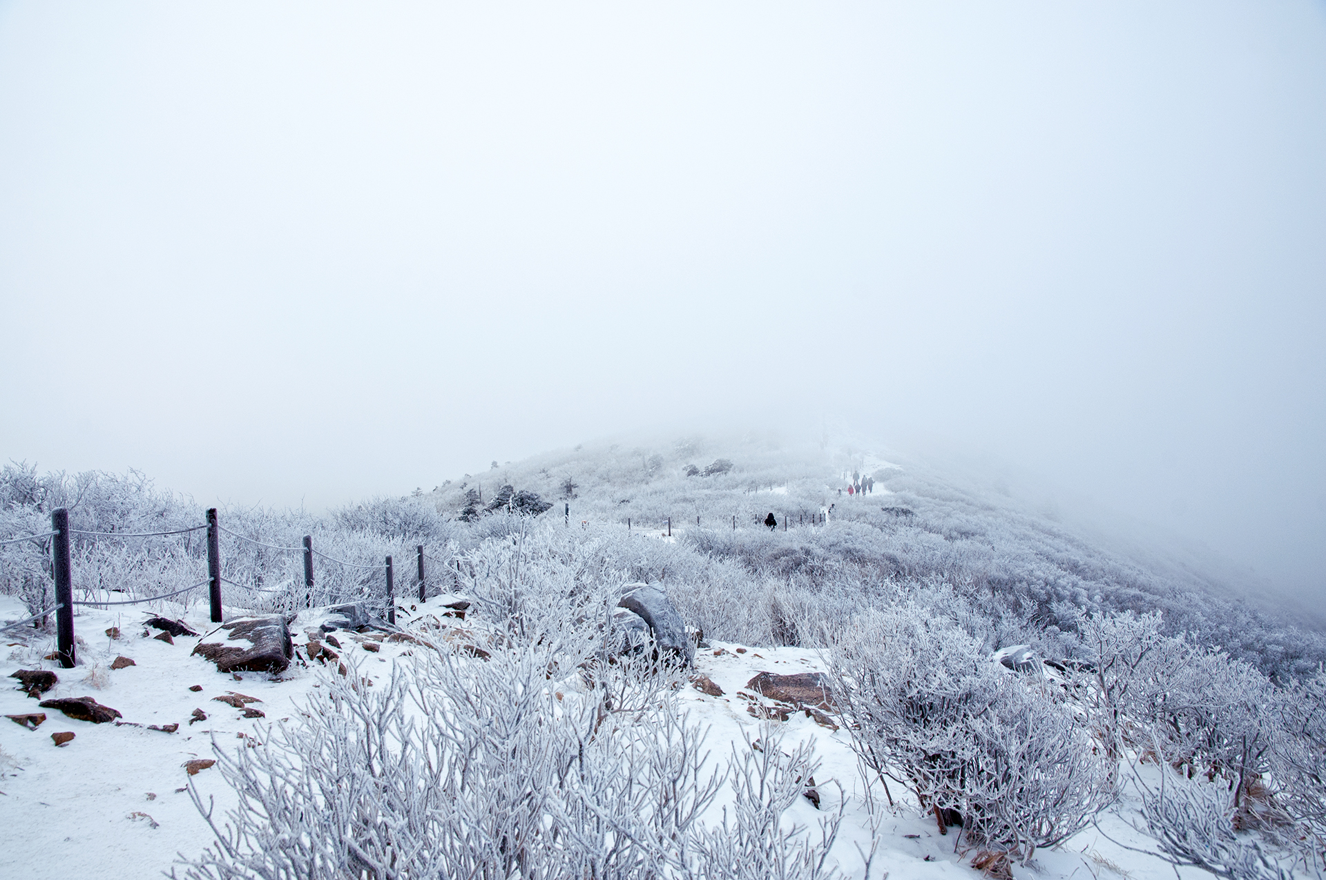 안개와 바람소리가 어울어져 온통 하얗게 얼어붙은 상고대가 혼자보기 아까울 정도다.
