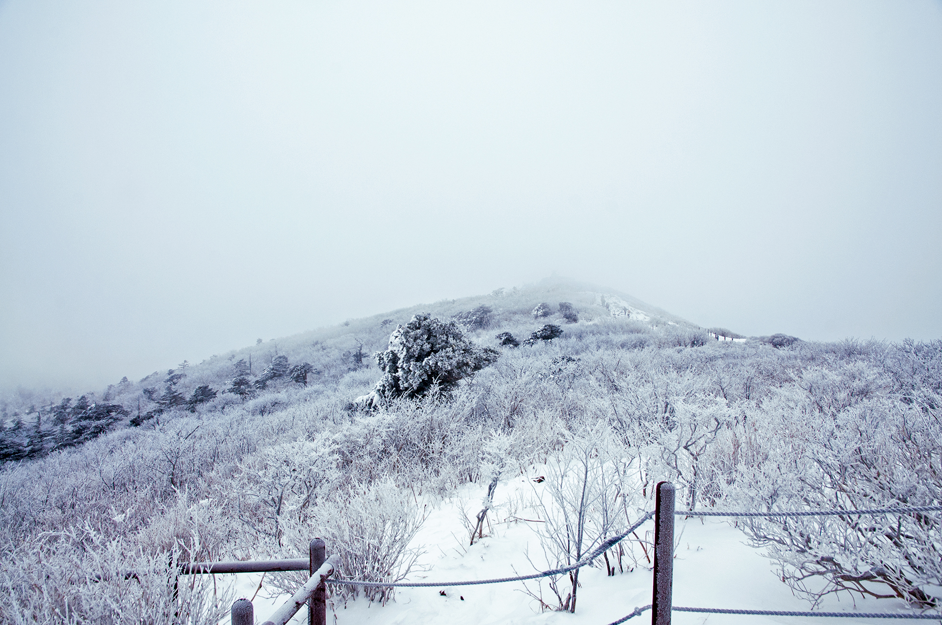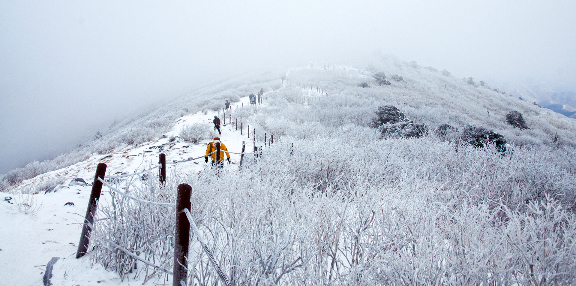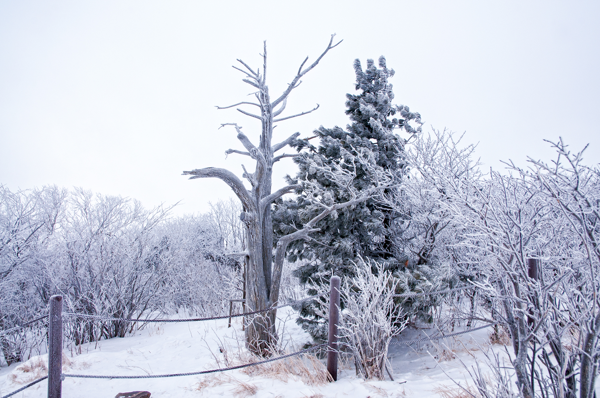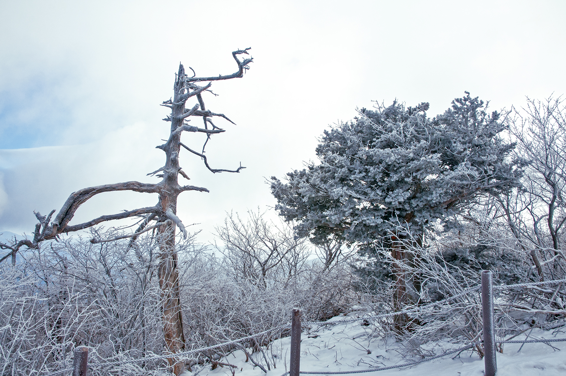 안개와 바람소리가 어울어져 온통 하얗게 얼어붙은 상고대가 혼자보기 아까울 정도다.