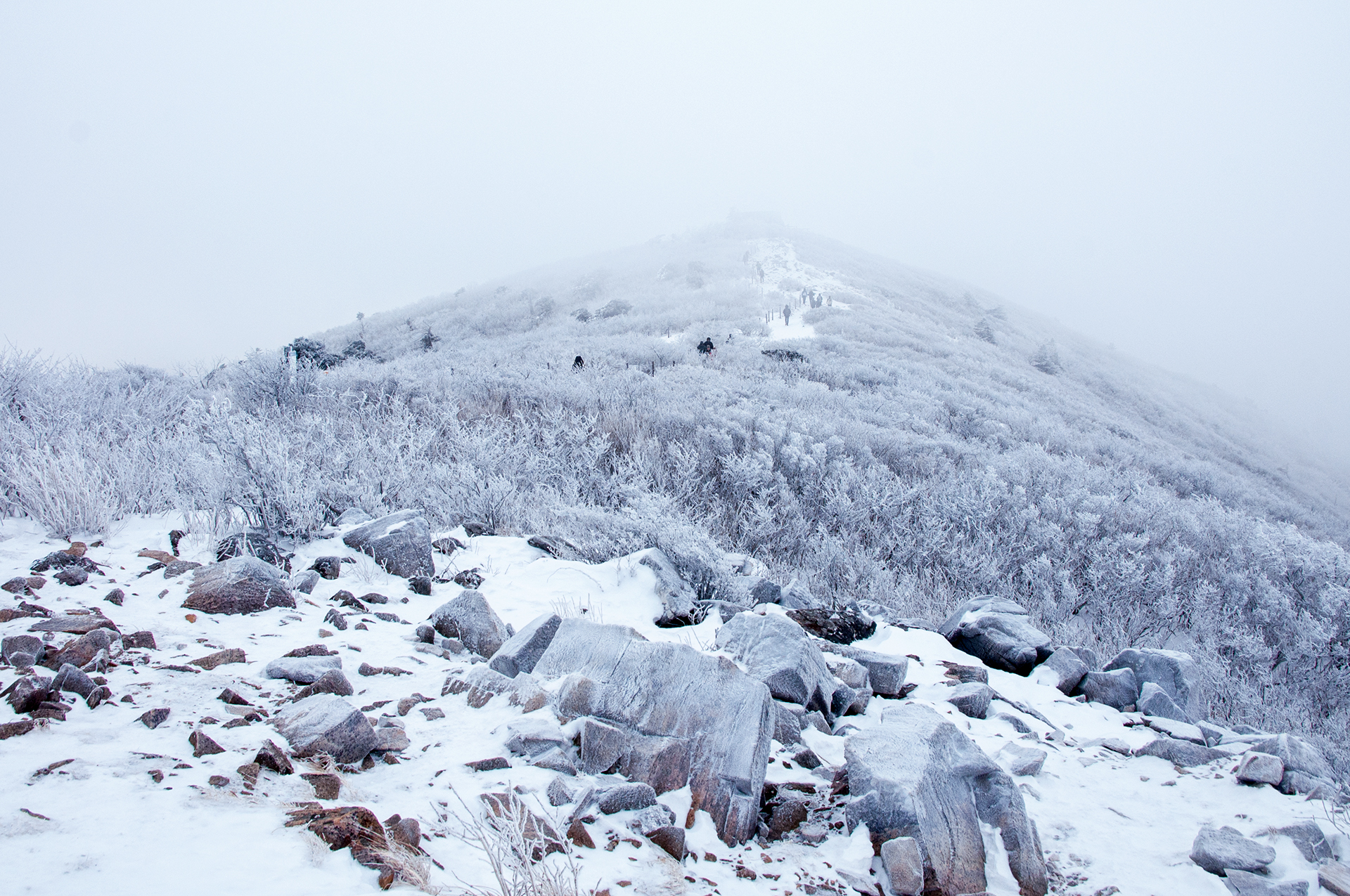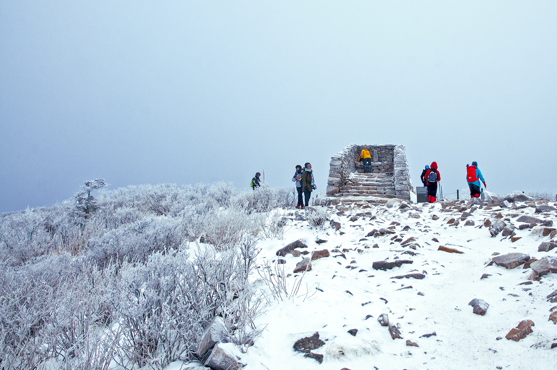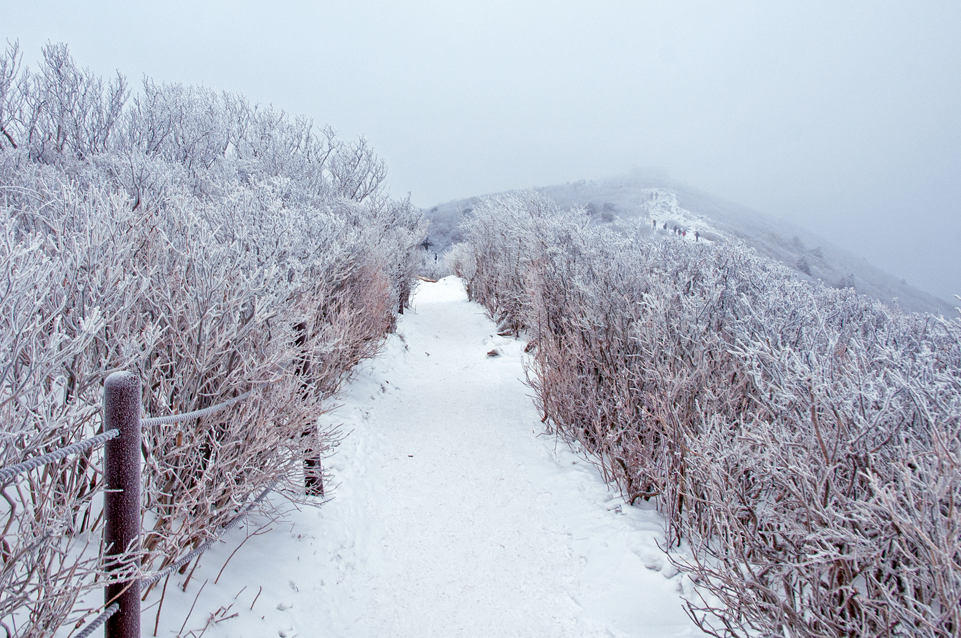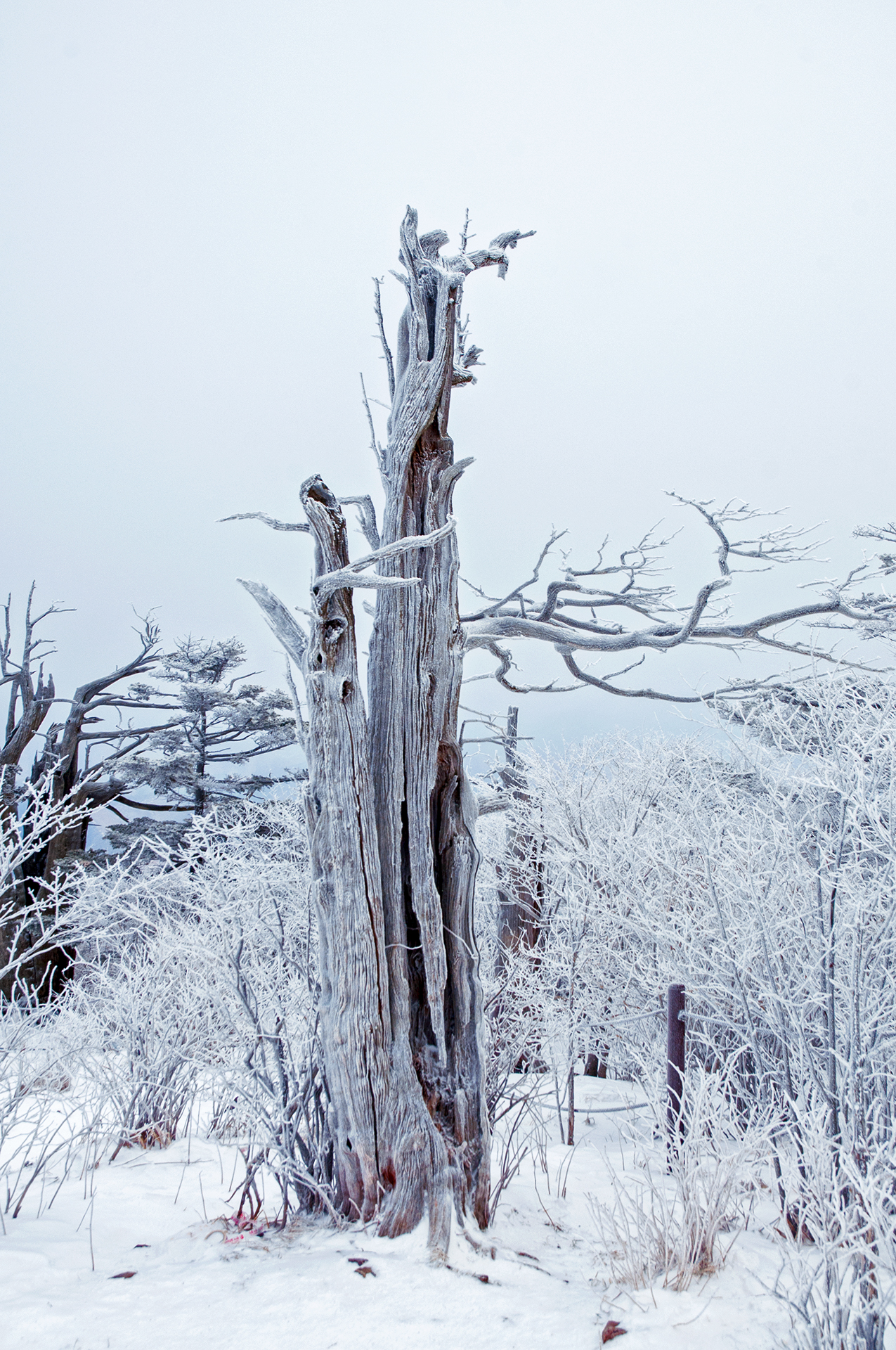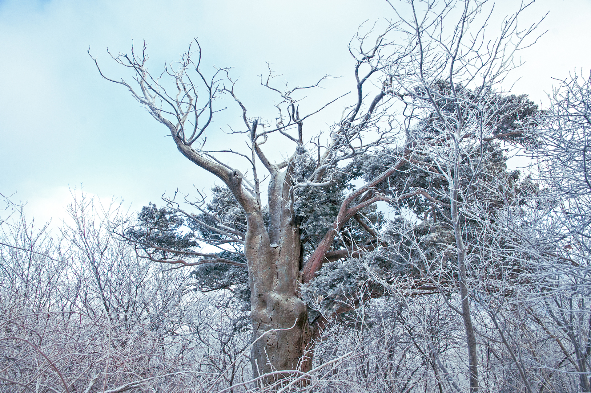 안개와 바람소리가 어울어져 온통 하얗게 얼어붙은 상고대가 혼자보기 아까울 정도다.