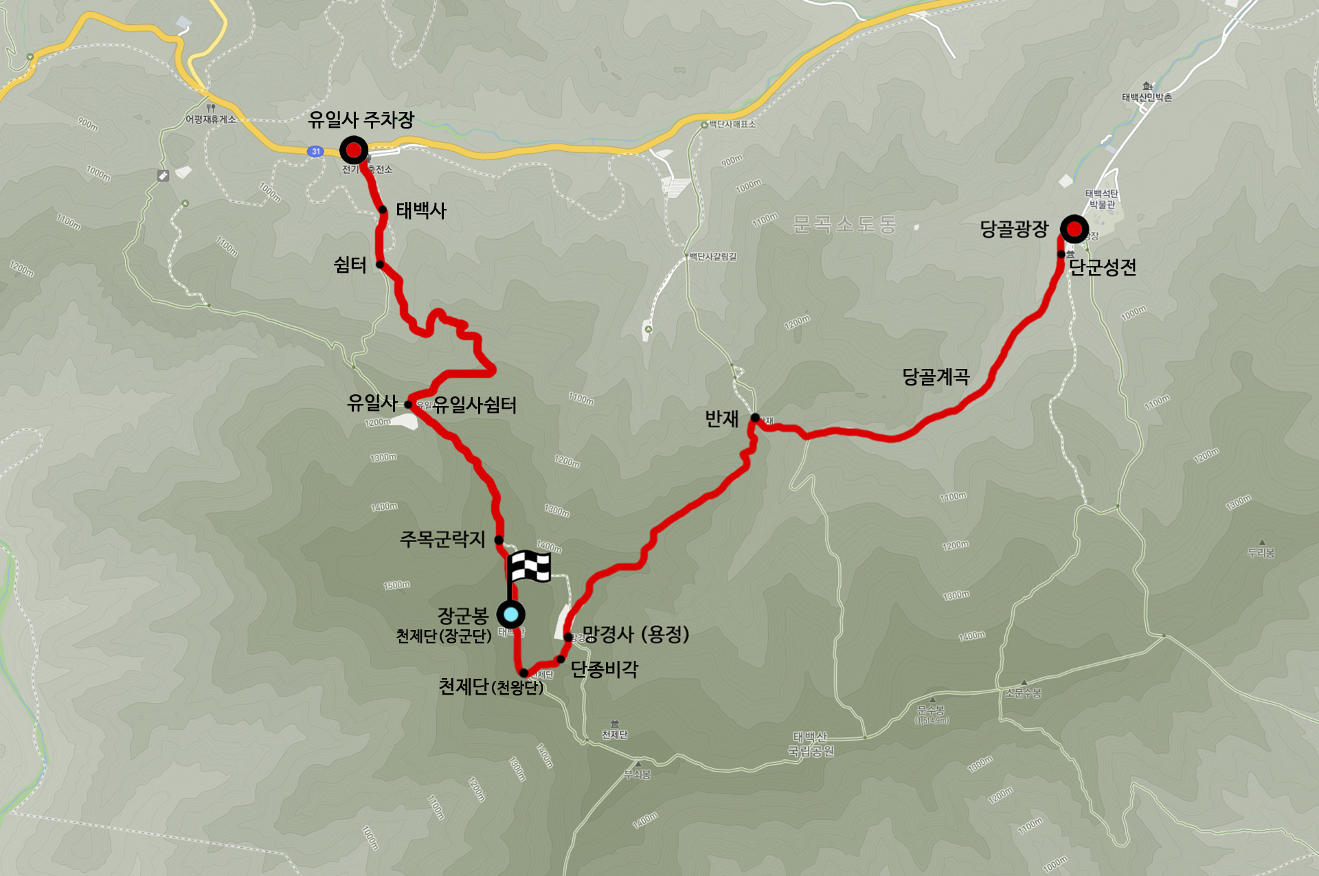 유일사주차장 - 유일사쉼터 - 유일사 - 주목군락지 - 장군봉 - 천제단 - 망경대(용정) - 반재쉼터 - 단군성전 - 당골광장