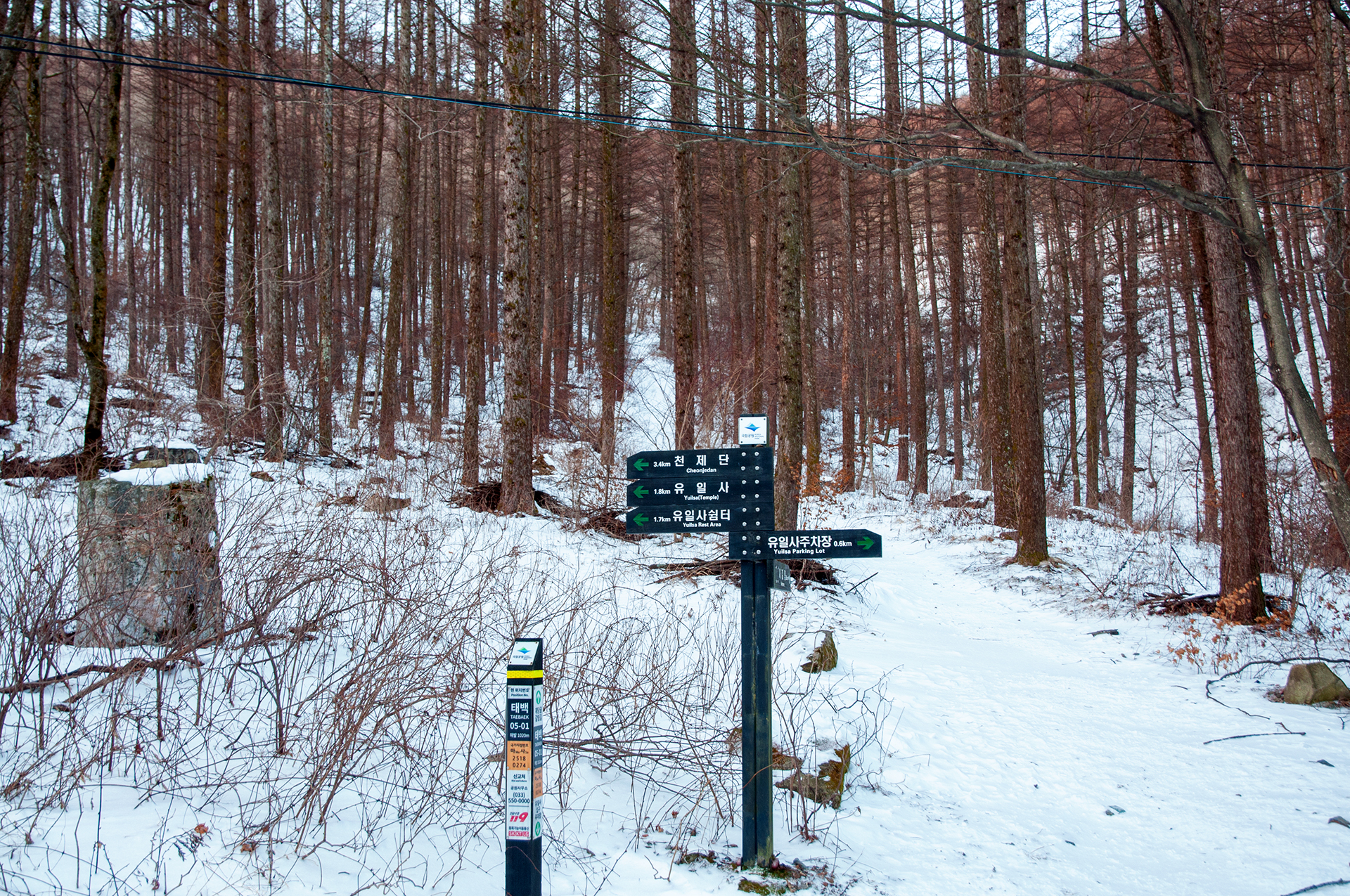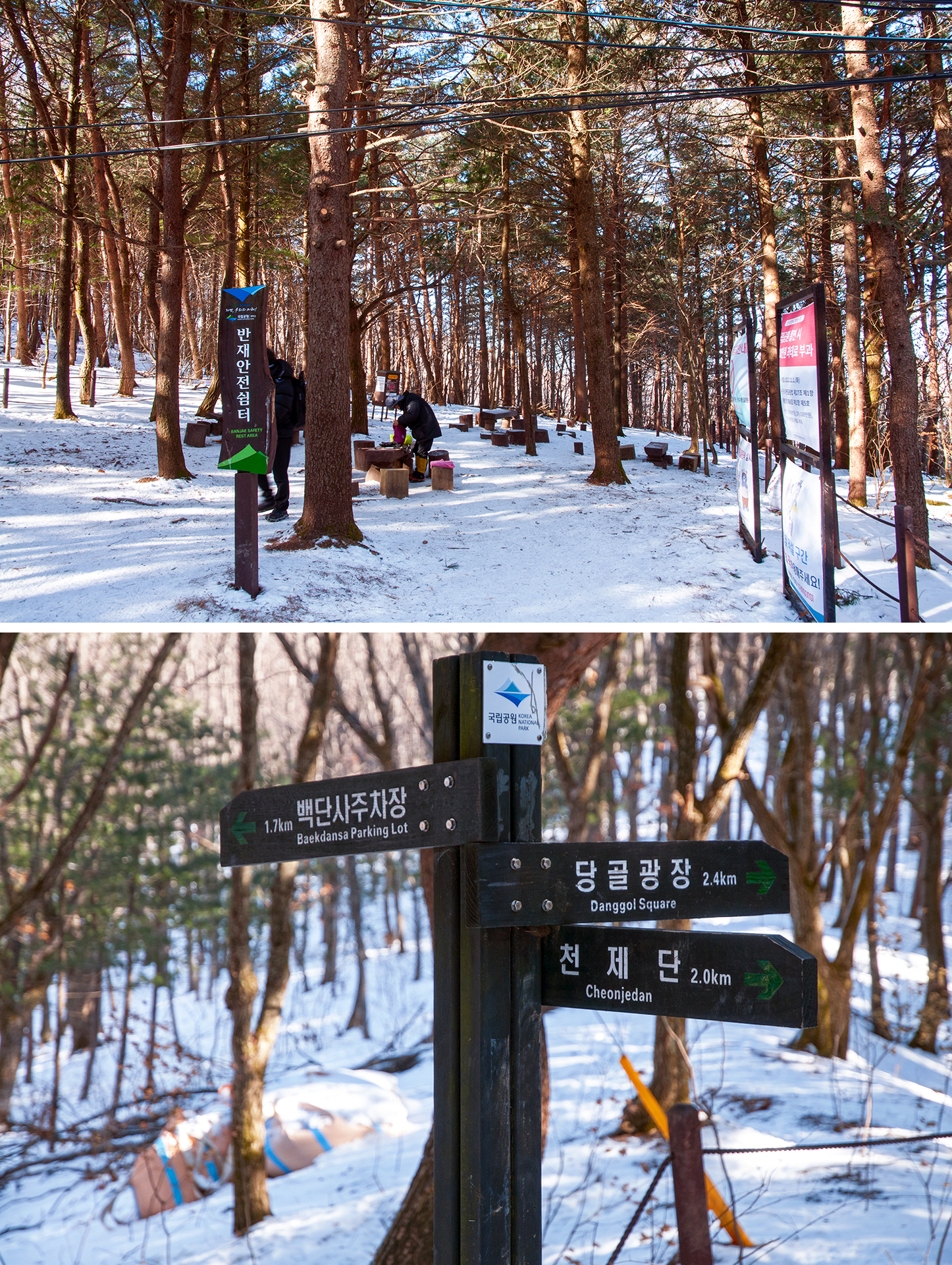백단사주차장과 당골광장으로 가는 길이 갈리는 곳이다. 이제 종점까지 2.4km 남았다.