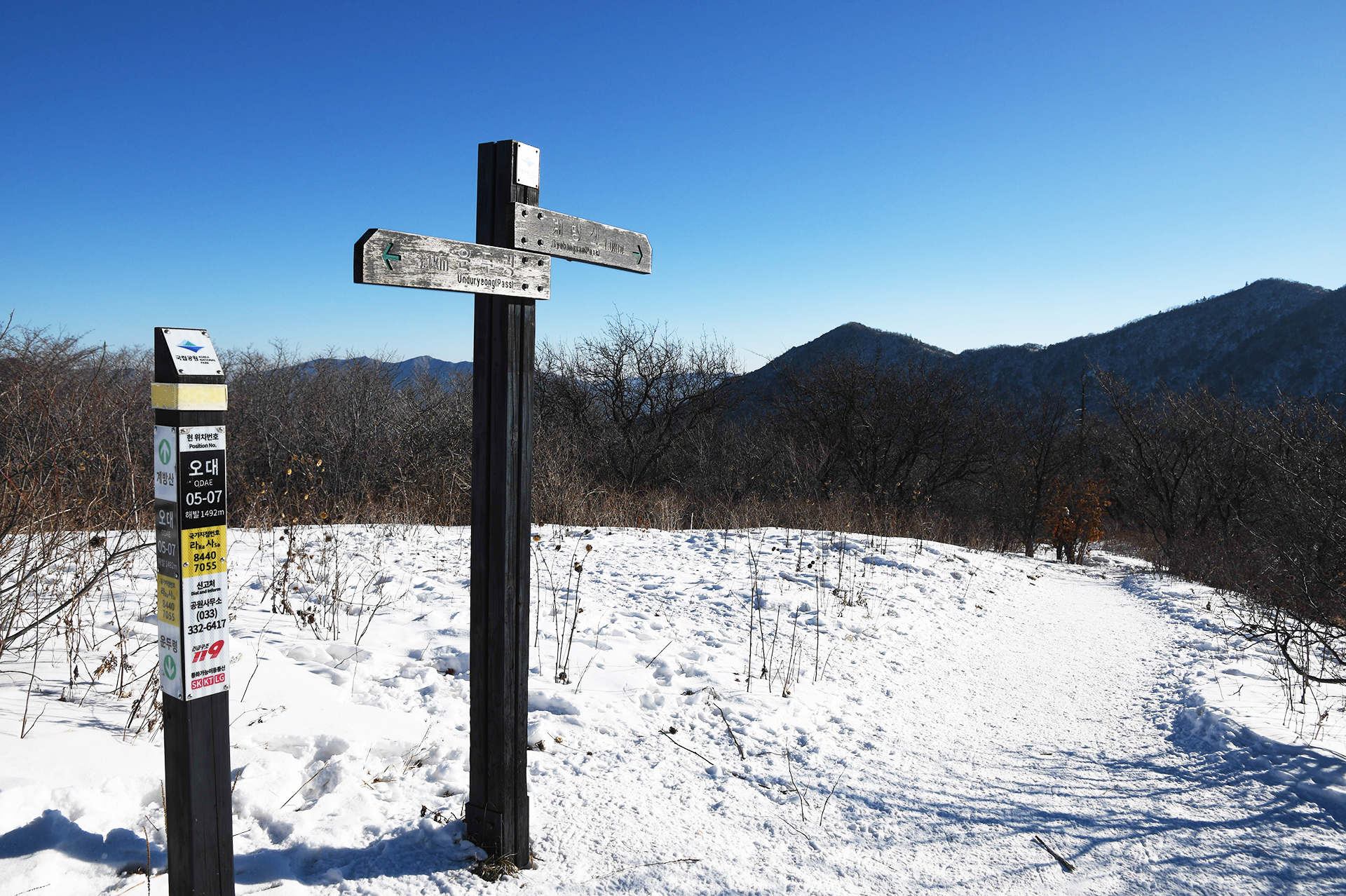 운두령에서 1km 진행한 지점에서 첫 이정표를 만난다.