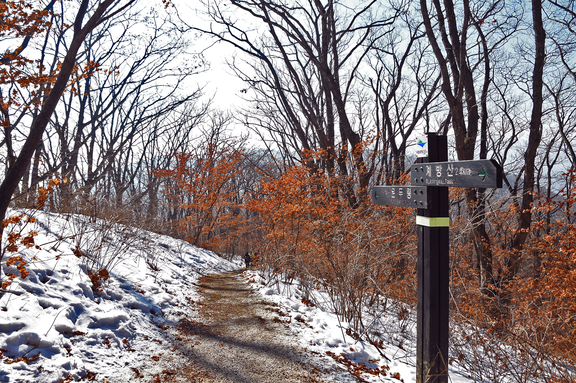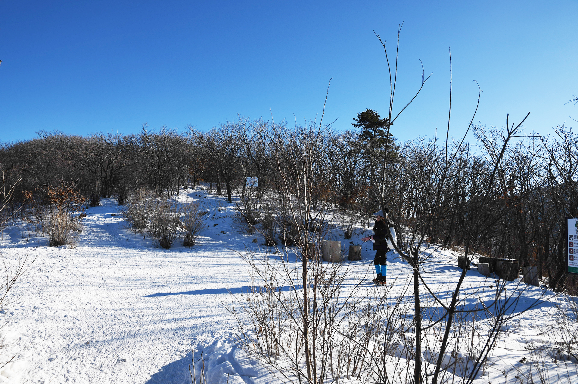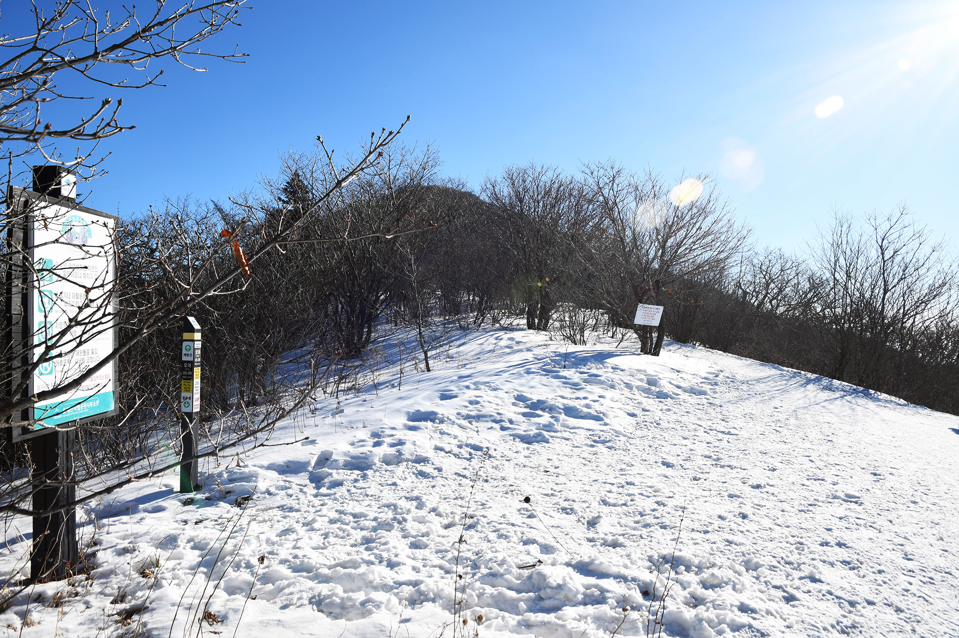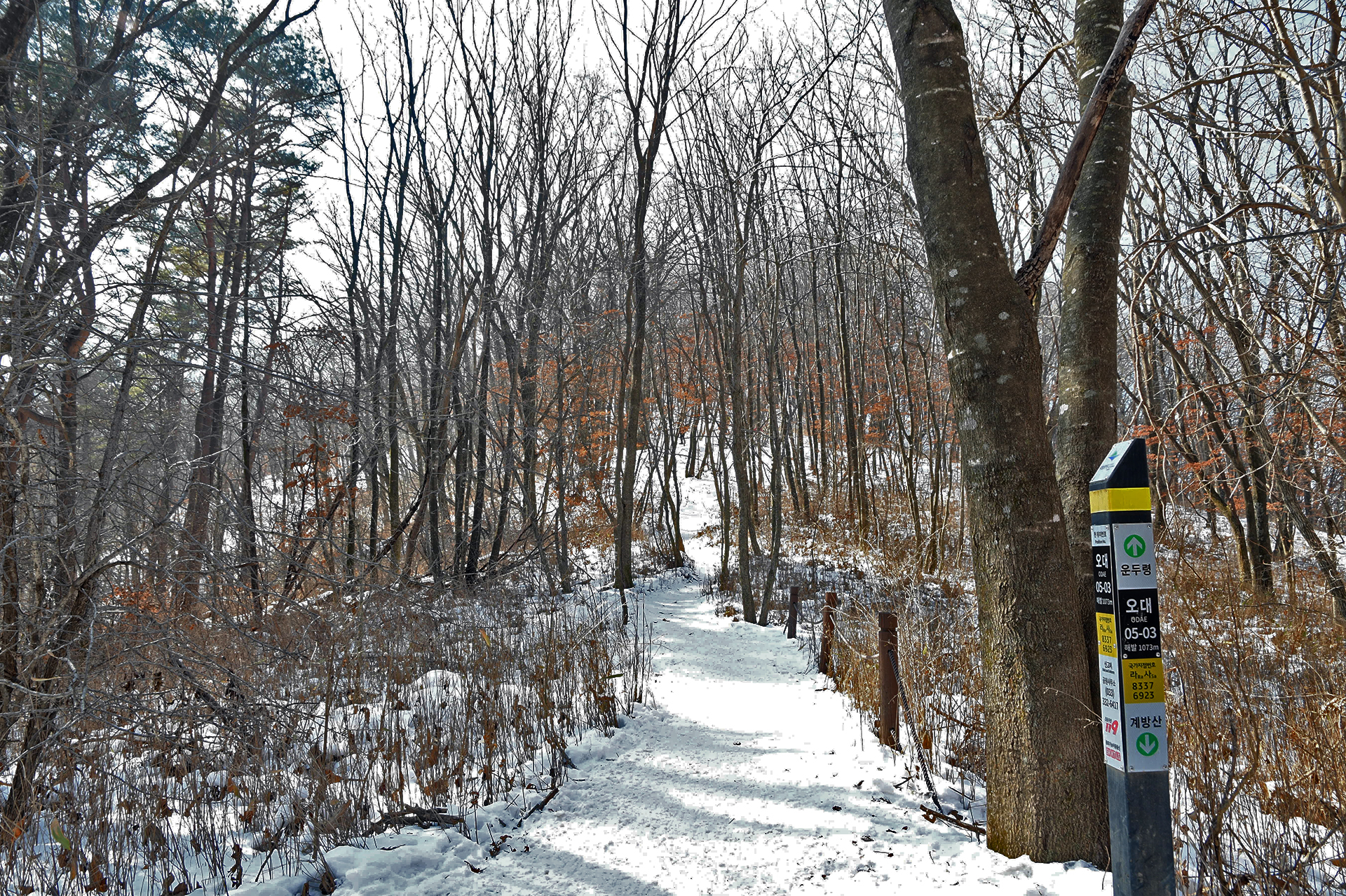 여전히 전망이 트이지 않는 등산로가 계속되고, 눈은 얼음처럼 단단해 밟을때마다 빠스락거린다.