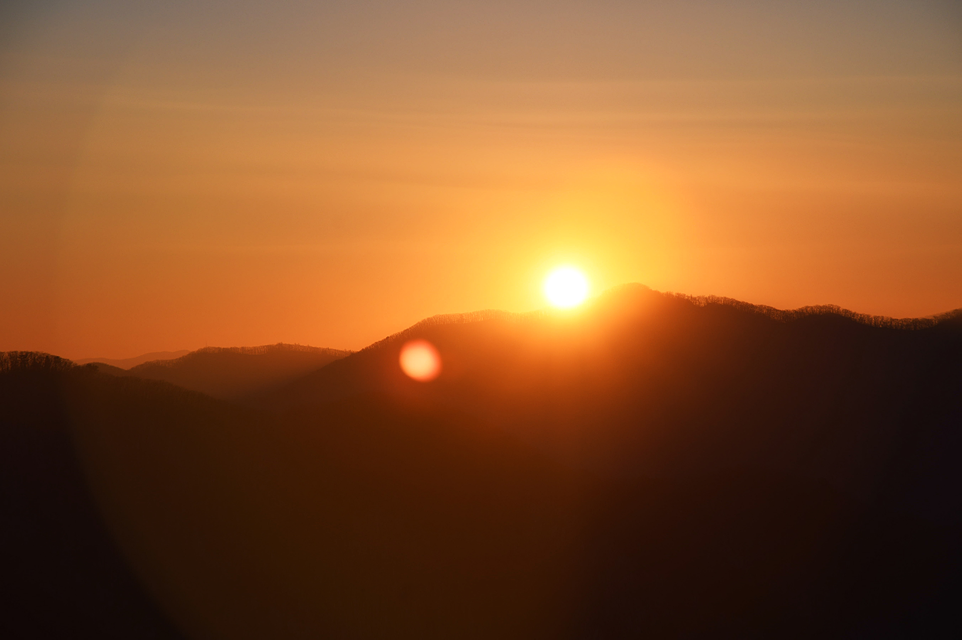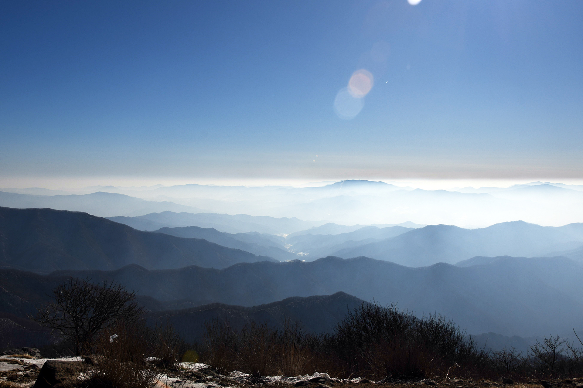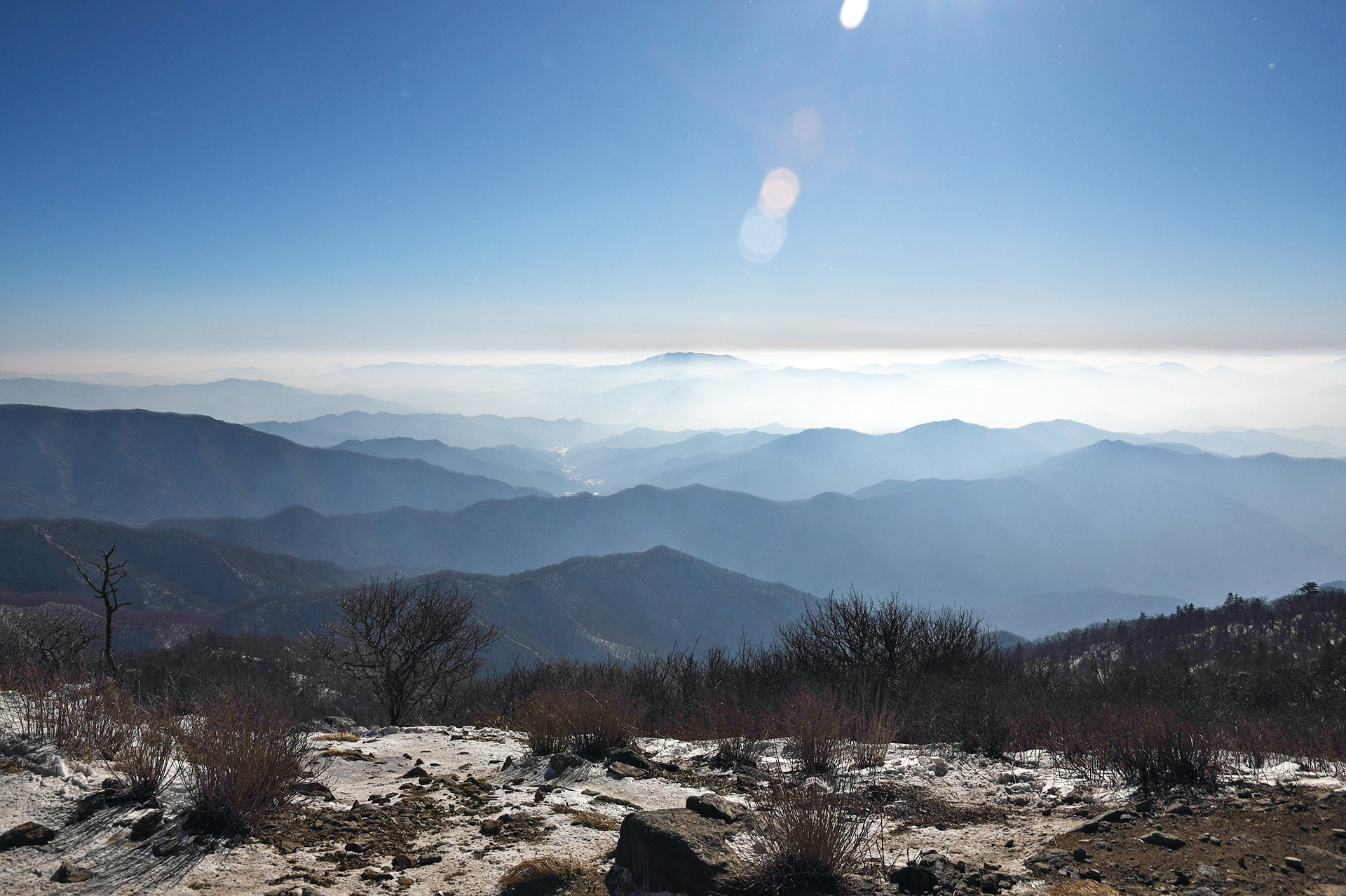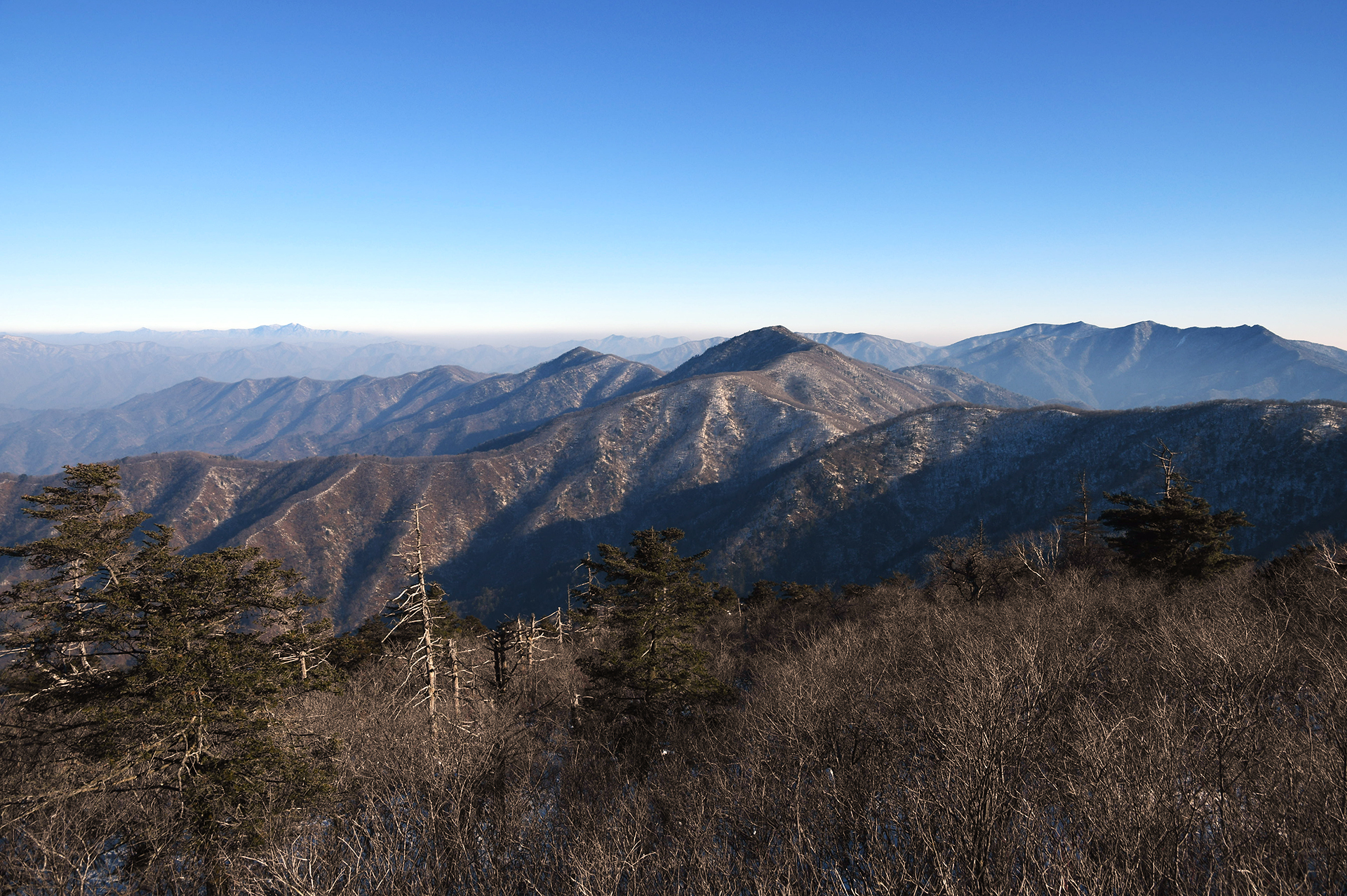 하늘의 그라데이션 아래 첩첩이 이어지는 백두대간의 모습,