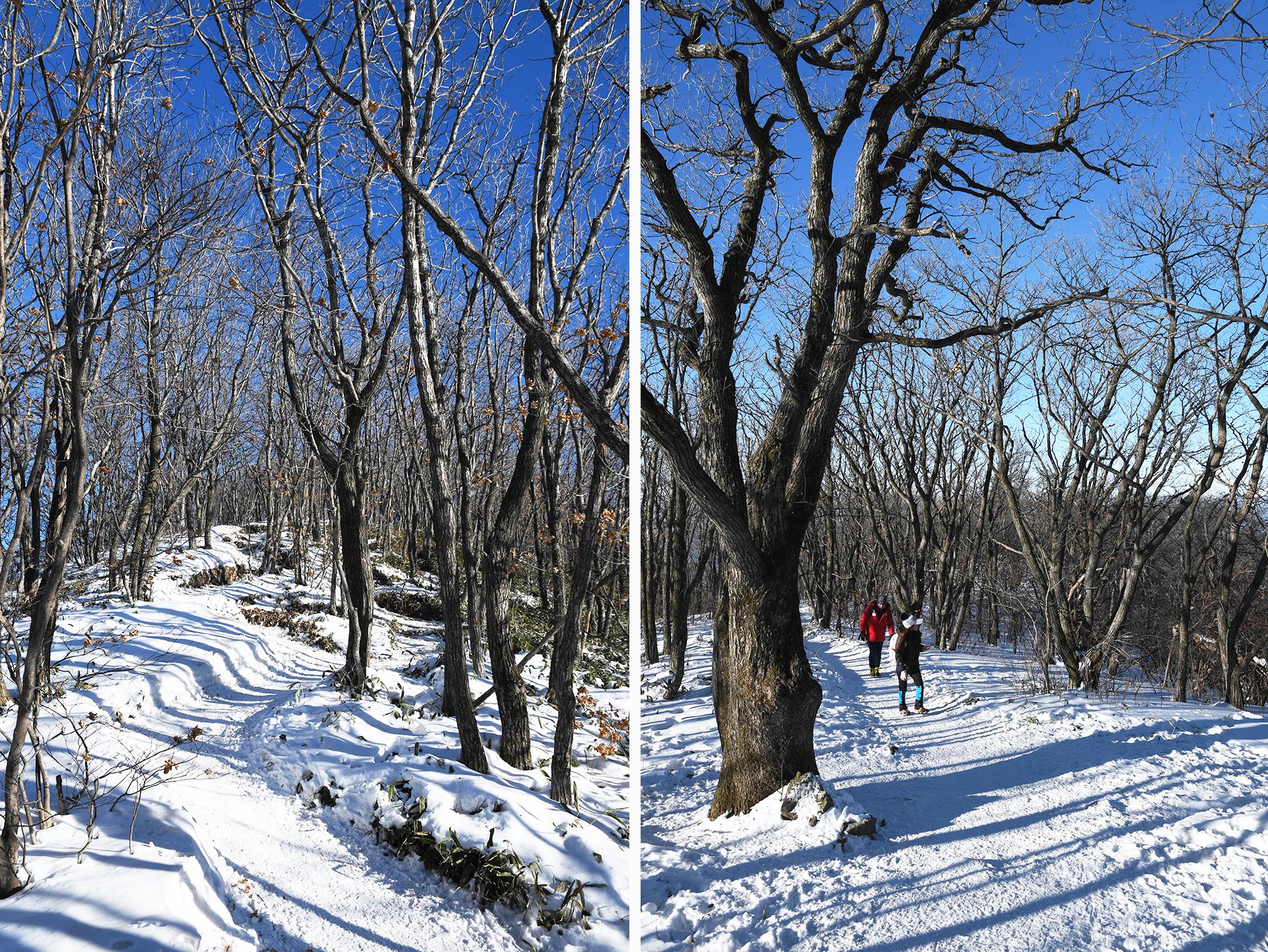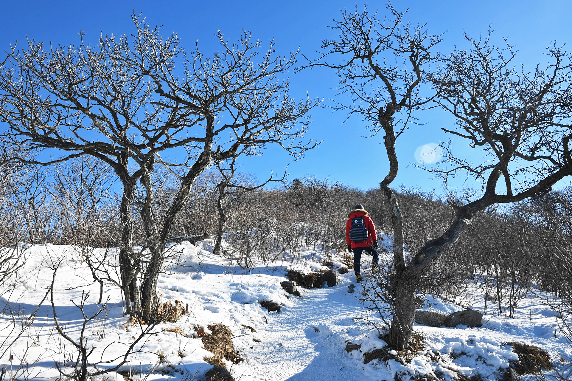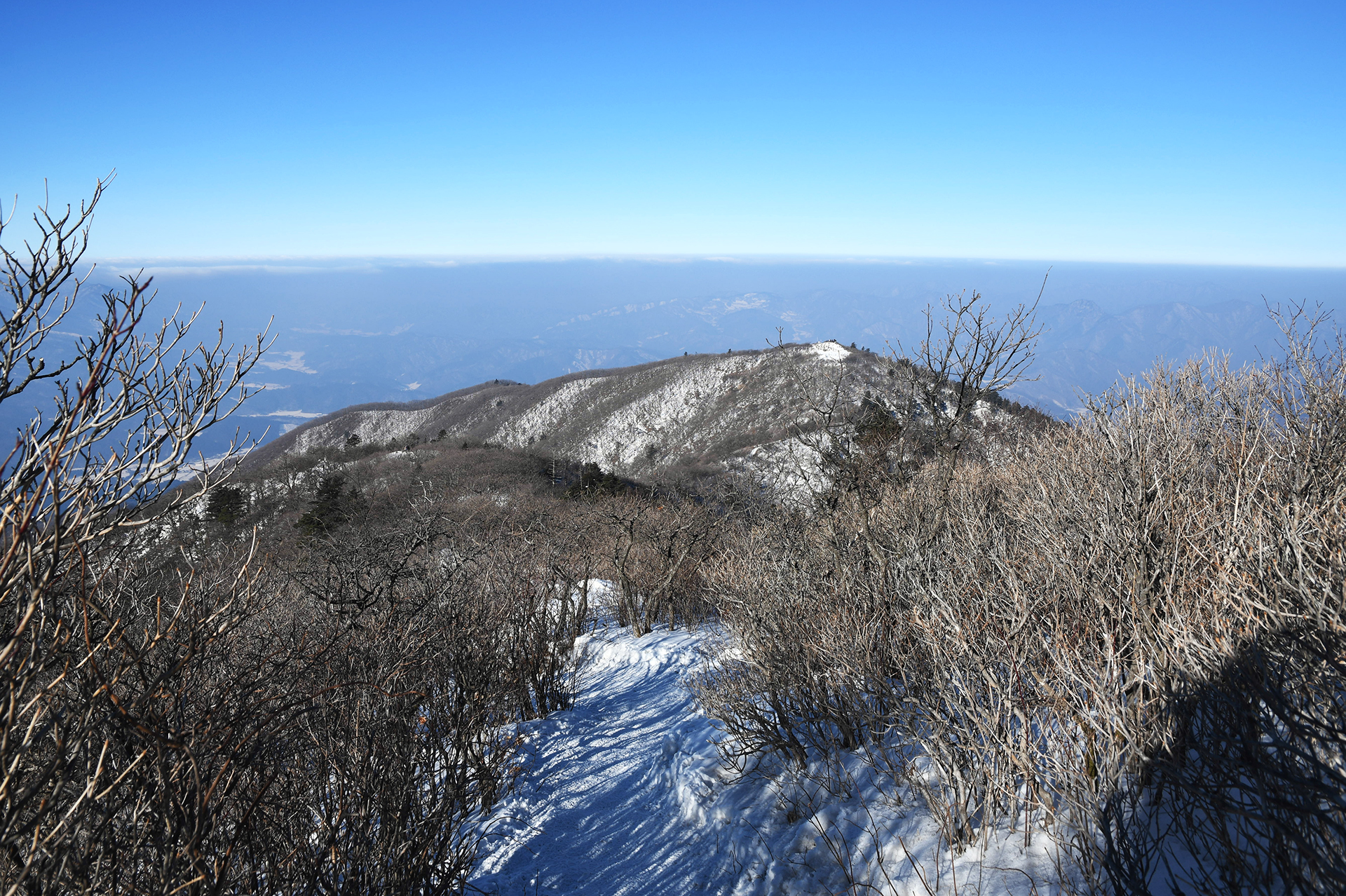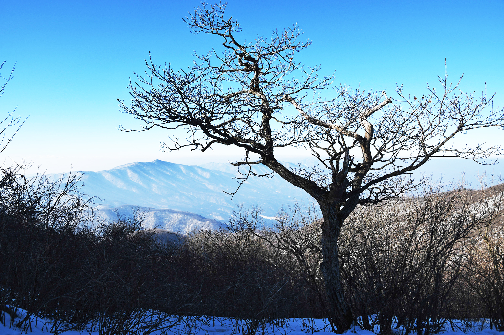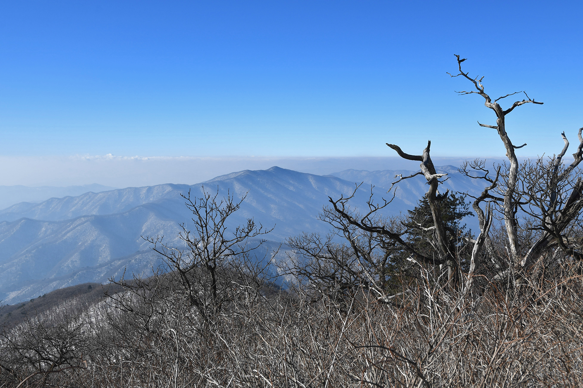 계방산 정상으로 갈수록 서어나무처럼 이리저리 제멋대로 휘어진 가지가 한결같은 풍경을 보여준다.