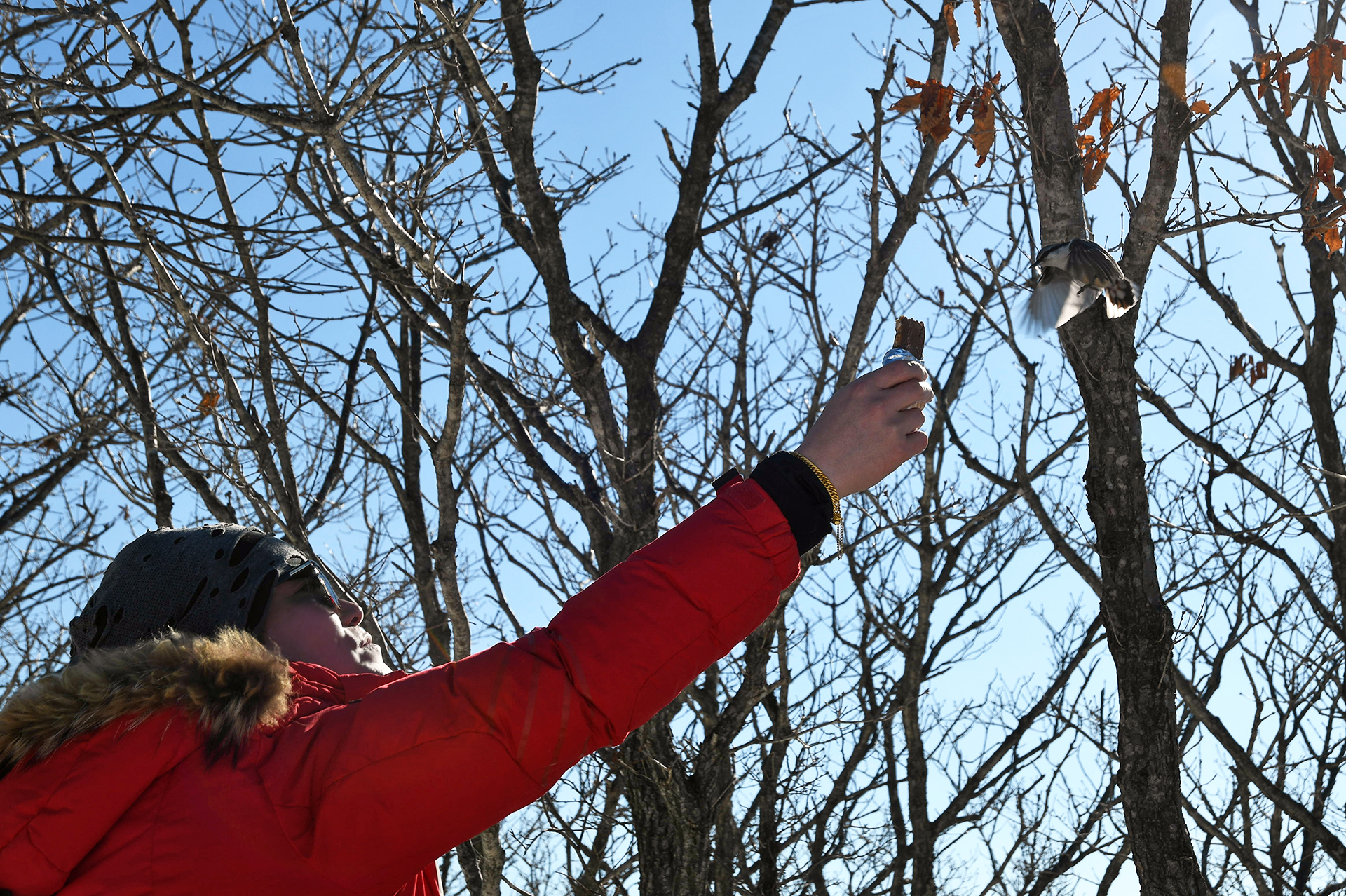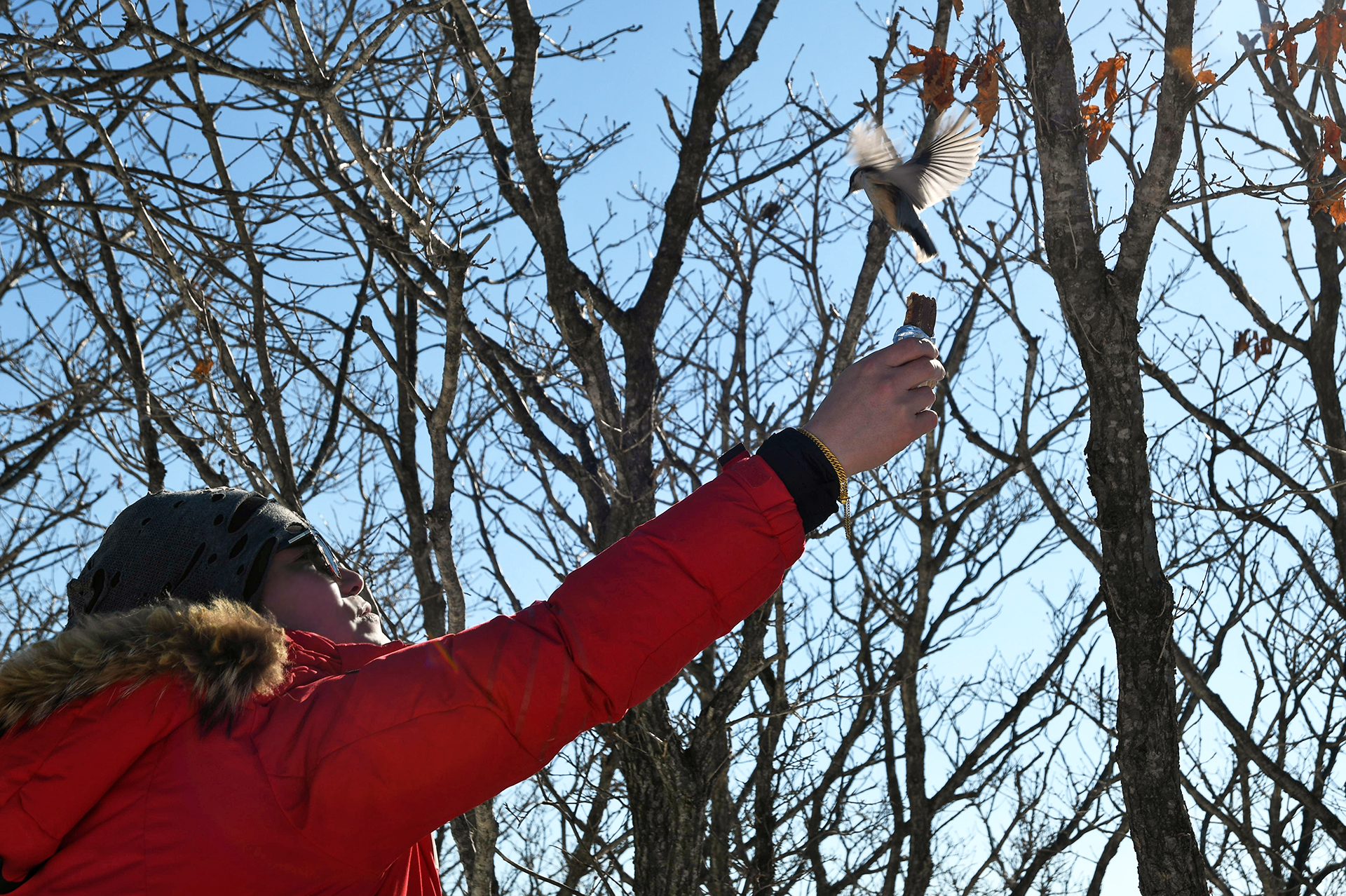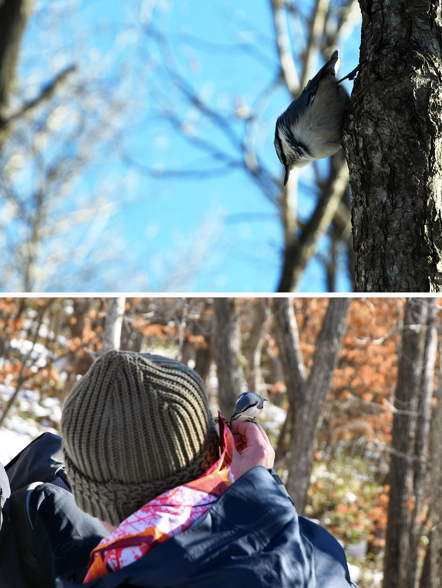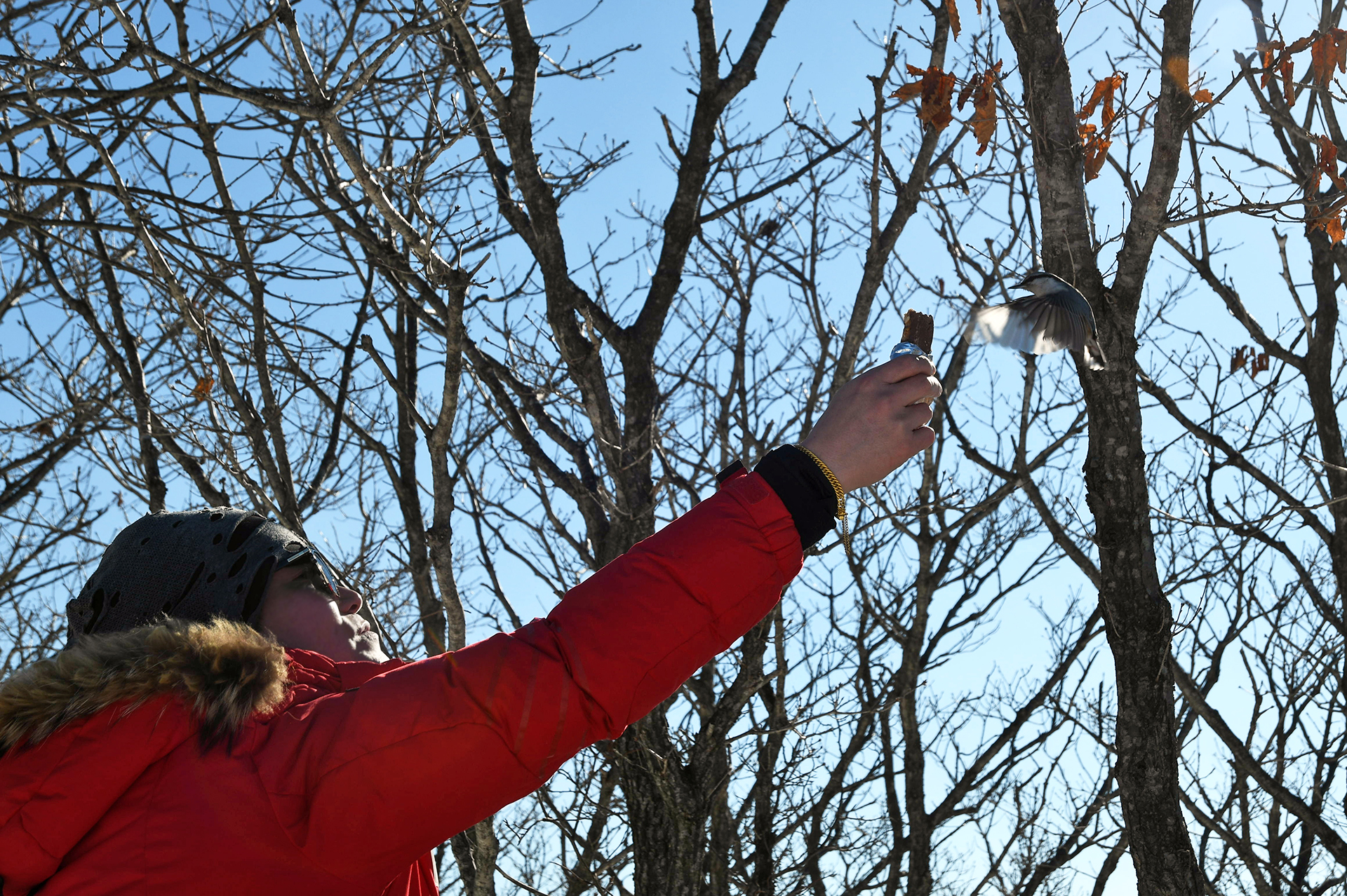 동고비 한마리가 익숙한듯 등산객이 내민 에너지바를 쪼아먹고 있는 신기한 상황~!!