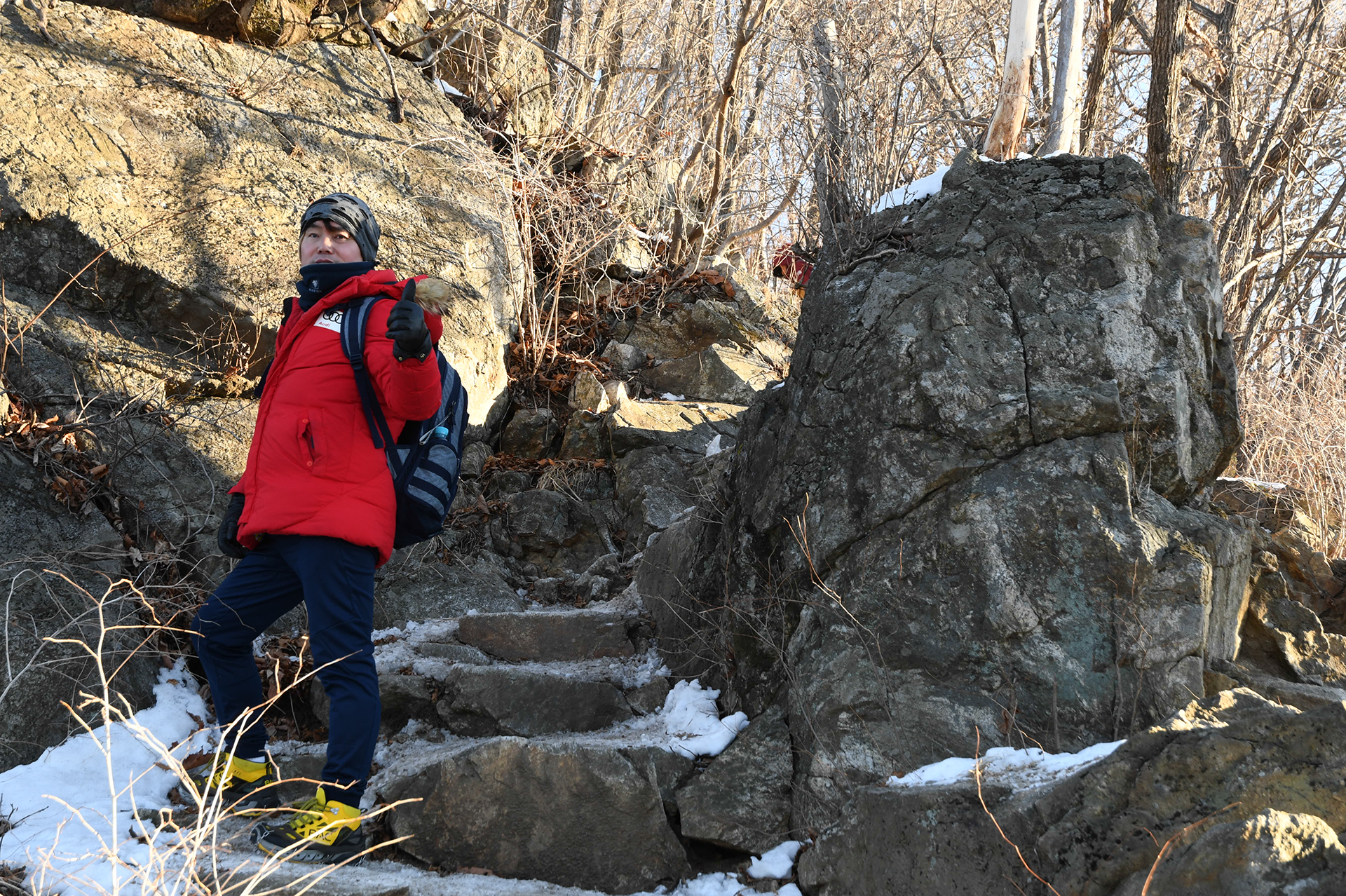쉼터를 출발하면서부터 어려운 코스가 이어지는데 뒤로 쳐지는 대장이 아무렇지도 않은척 엄지척을 하고 있다.