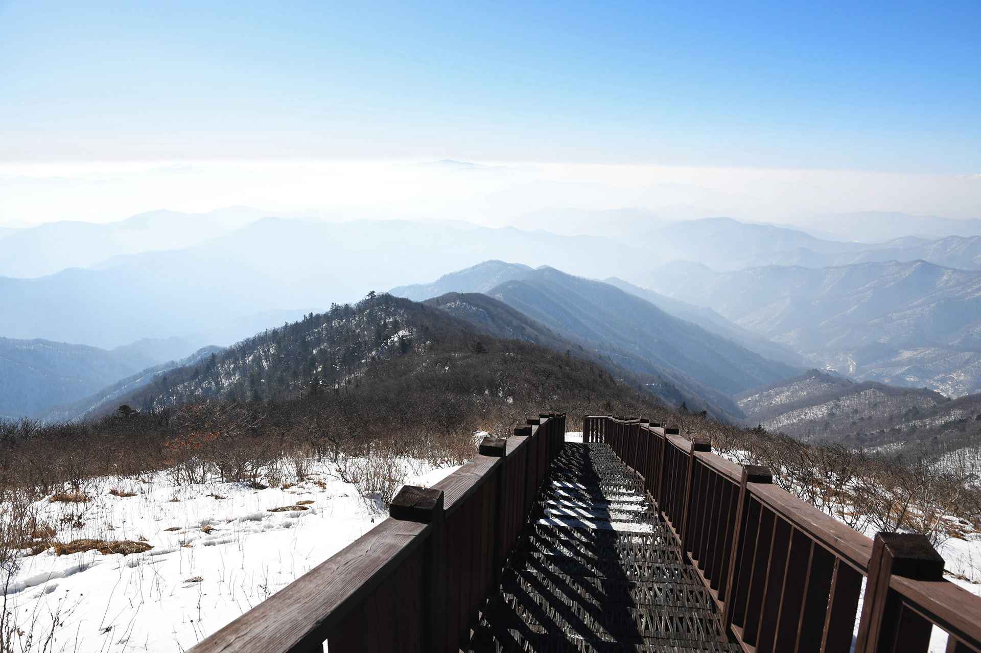 전망대까지는 나무가 시야를 가리다보니 주변 풍경을 시원하게 조망할수 없지만 근래에 보기 드물게 하늘은 구름 한점 없이 청명한 하늘이다.