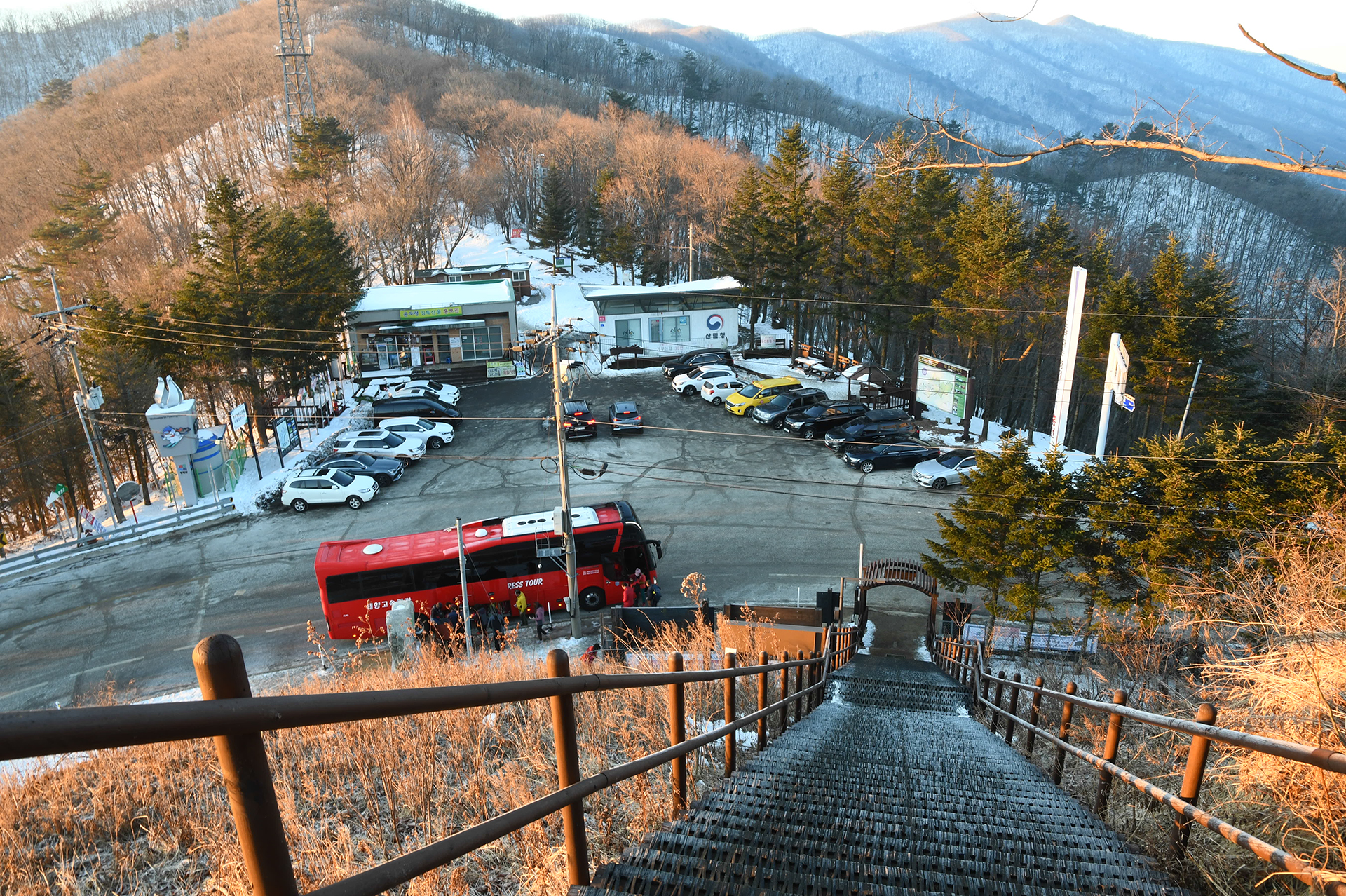 계단을 올라 뒤돌아본 운두령 주차장의 모습, 운두령 임특산물 홍보관 뒷쪽에 화장실이 있다.