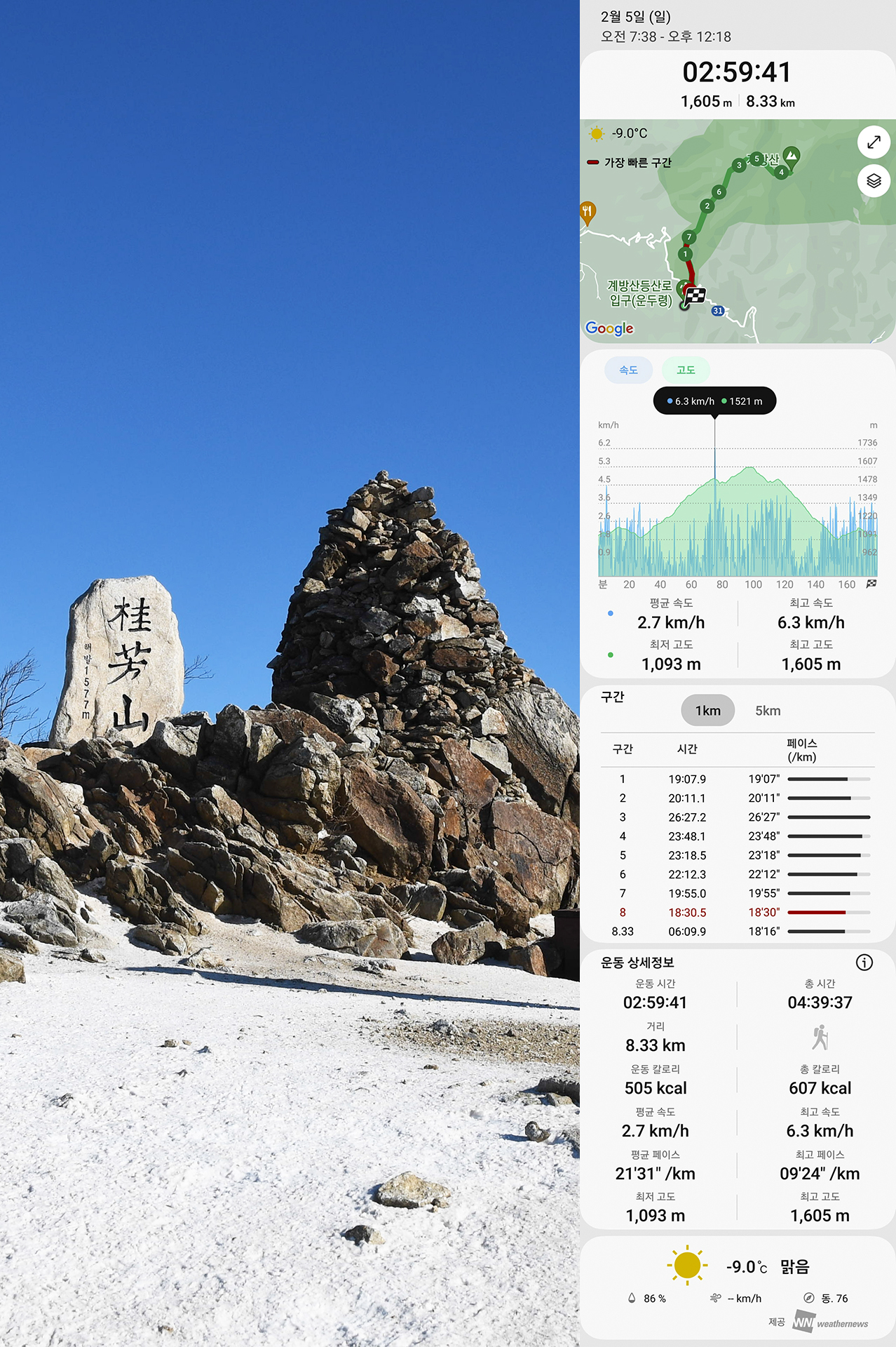 왕복 4시간39분 소요 (정상에서 머문시간, 쉼터에서 식사시간 포함)