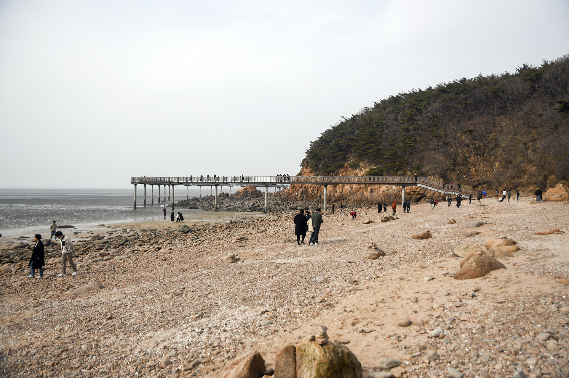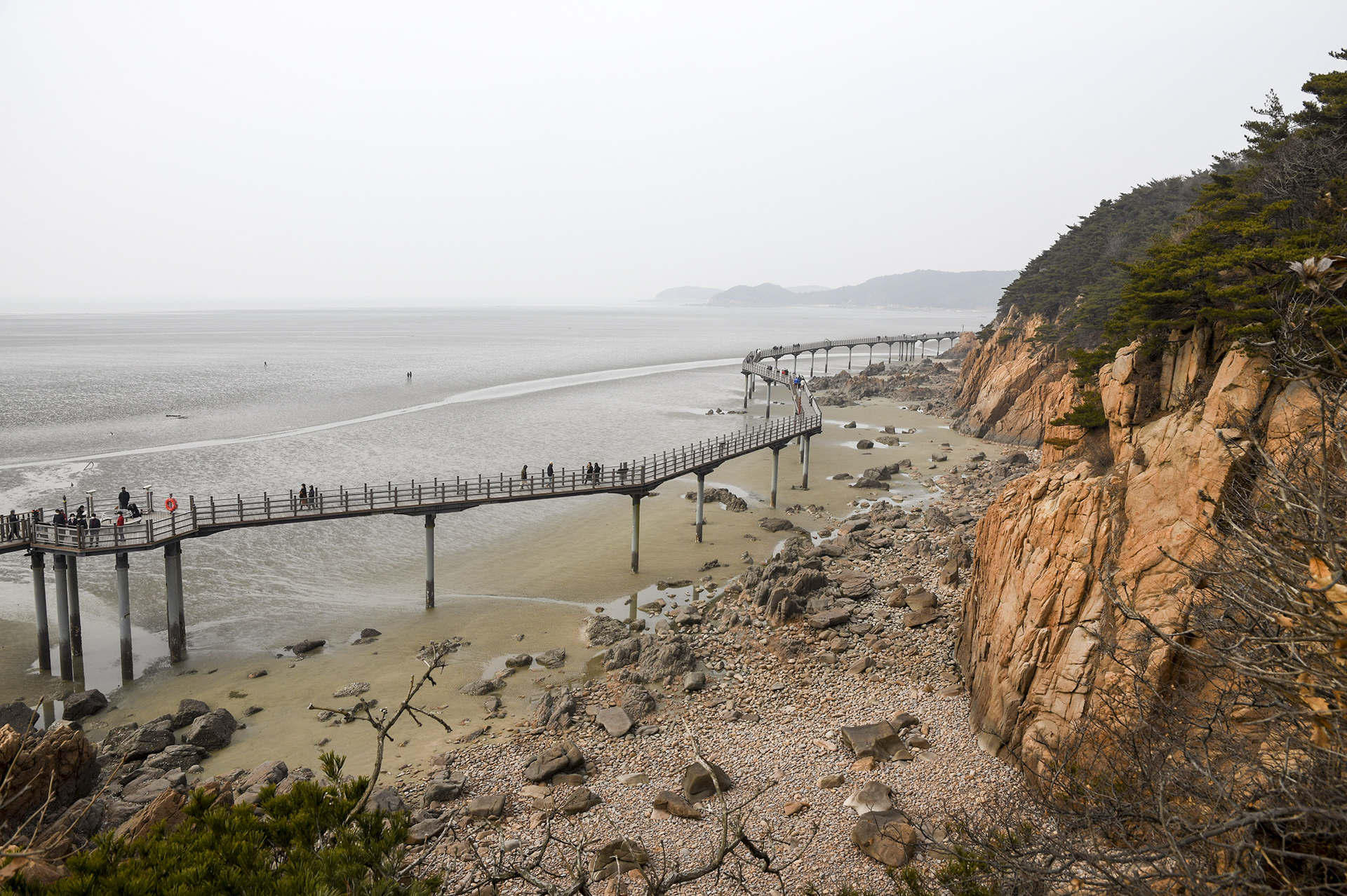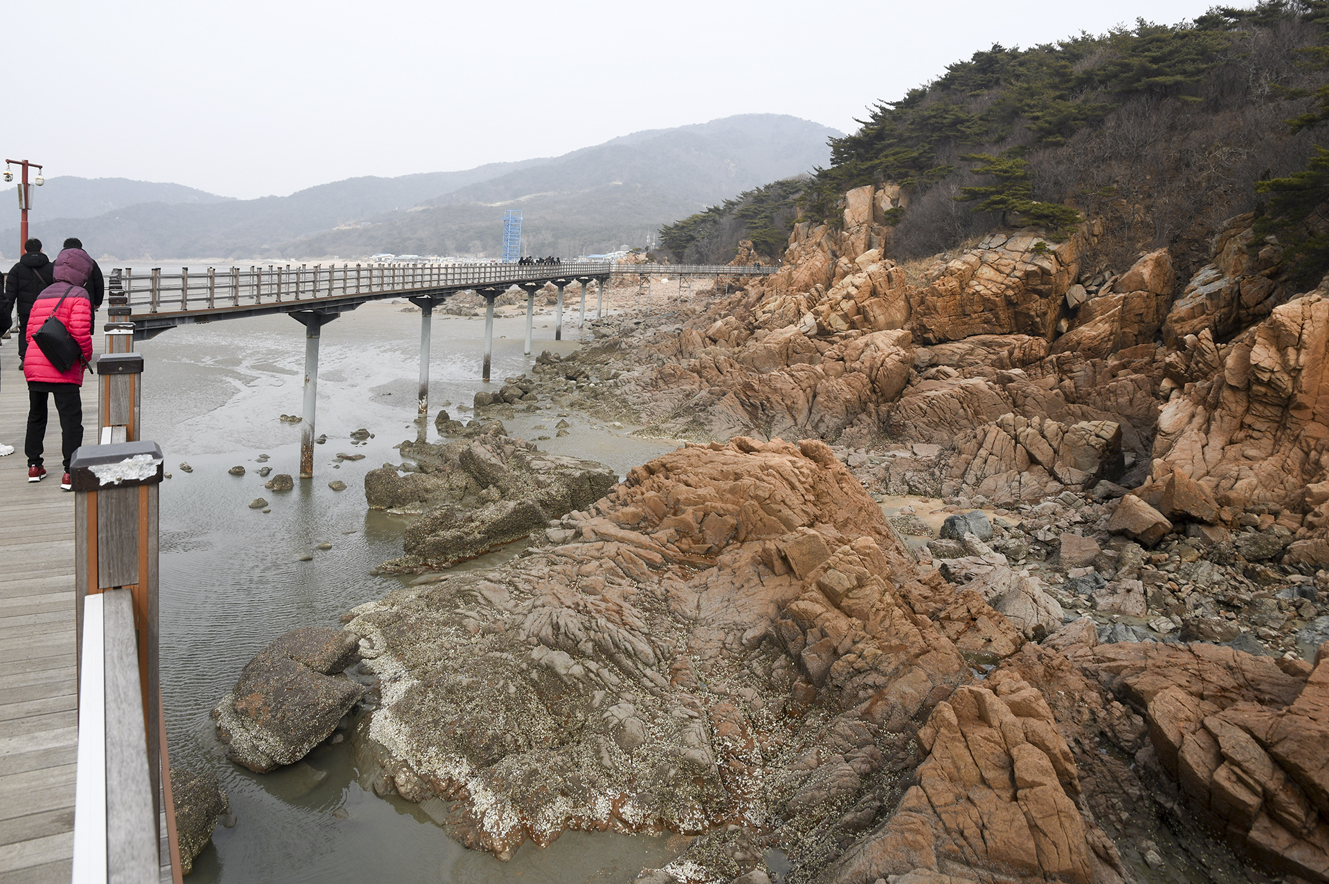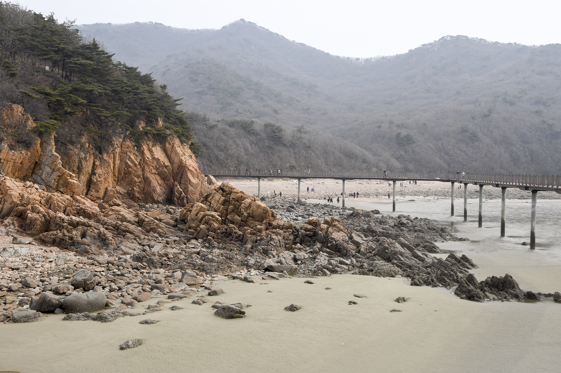 물 빠진 해수욕장에는 드넓은 모래뻘이 펼쳐져 있지만 계절이 계절인지라 방문하는 사람들 대부분이 갯벌보다는 탐방로를 걷고 있었다.