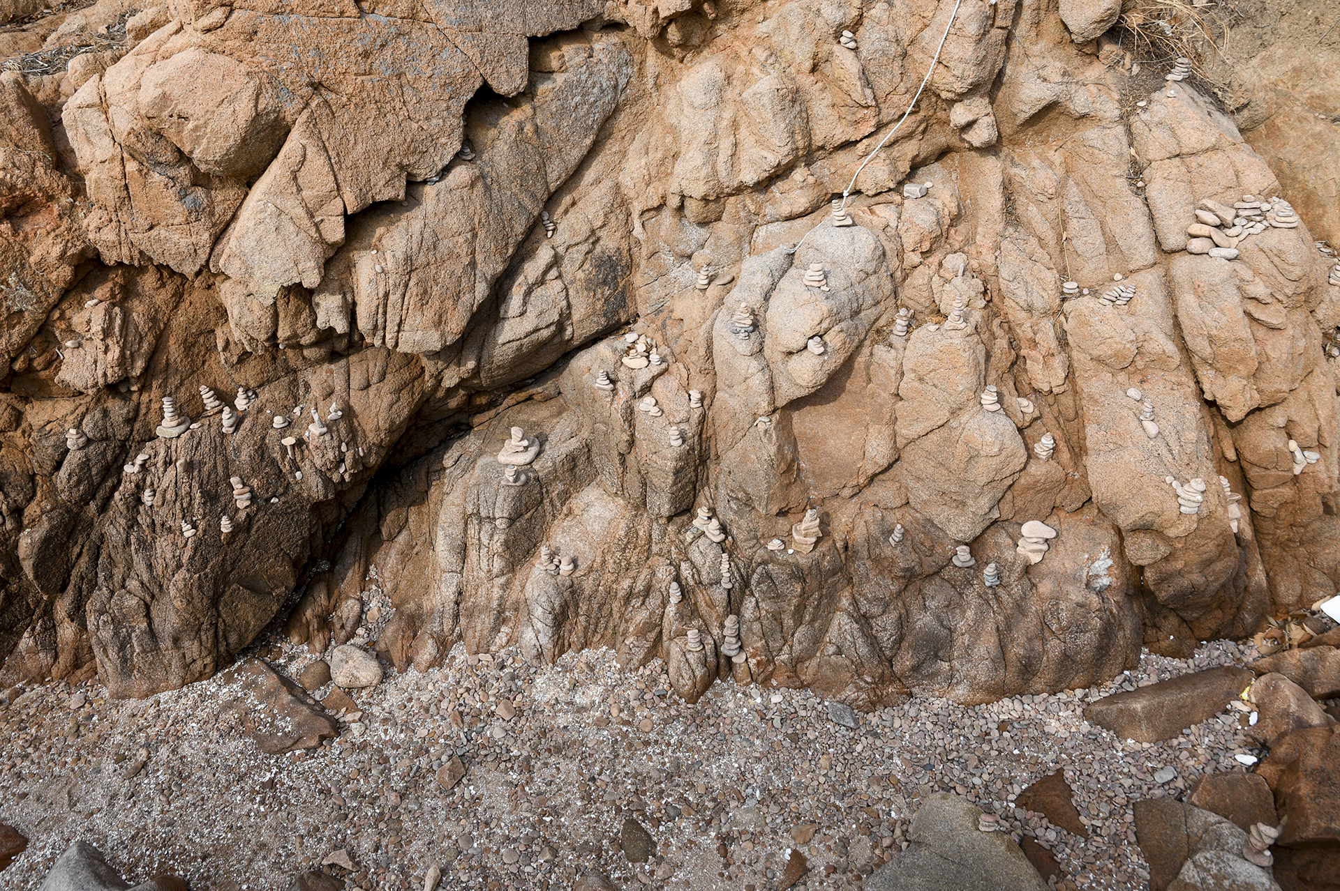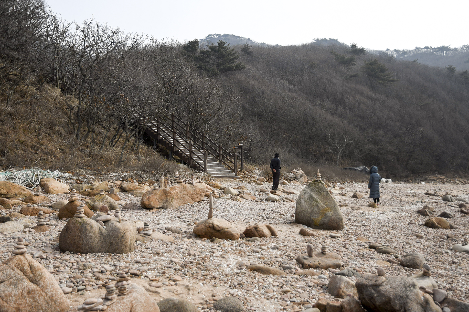 바위마다 작은 돌탑들이 여기저기 세워져 있고, 하나개해수욕장으로 돌아가는 호룡곡산 숲길이 계단으로 열려 있다.