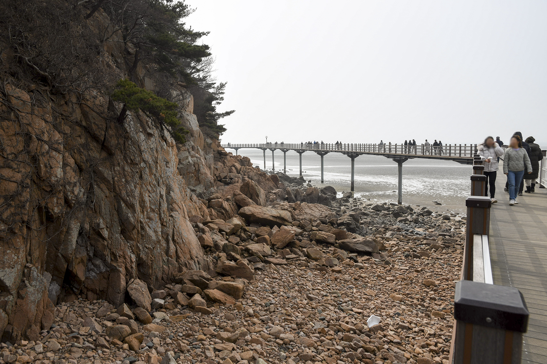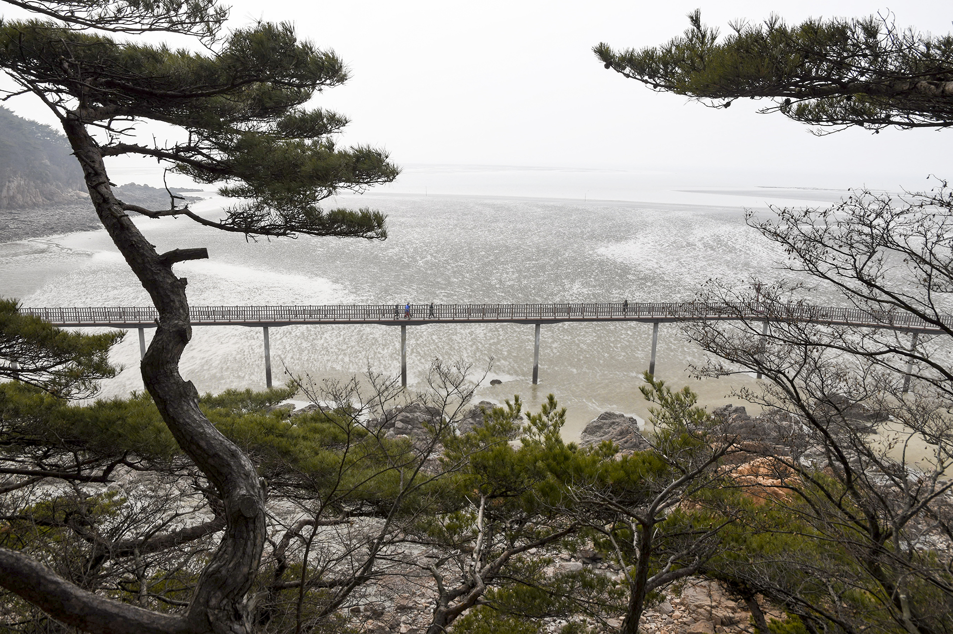 해변 좌측에 해상탐방로가 바다 위로 높게 지나가는 모습이 보인다.
